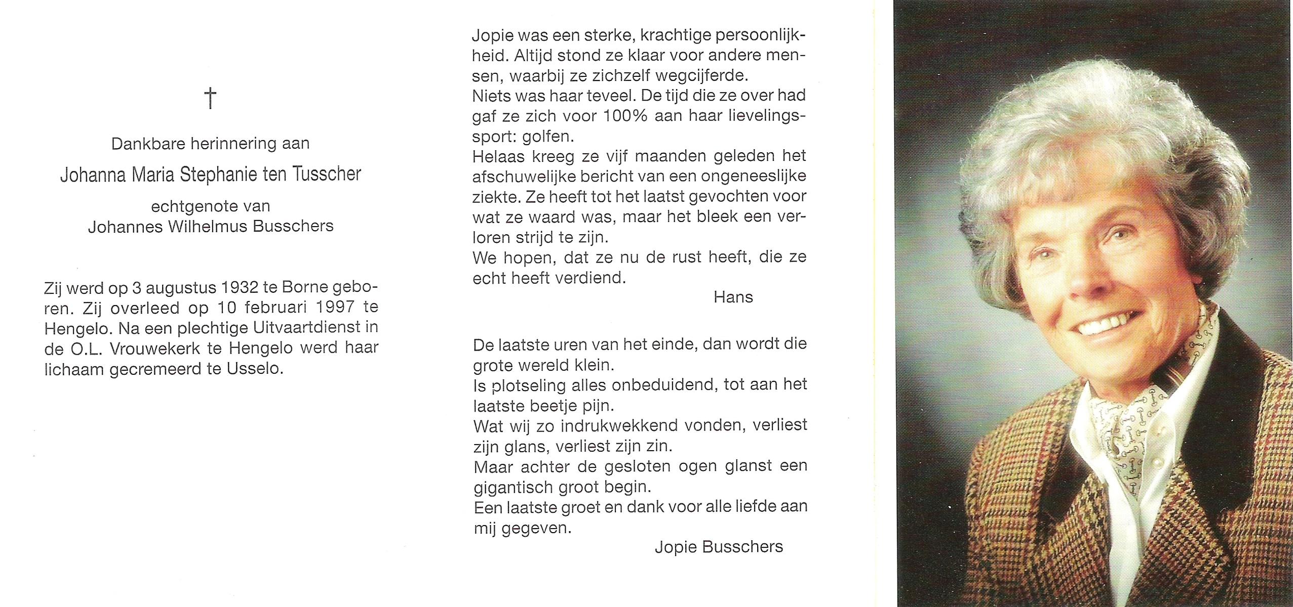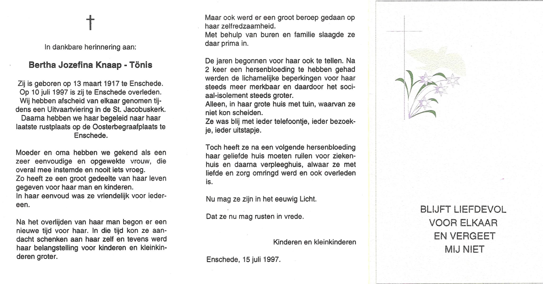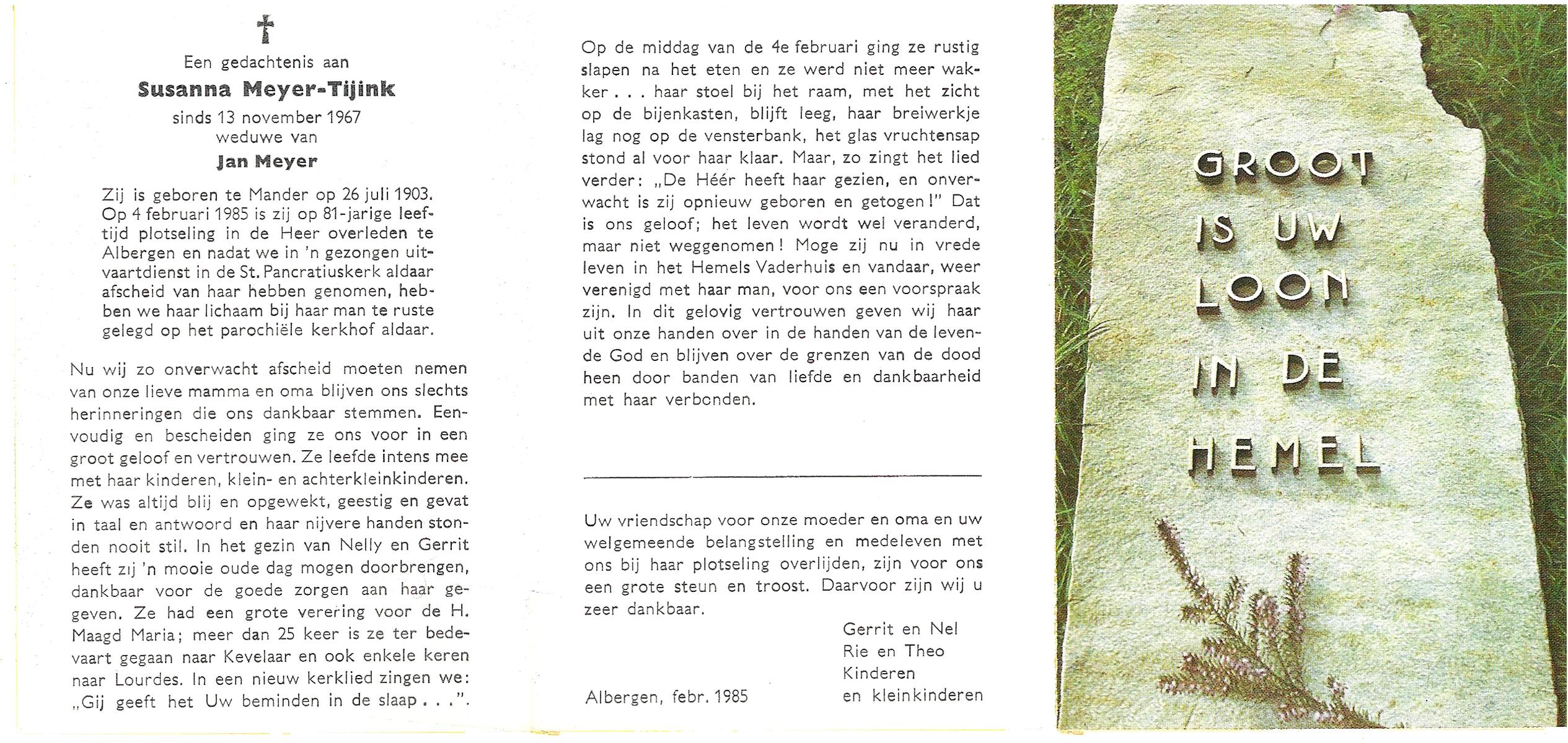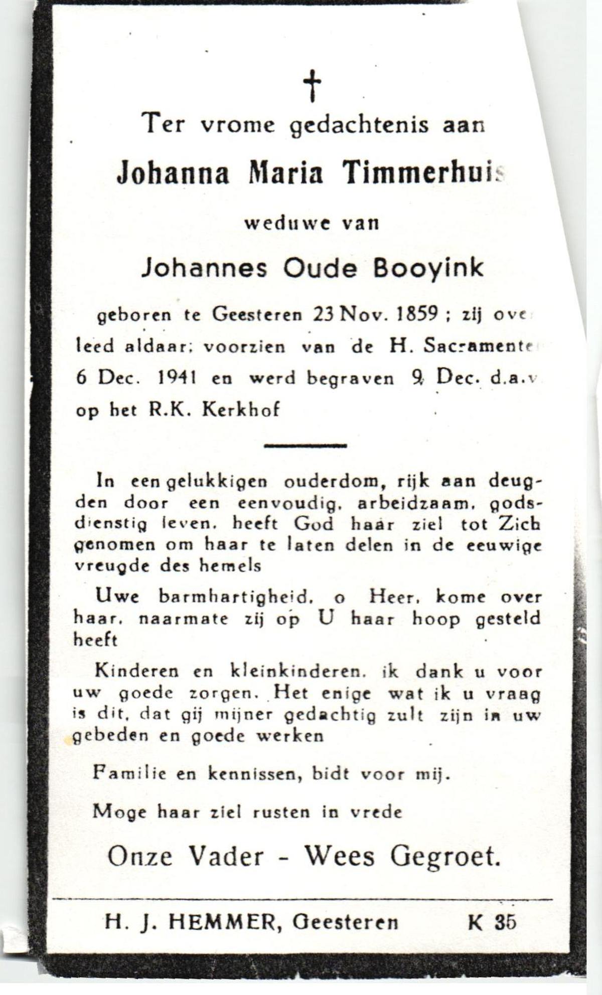 TIJHUIS, Johanna Maria, geboren op 14-4-1925 te Saasveld, overleden op 4-5-1998 te Almelo, ziekenhuis op 73-jarige leeftijd, begraven op 8-5-1998 te Borne.