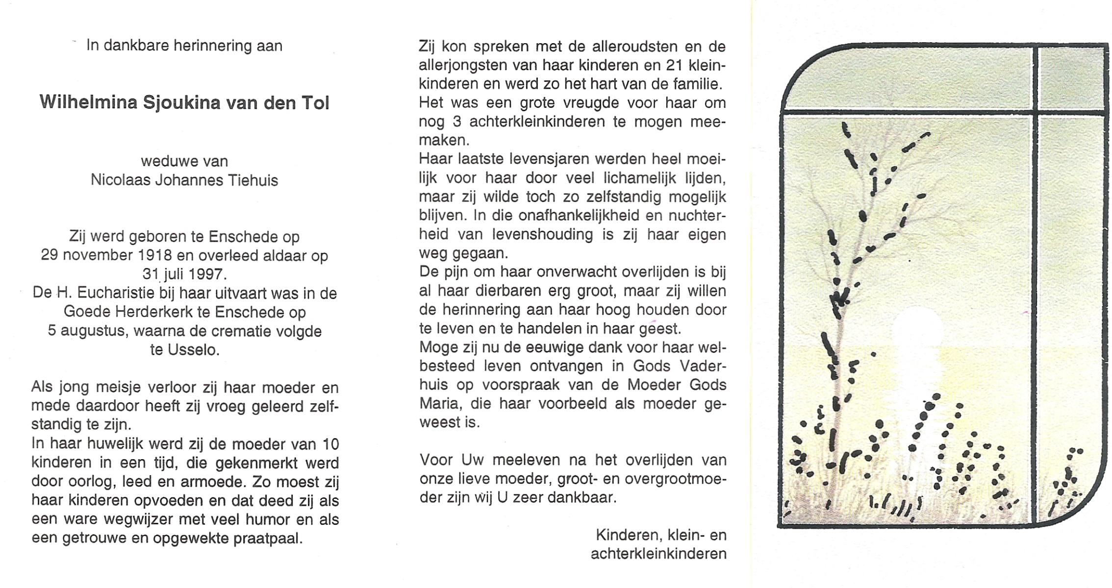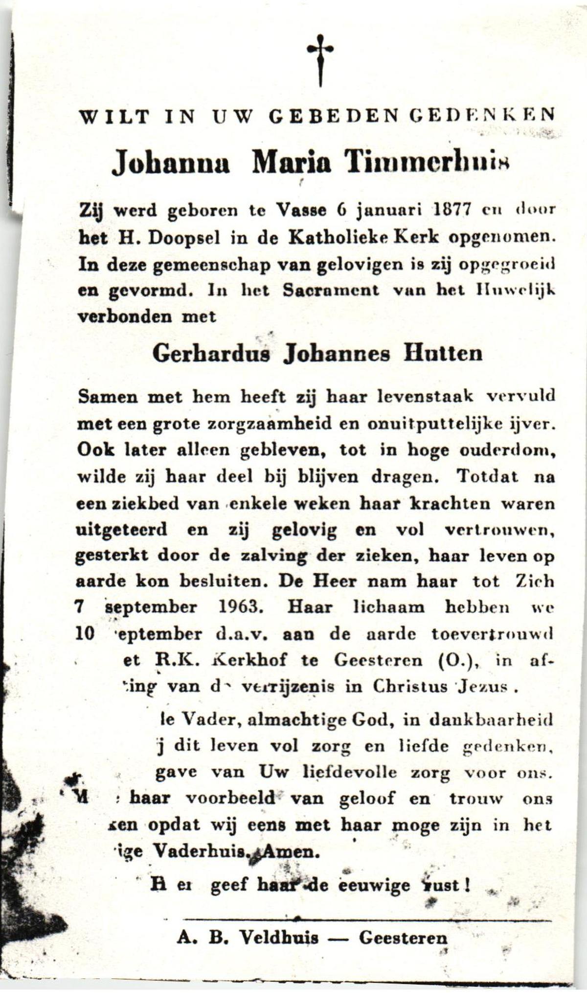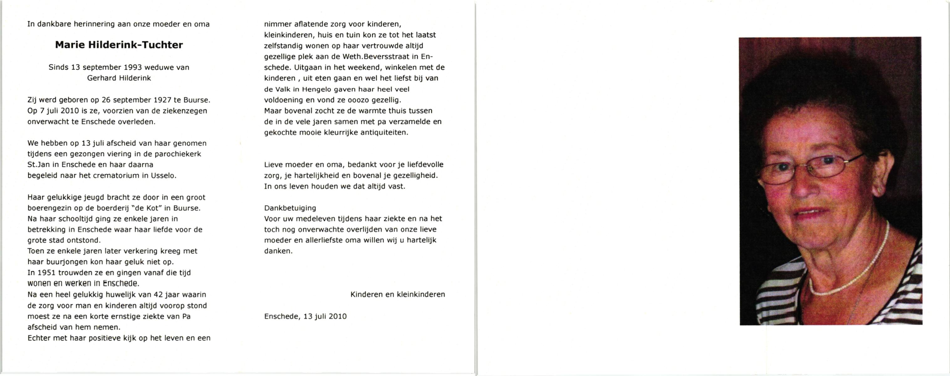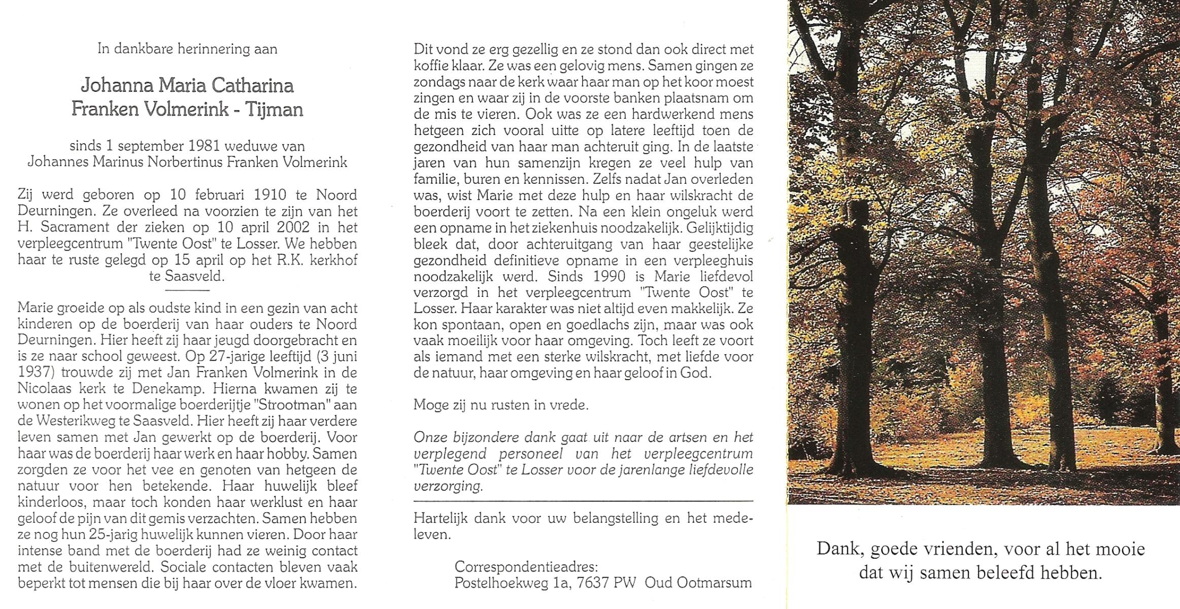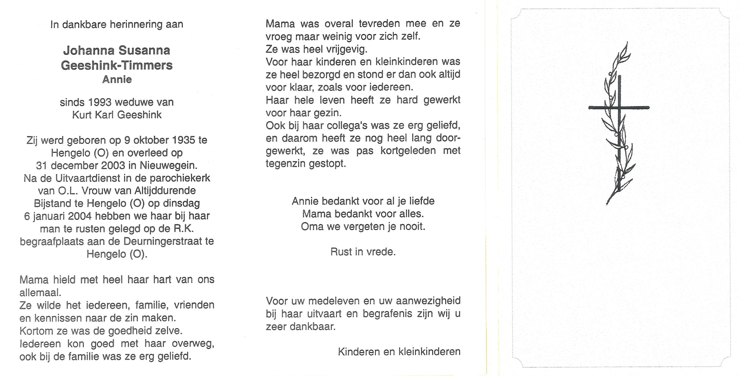 TIJHUIS, Johanna Maria, geboren op 14-4-1925 te Saasveld, overleden op 4-5-1998 te Almelo, ziekenhuis op 73-jarige leeftijd, begraven op 8-5-1998 te Borne.