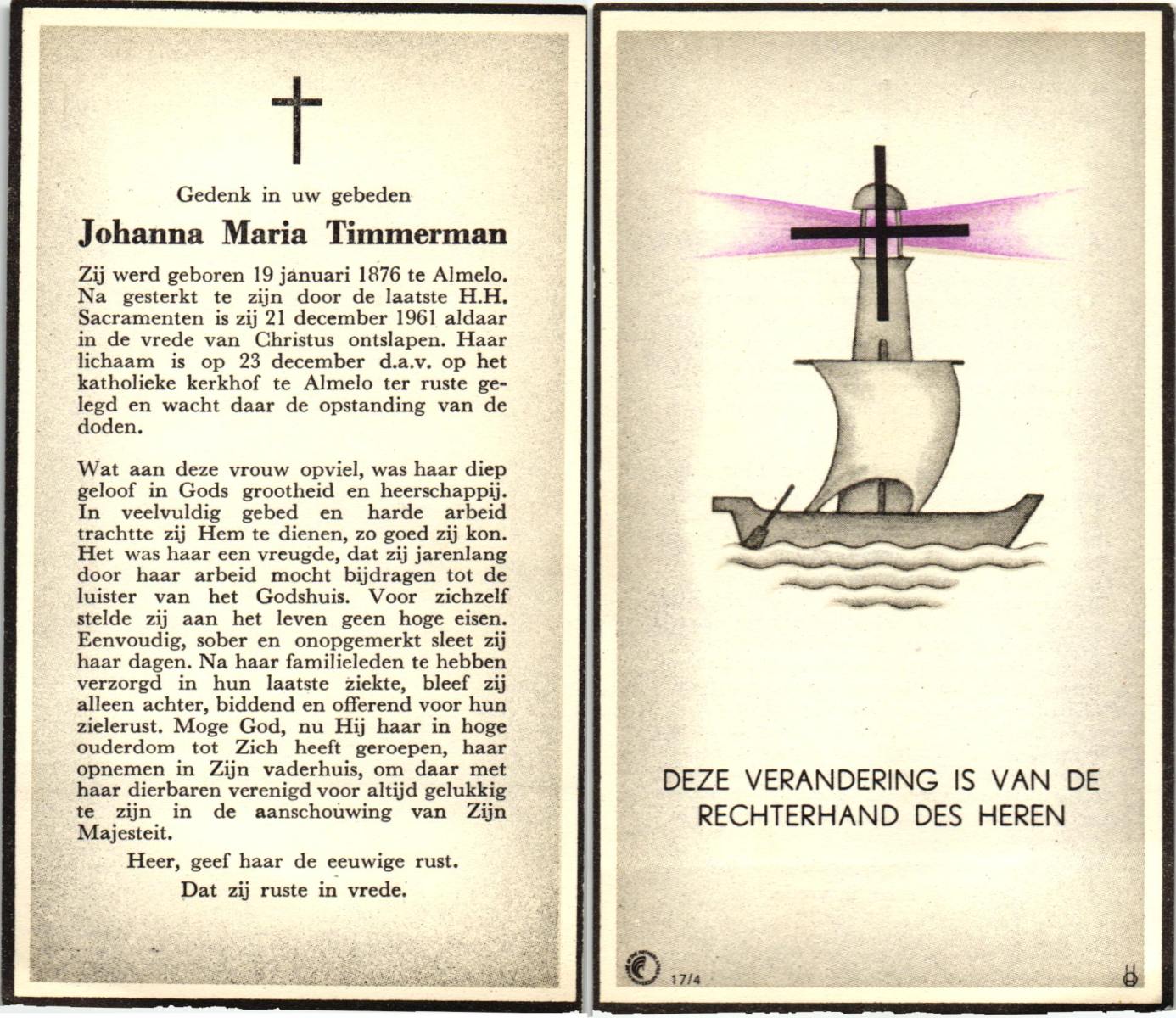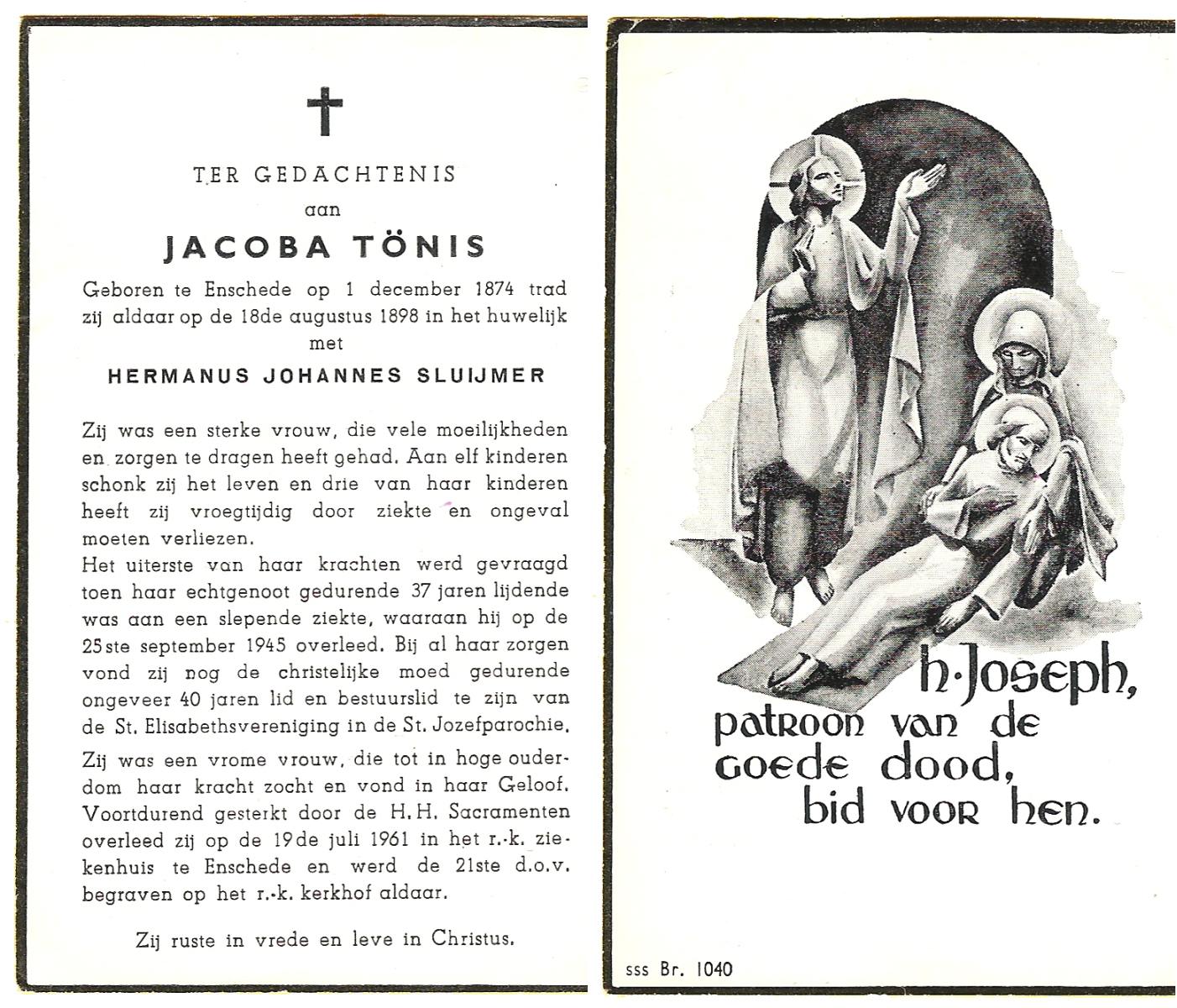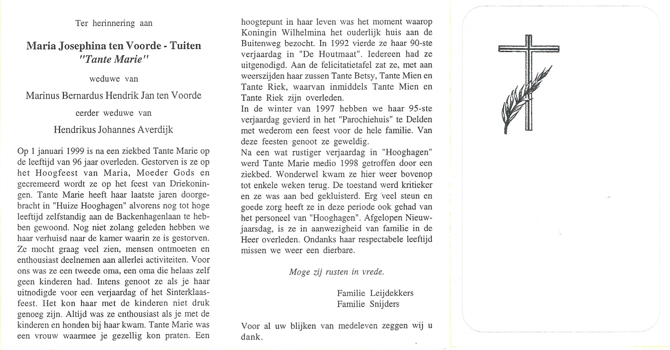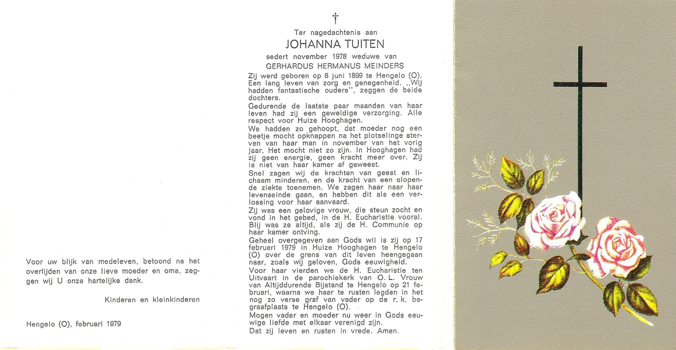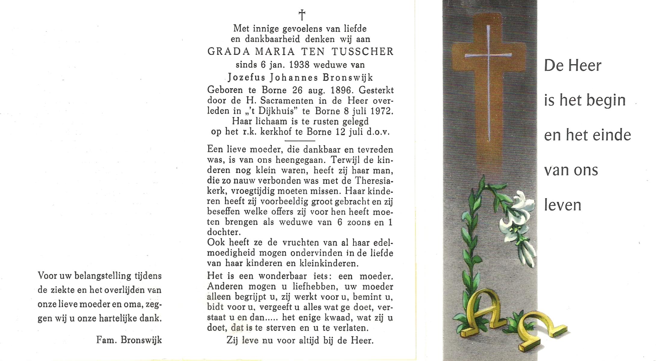 TIJHUIS, Johanna Maria, geboren op 14-4-1925 te Saasveld, overleden op 4-5-1998 te Almelo, ziekenhuis op 73-jarige leeftijd, begraven op 8-5-1998 te Borne.