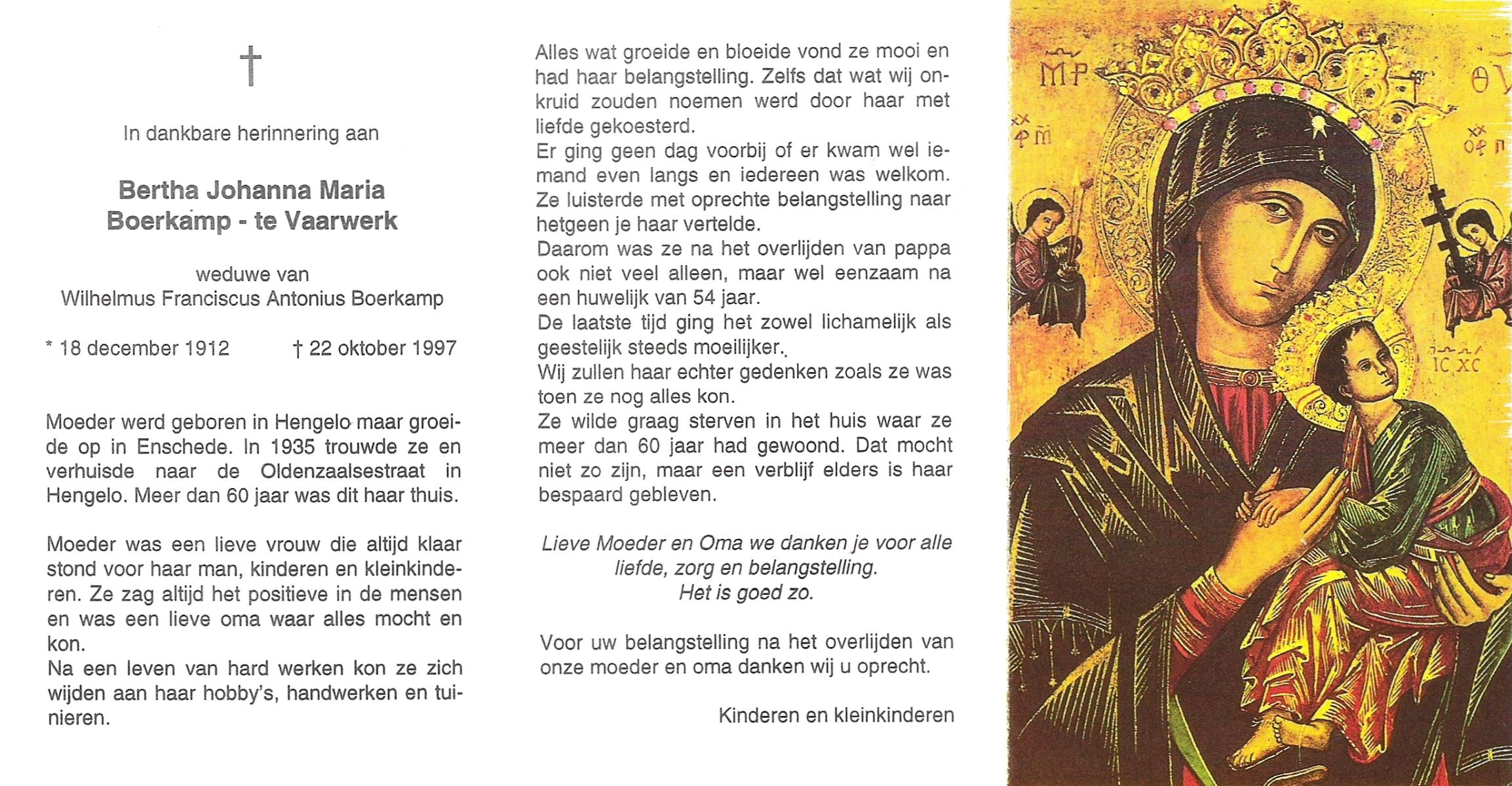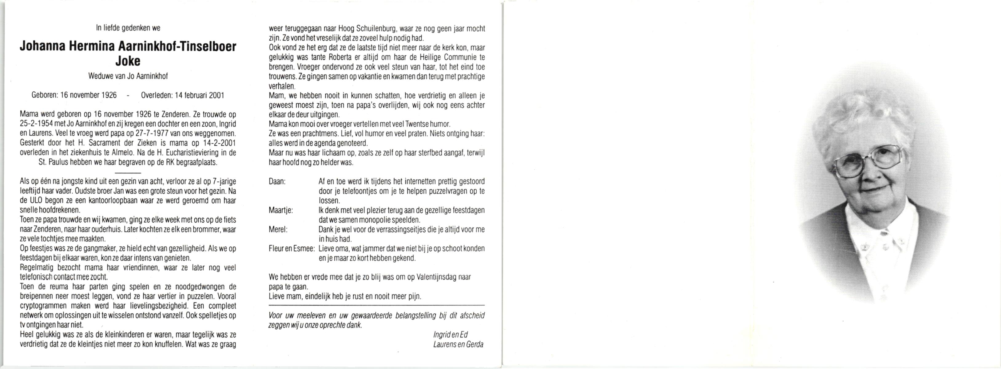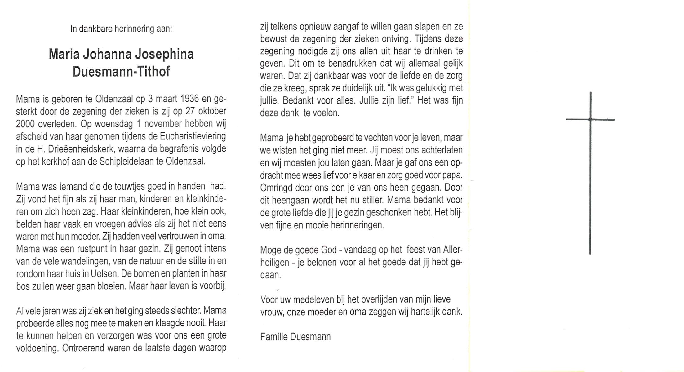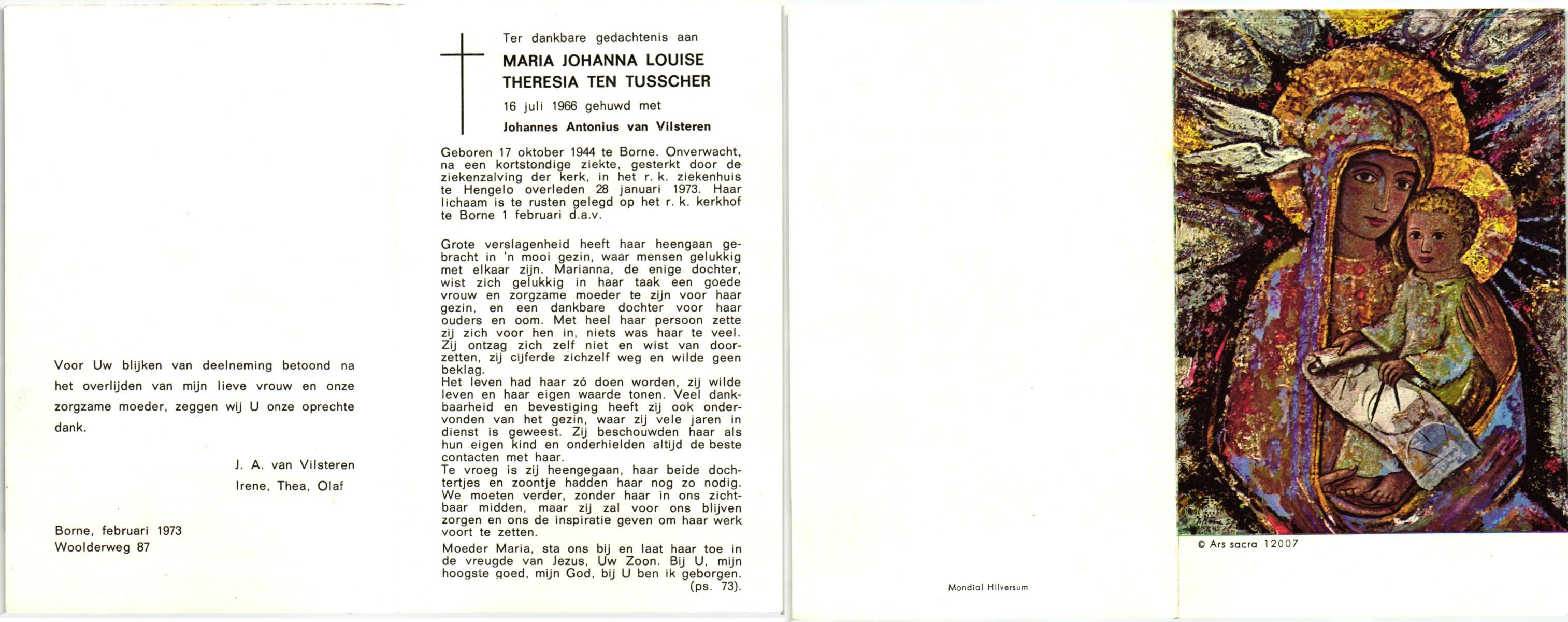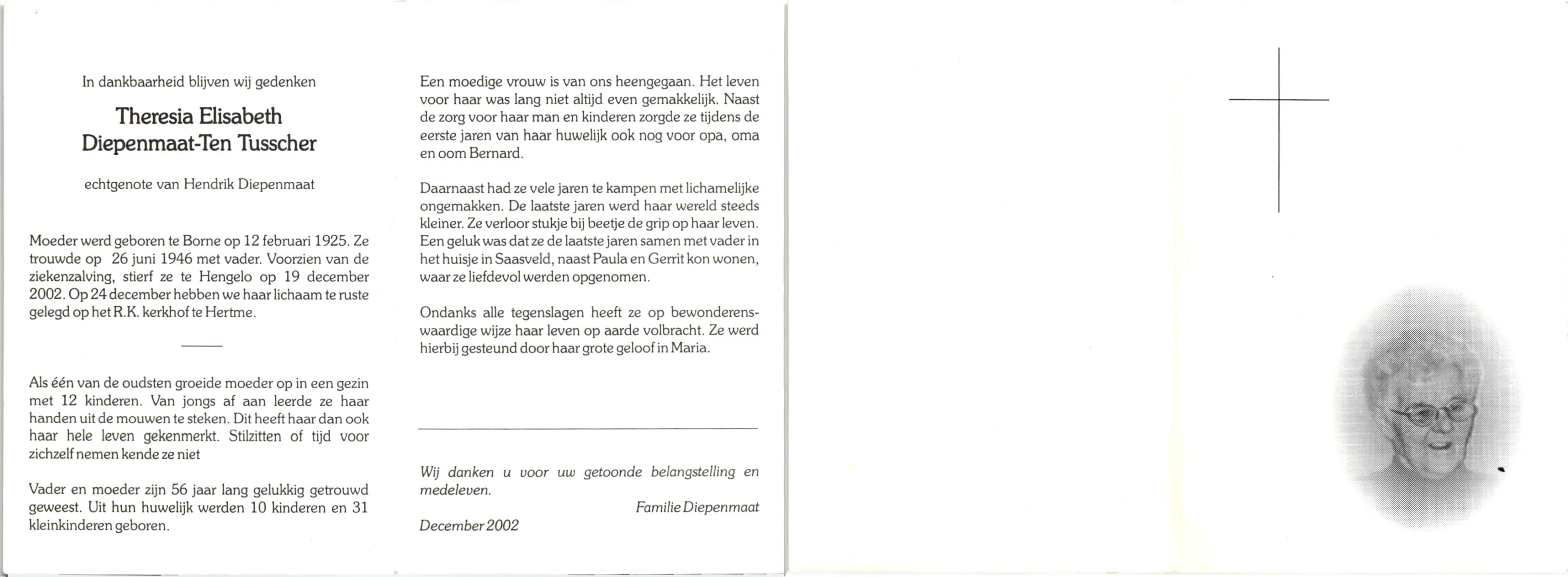 TIJHUIS, Johanna Maria, geboren op 14-4-1925 te Saasveld, overleden op 4-5-1998 te Almelo, ziekenhuis op 73-jarige leeftijd, begraven op 8-5-1998 te Borne.