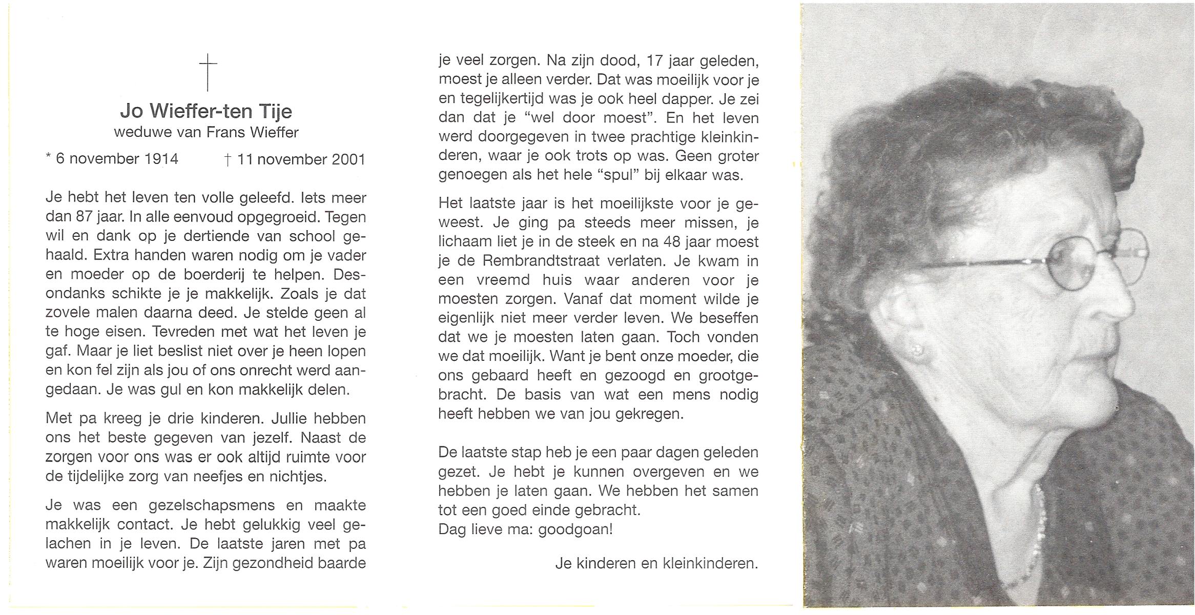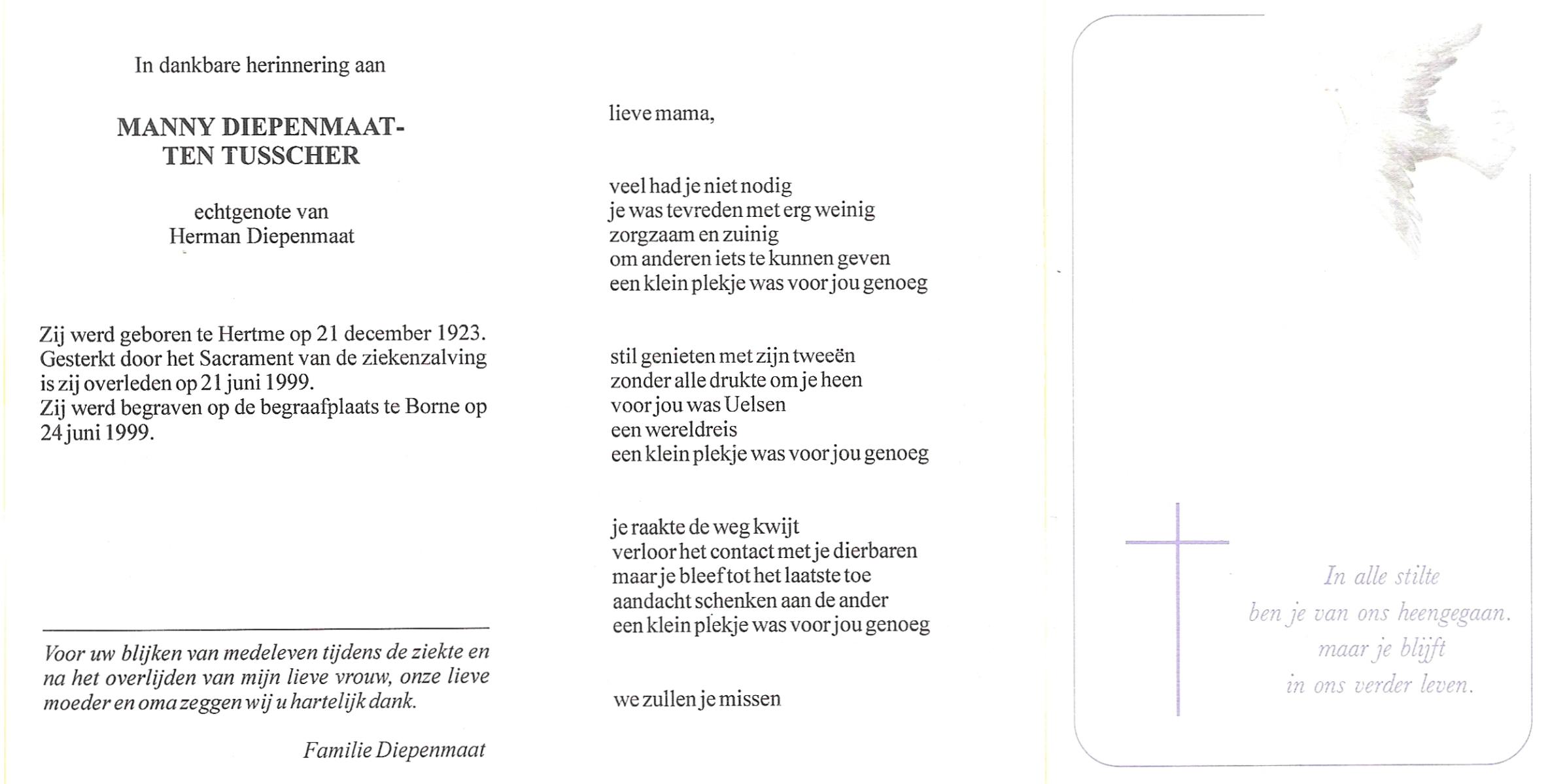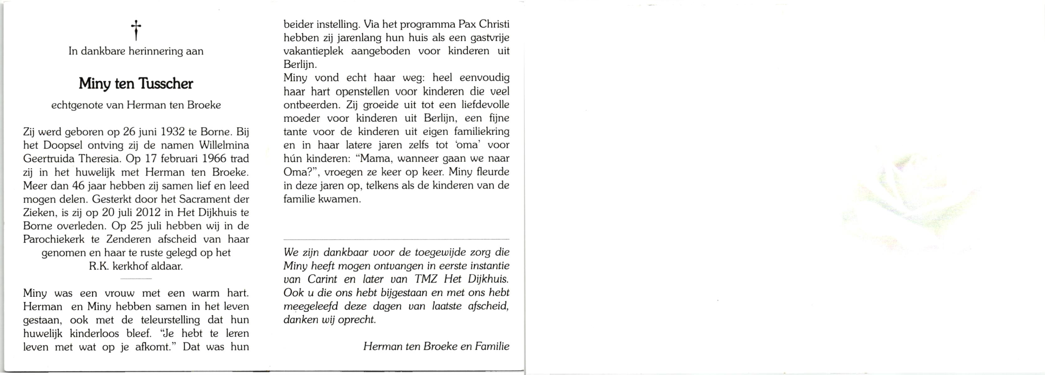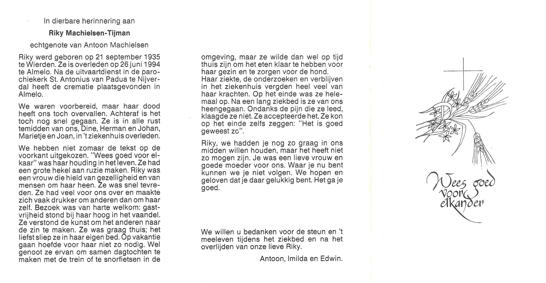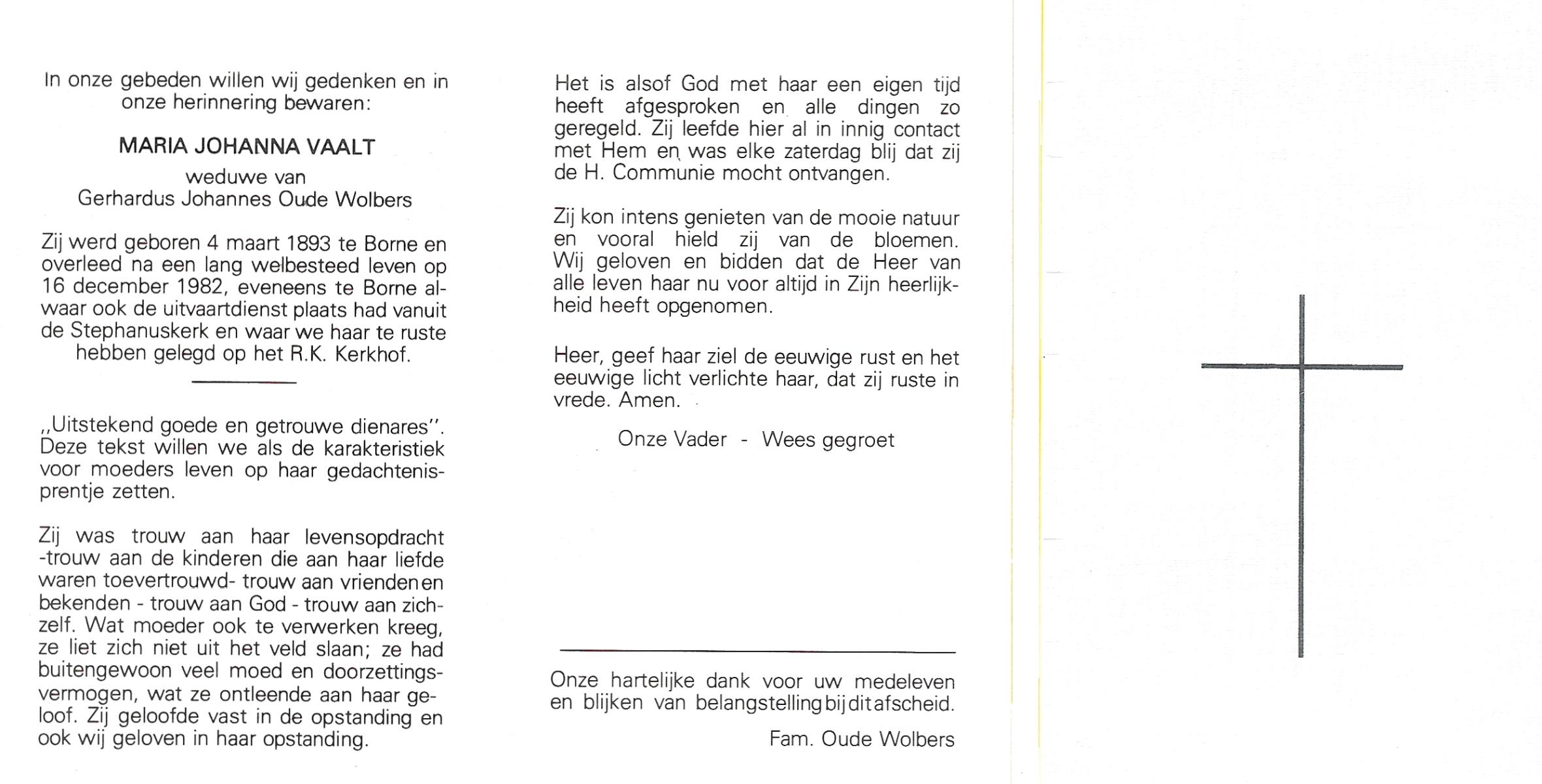 TIJHUIS, Johanna Maria, geboren op 14-4-1925 te Saasveld, overleden op 4-5-1998 te Almelo, ziekenhuis op 73-jarige leeftijd, begraven op 8-5-1998 te Borne.