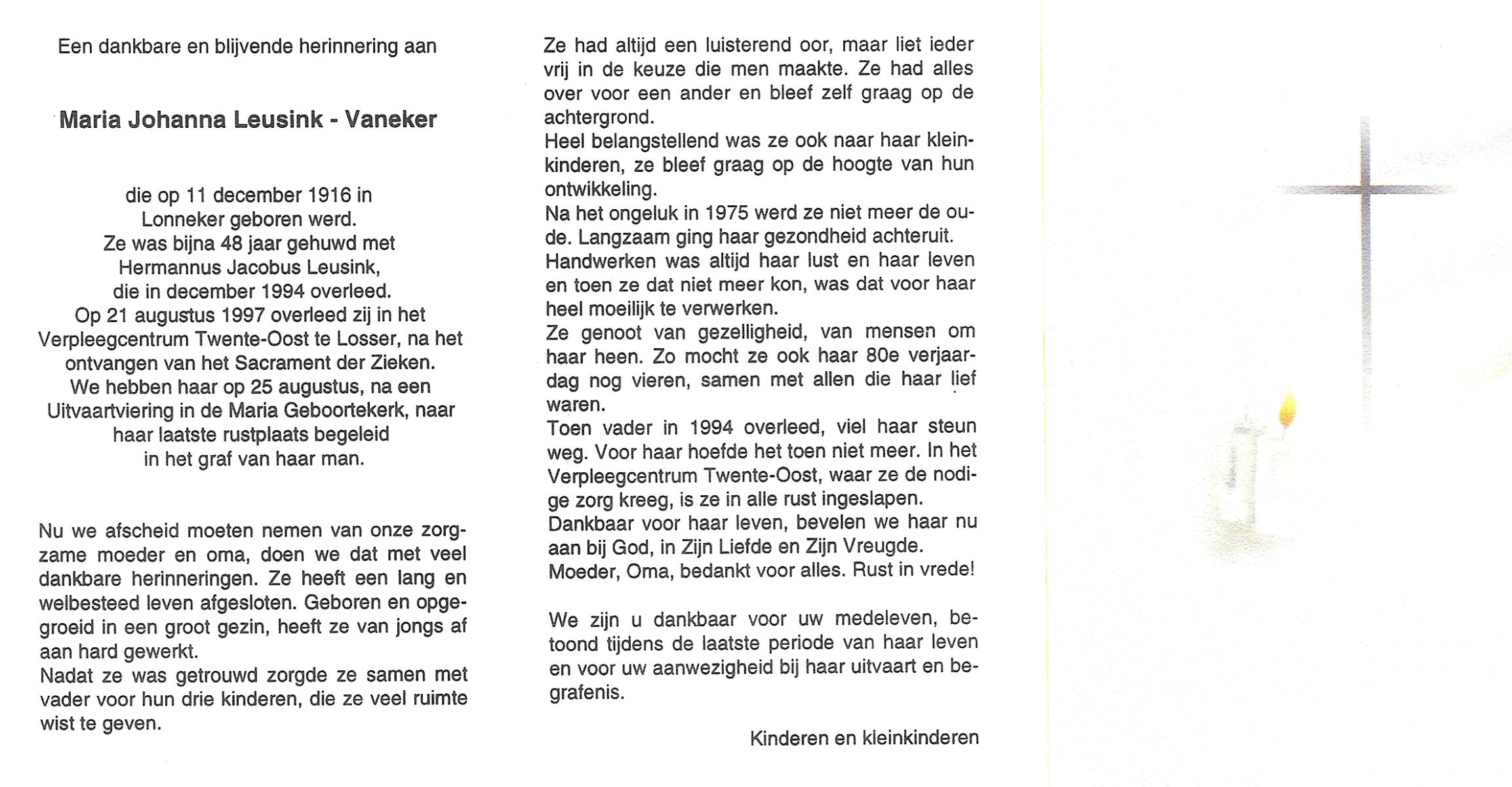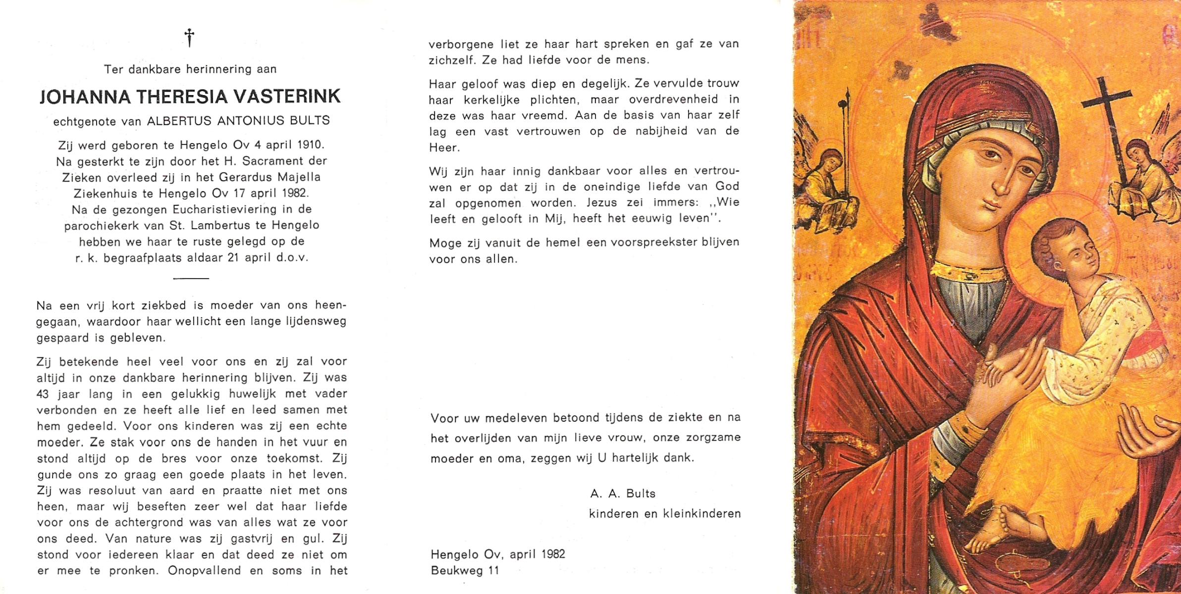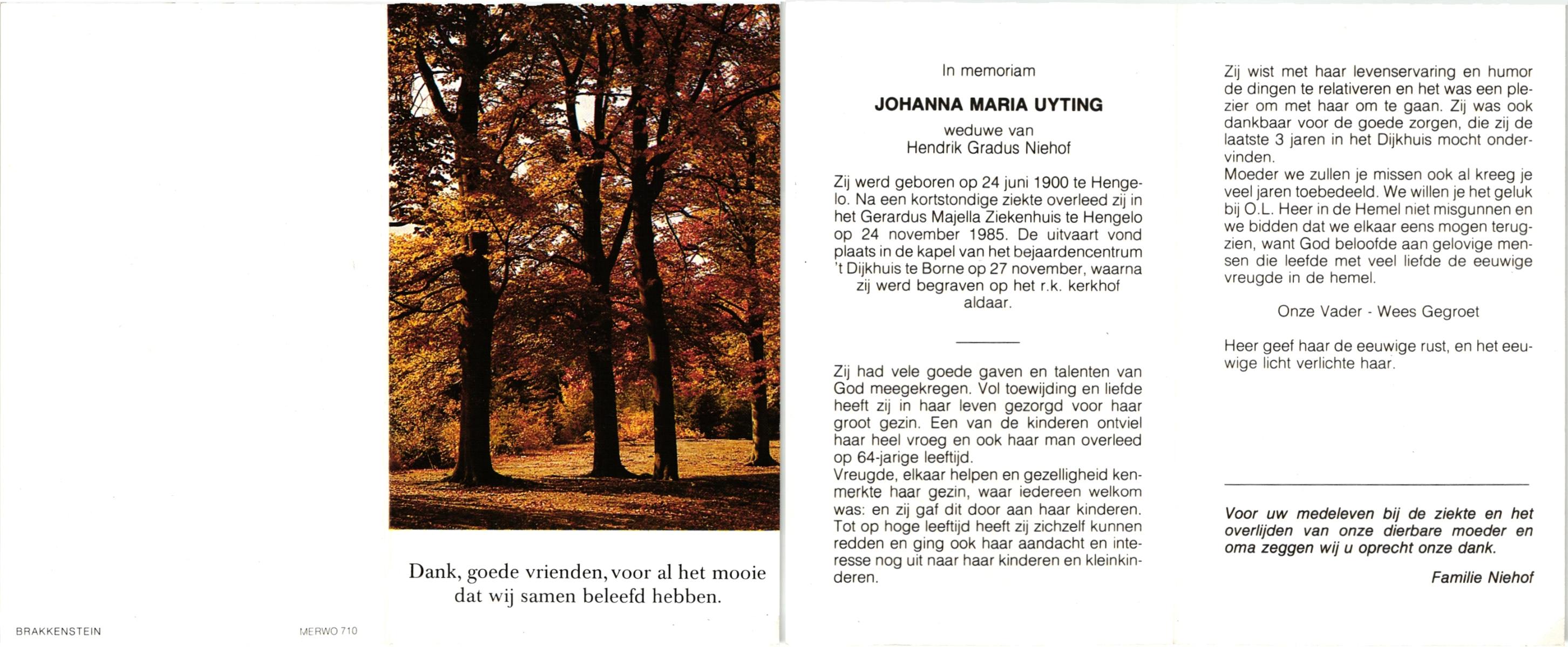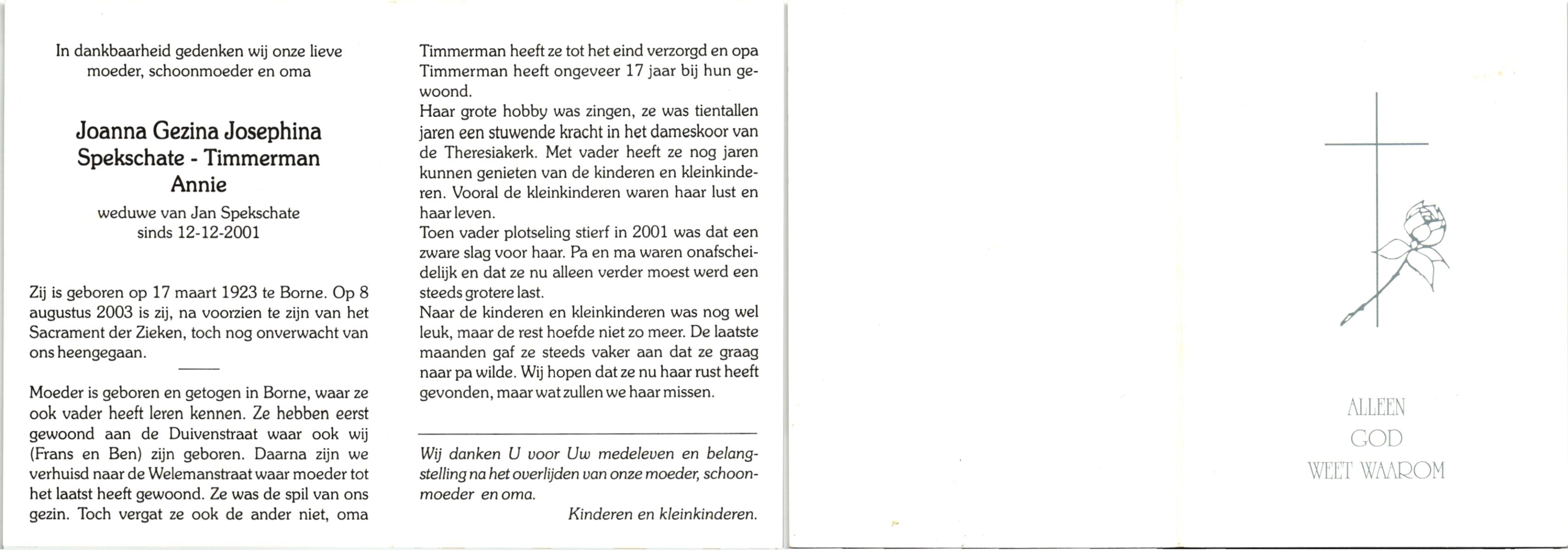 TIJHUIS, Johanna Maria, geboren op 14-4-1925 te Saasveld, overleden op 4-5-1998 te Almelo, ziekenhuis op 73-jarige leeftijd, begraven op 8-5-1998 te Borne.
