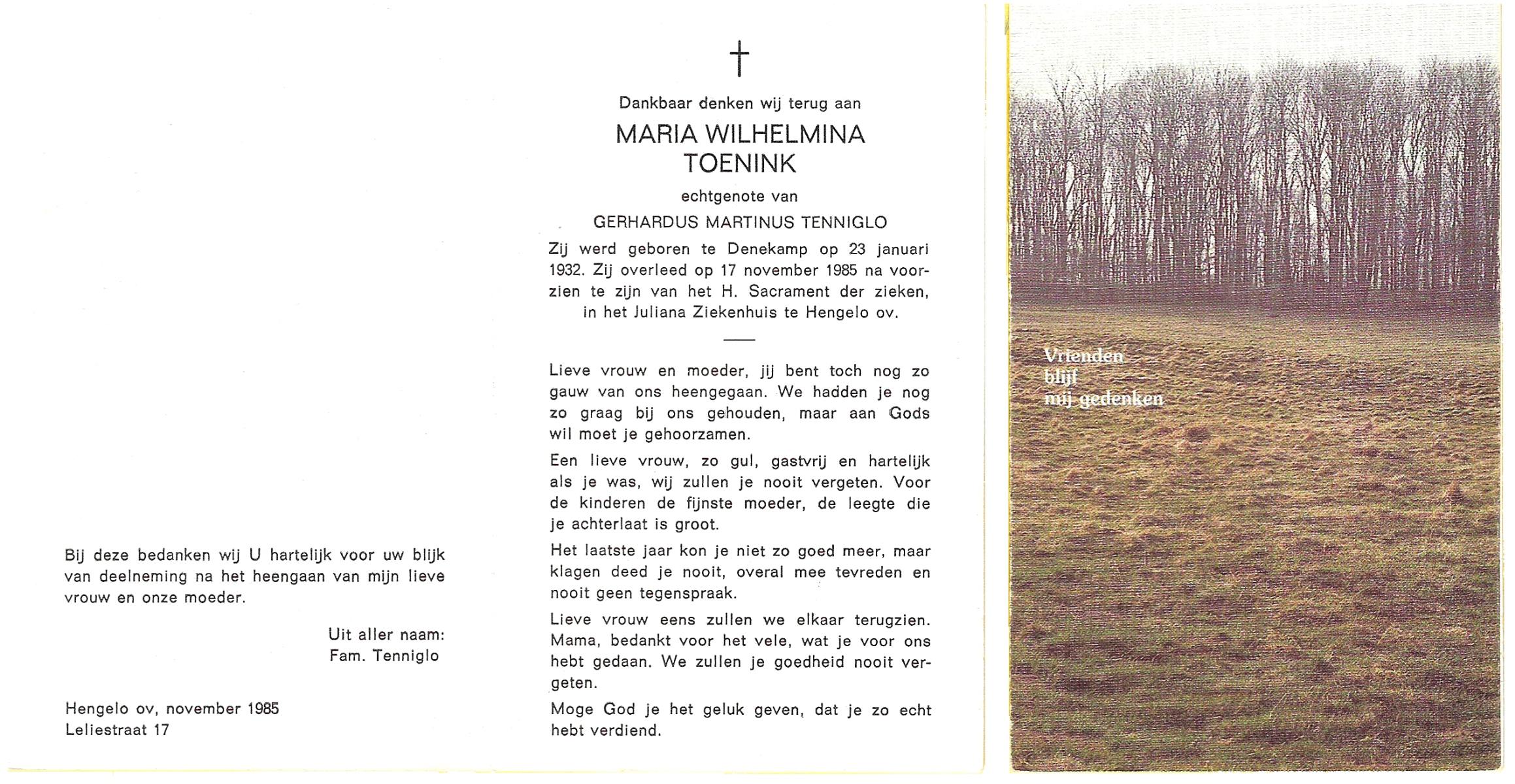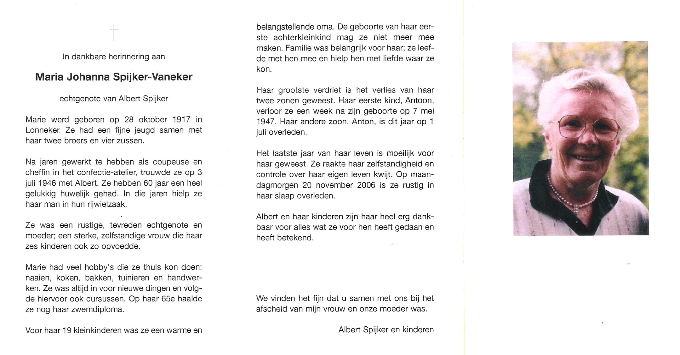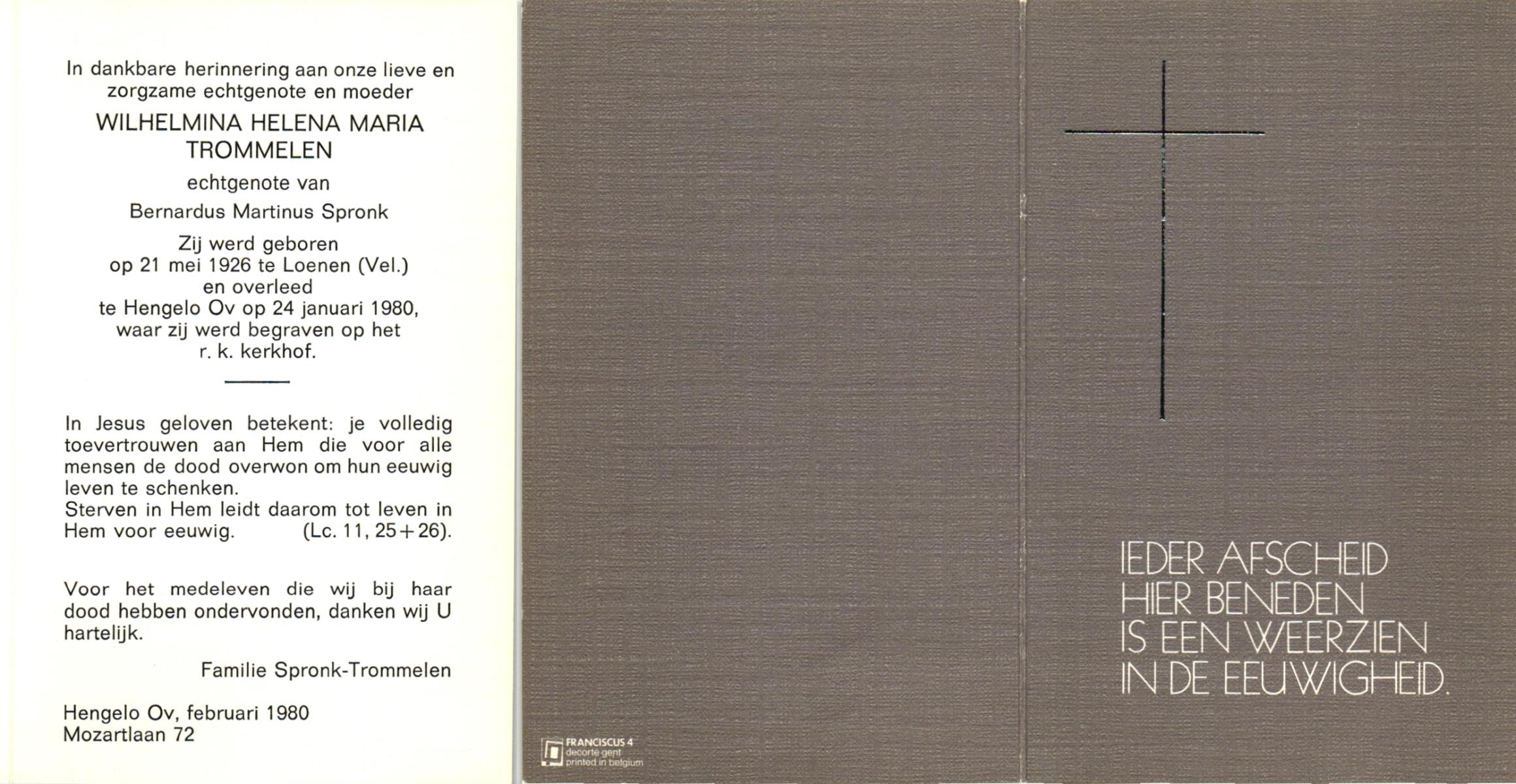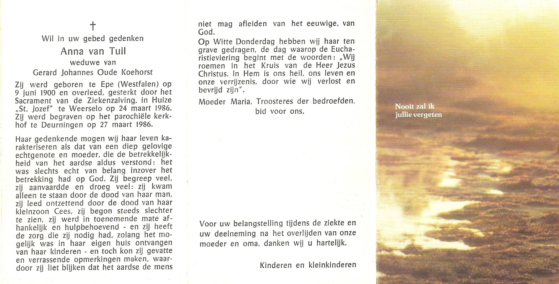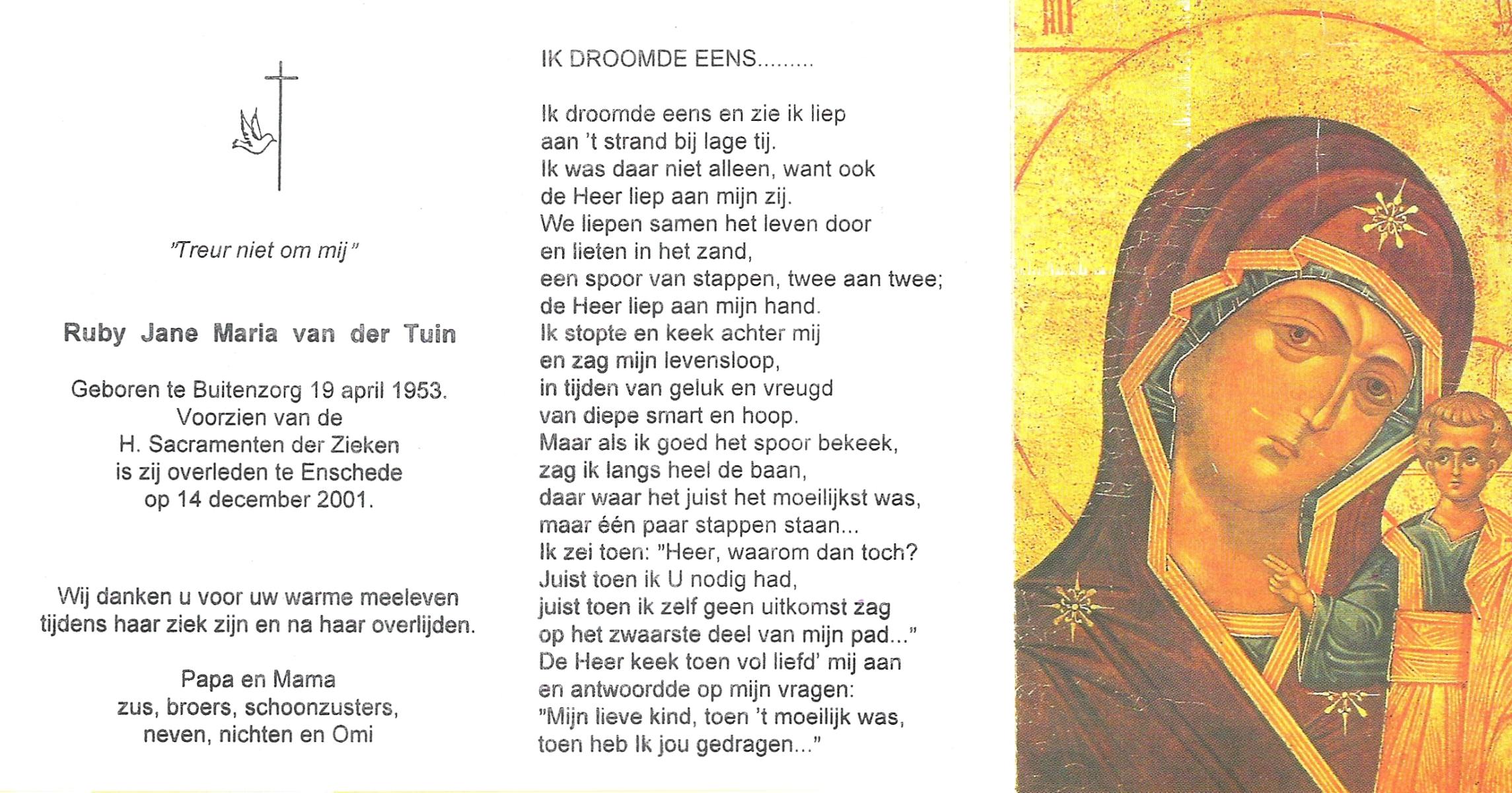 TIJHUIS, Johanna Maria, geboren op 14-4-1925 te Saasveld, overleden op 4-5-1998 te Almelo, ziekenhuis op 73-jarige leeftijd, begraven op 8-5-1998 te Borne.