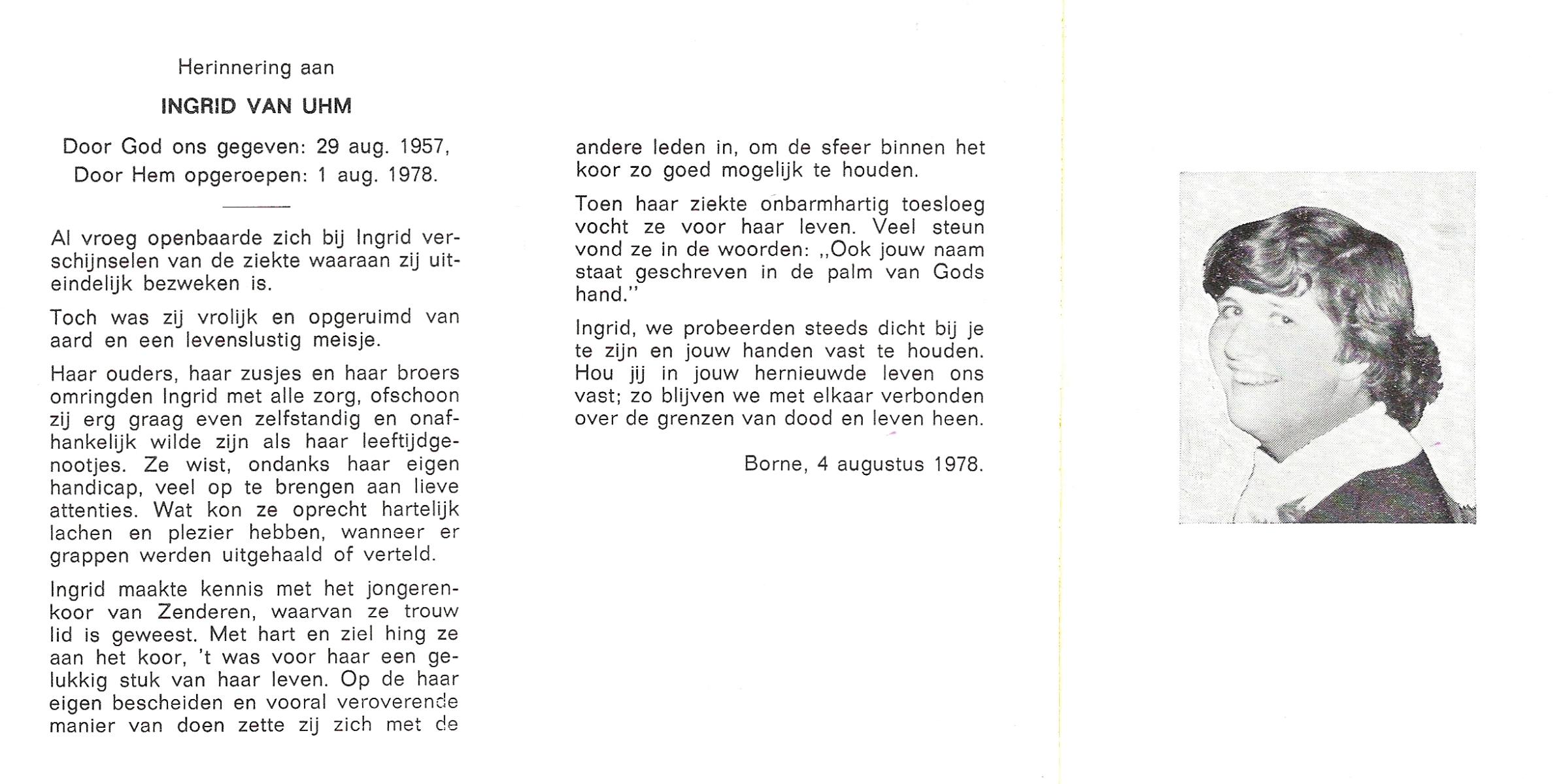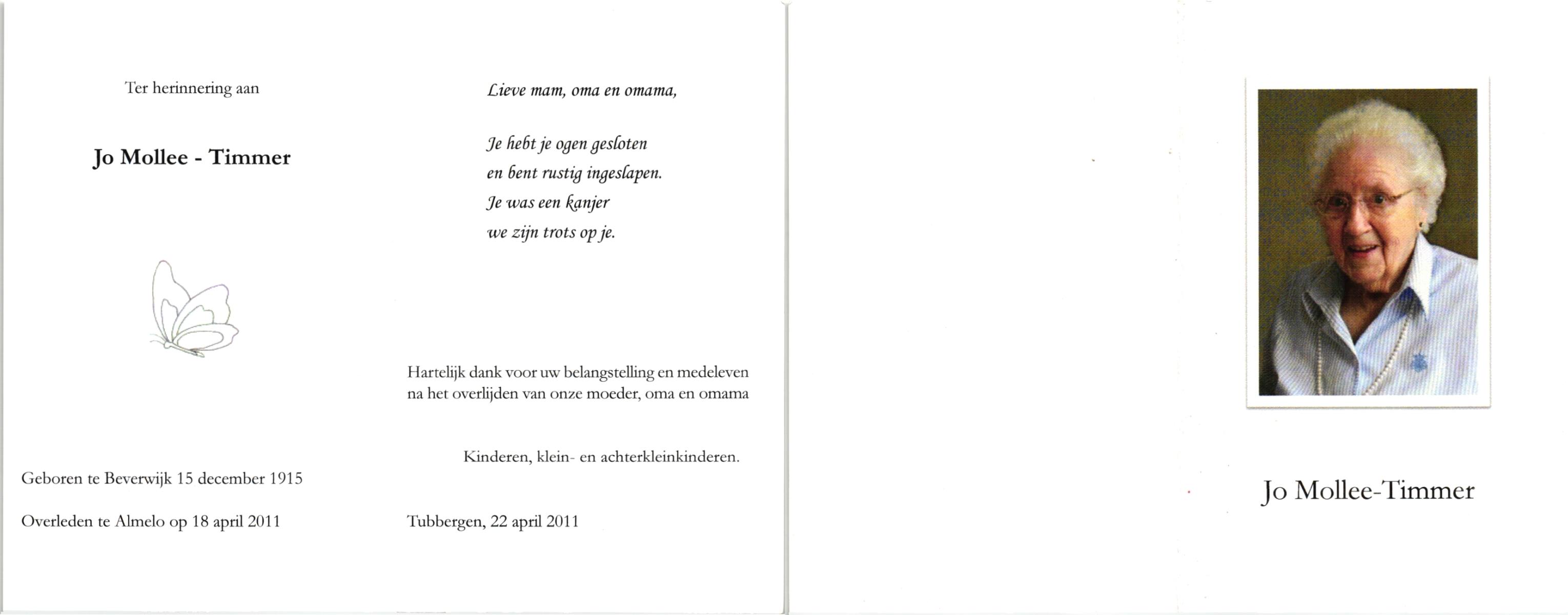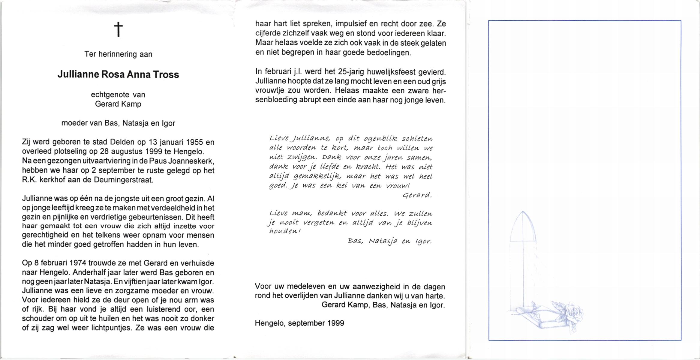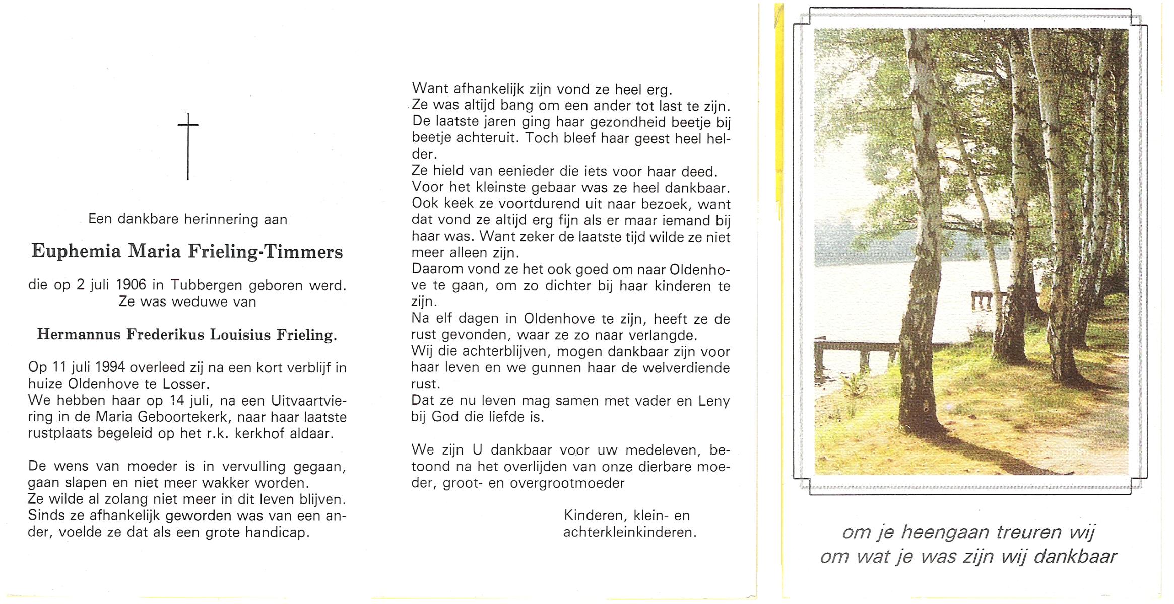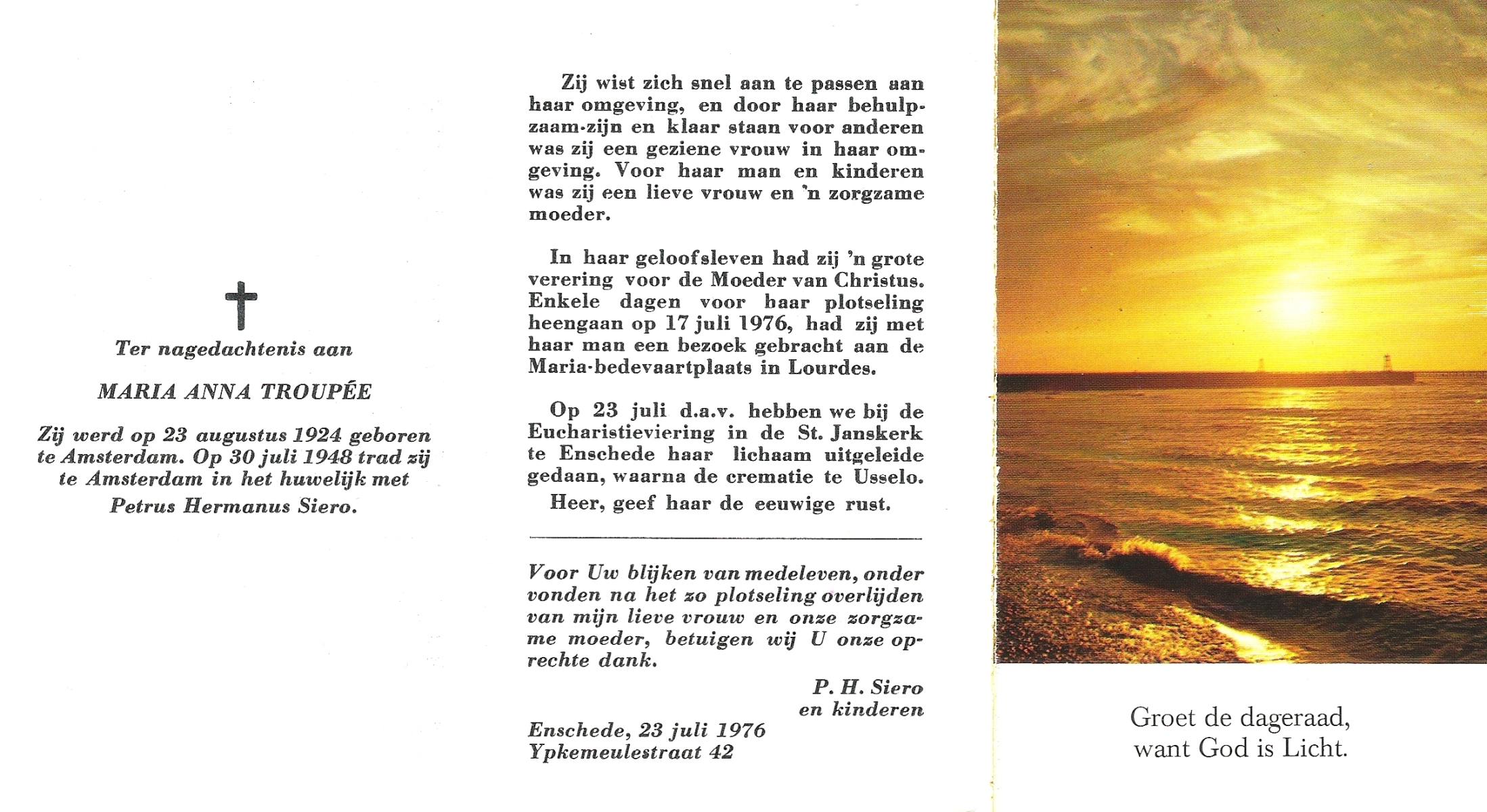 TIJHUIS, Johanna Maria, geboren op 14-4-1925 te Saasveld, overleden op 4-5-1998 te Almelo, ziekenhuis op 73-jarige leeftijd, begraven op 8-5-1998 te Borne.