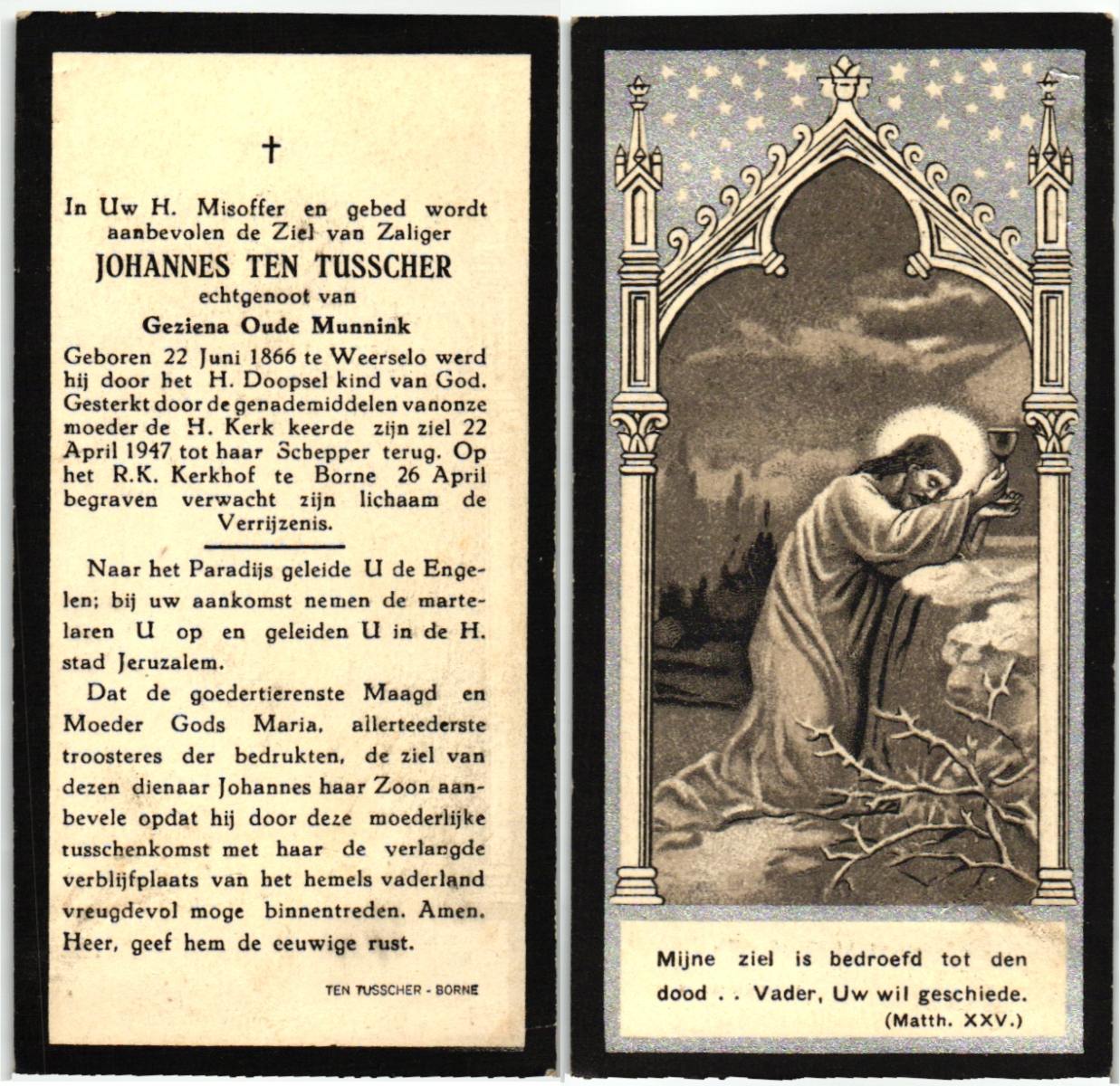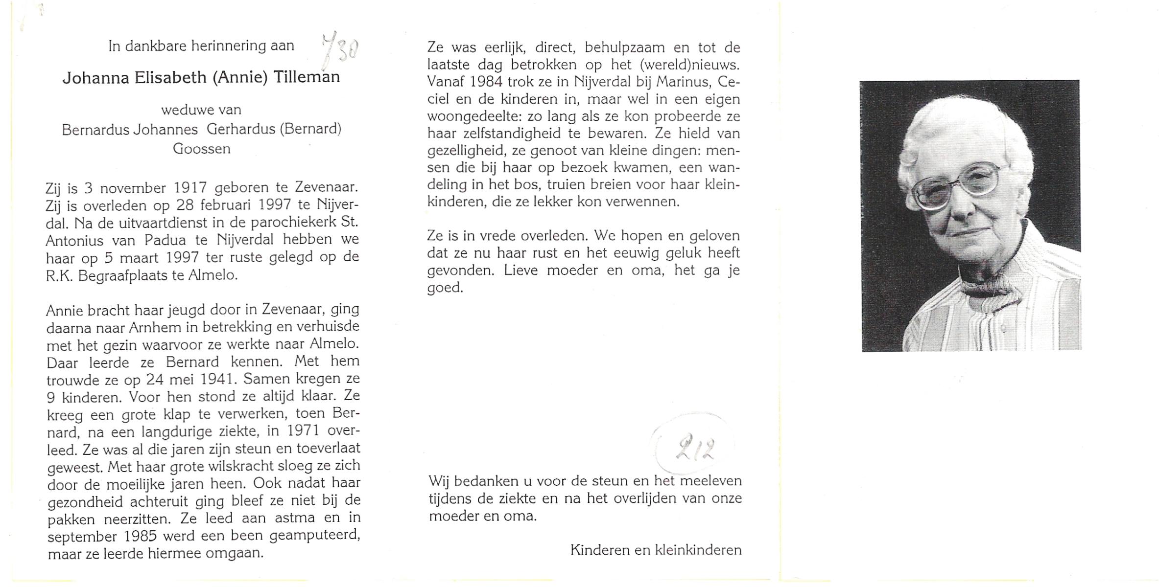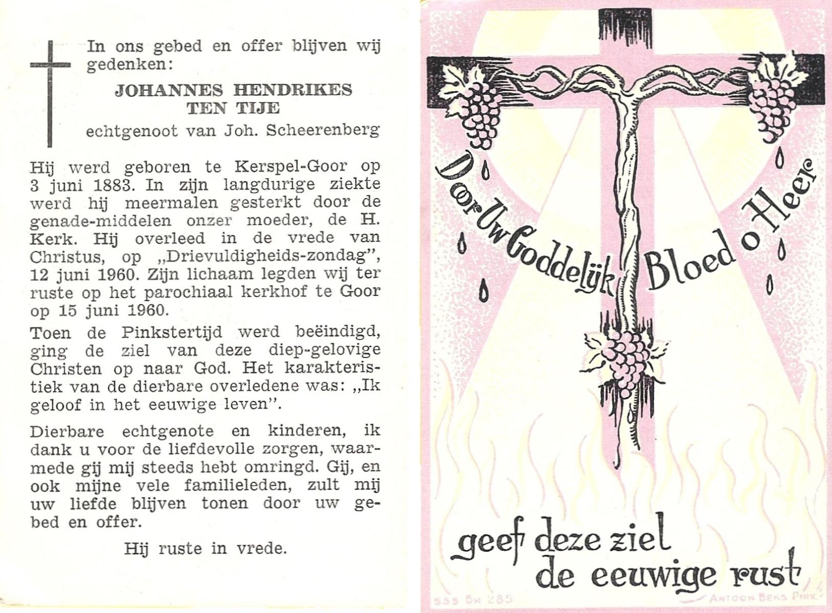 TIJE, ten, Johannes Hendrikes, geboren op 03-06-1883 te Goor, overleden op 12-6-1960 op 77-jarige leeftijd, begraven op 15-6-1960 te Goor.