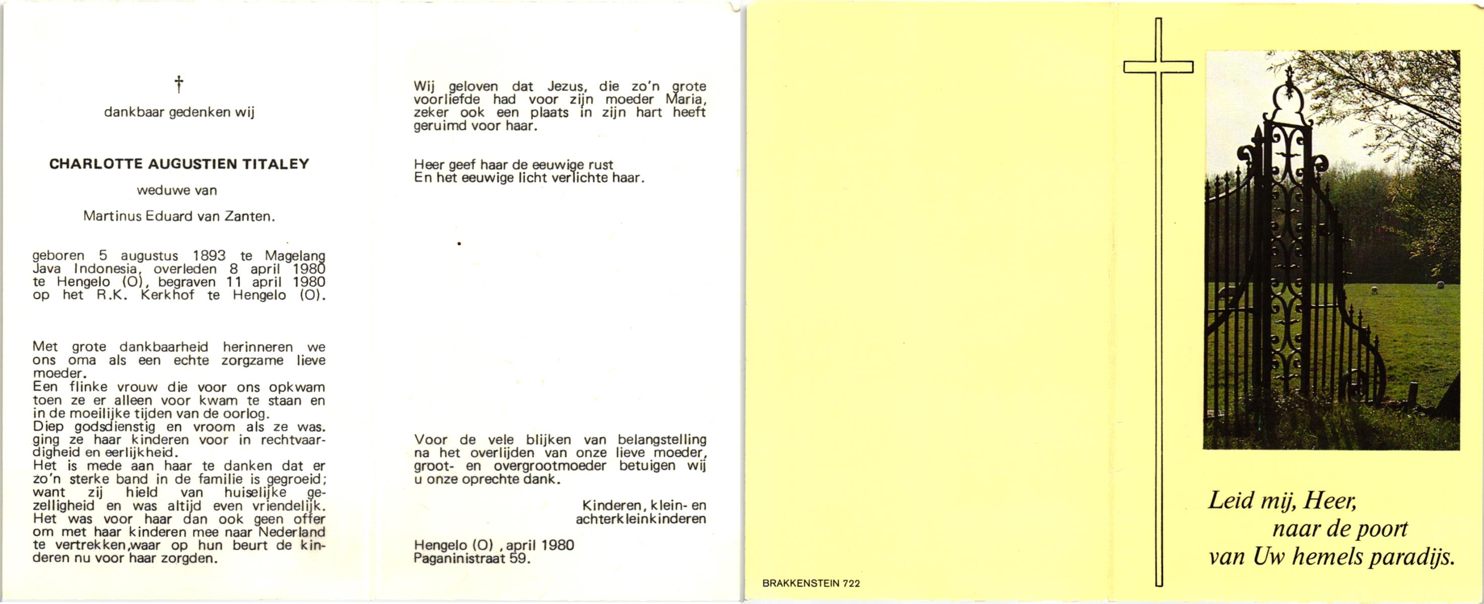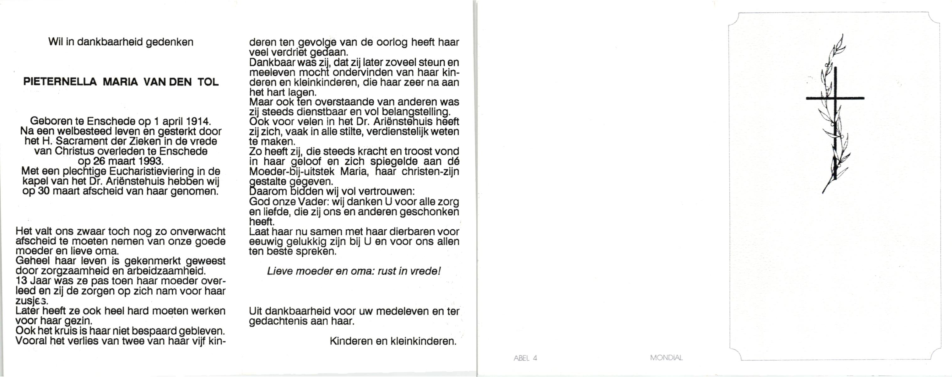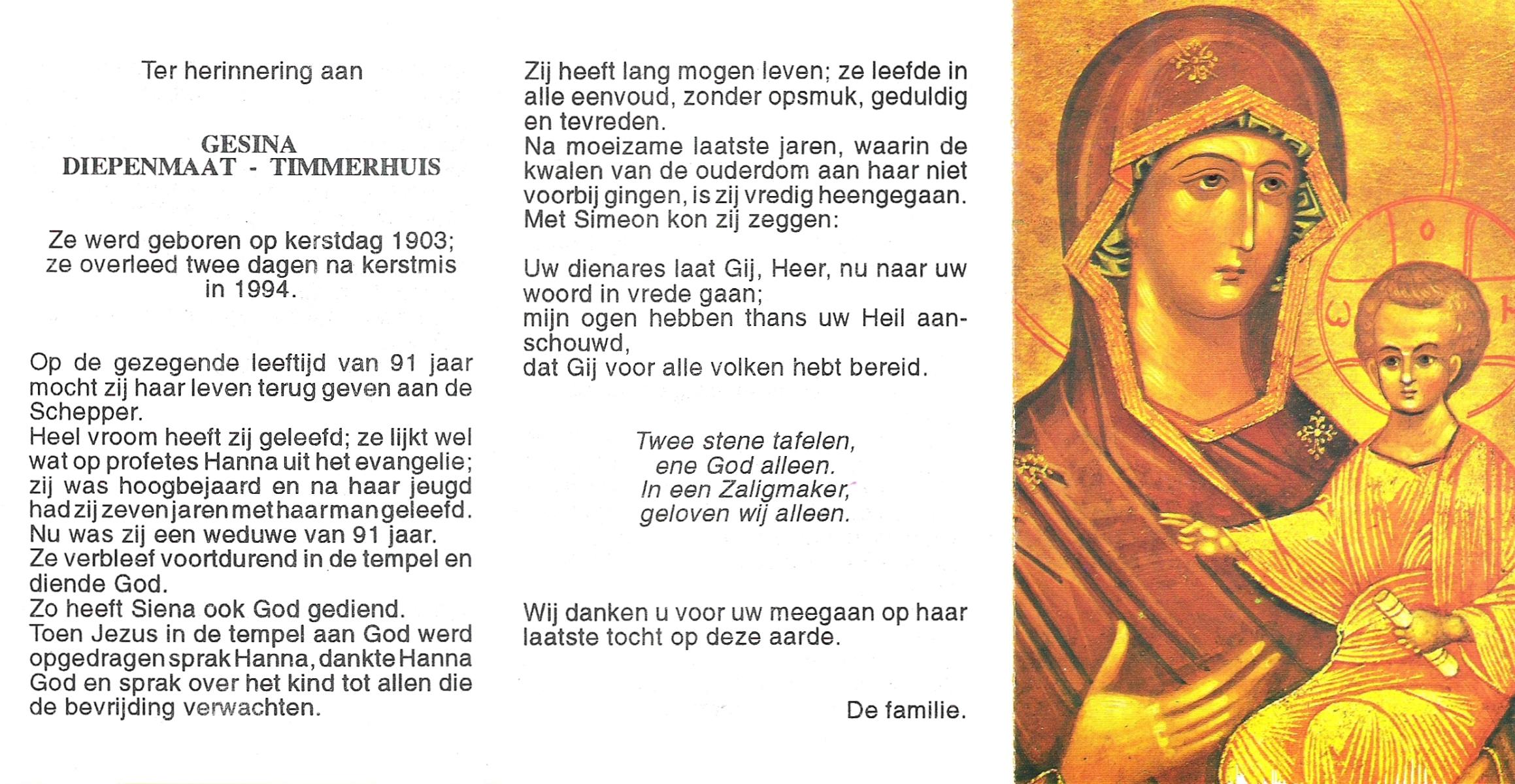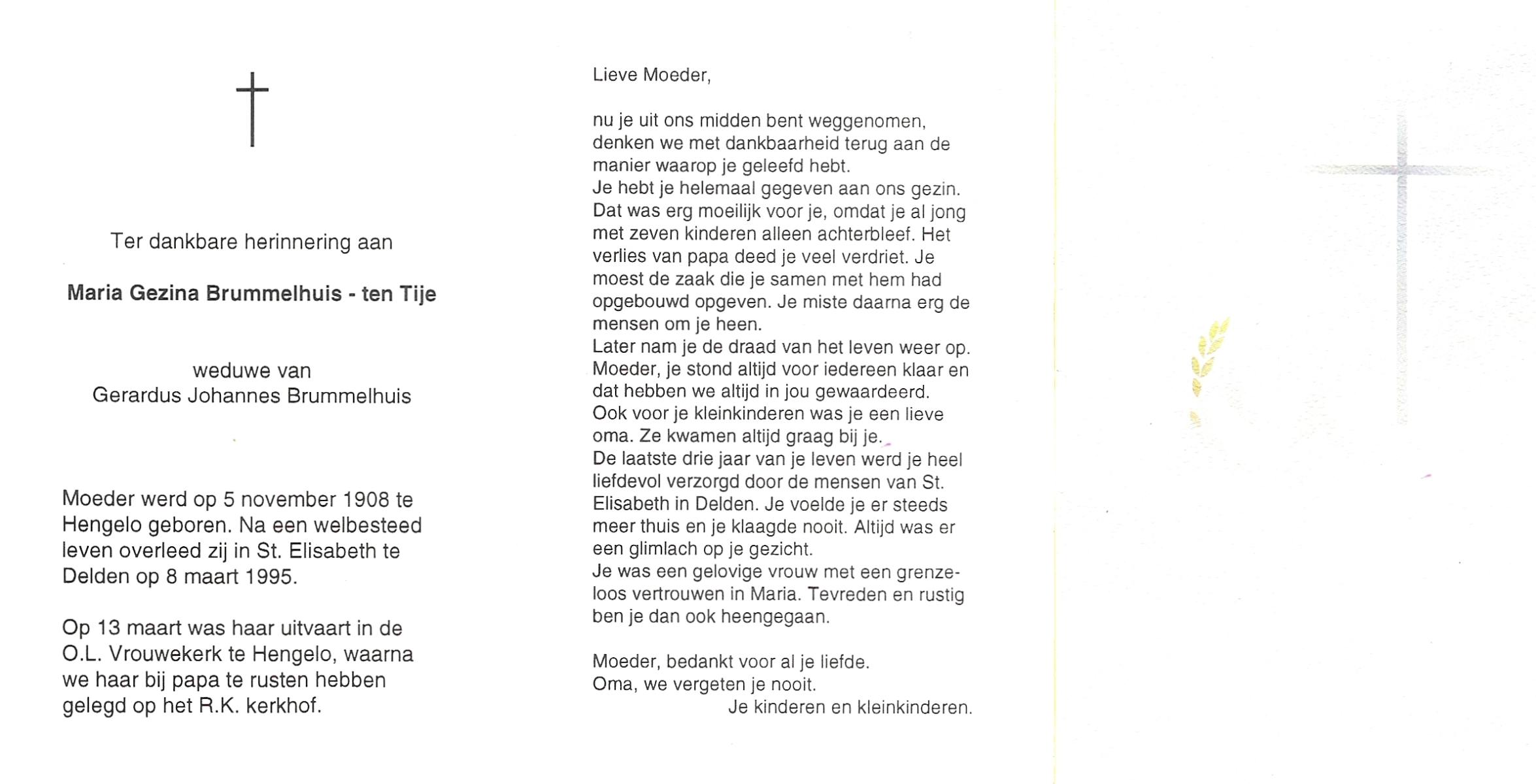 TIJE, ten, Maria Gezina, geboren op 5-11-1908 te Hengelo (O), overleden op 8-3-1995 te Delden op 86-jarige leeftijd, begraven op 13-3-1995.
