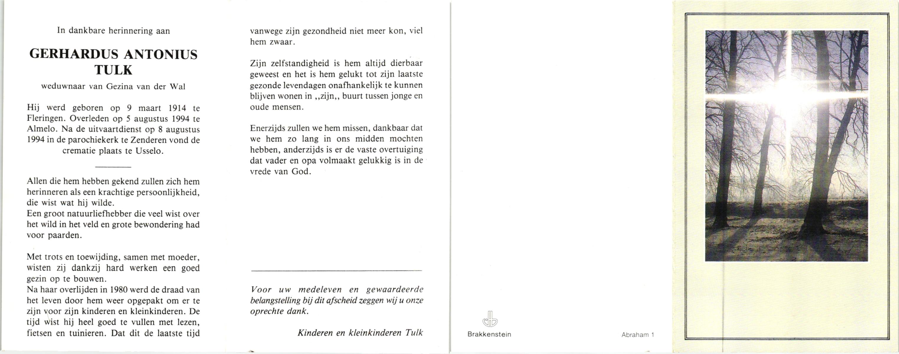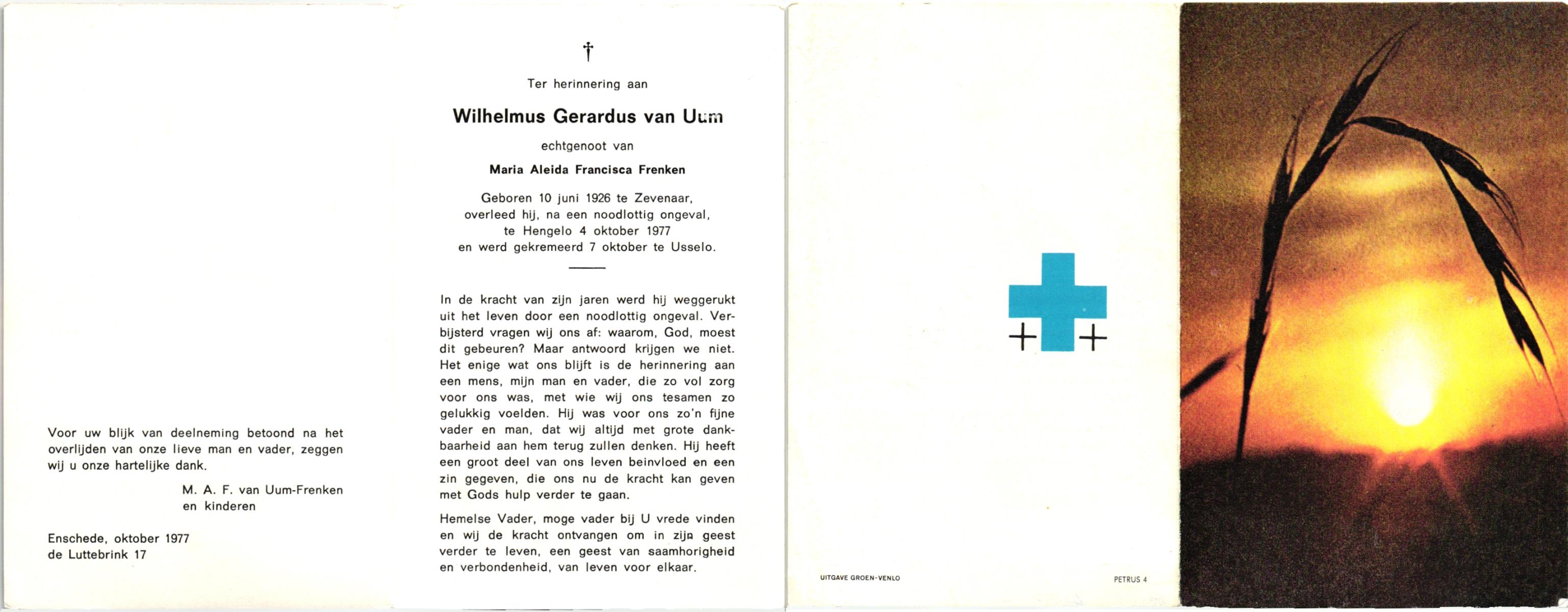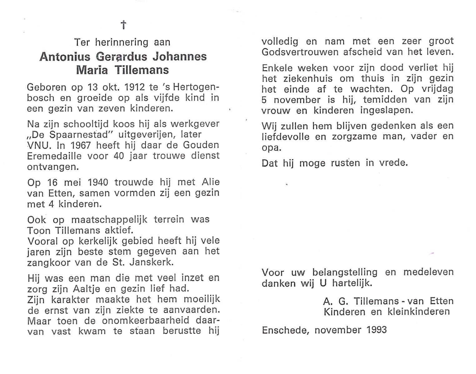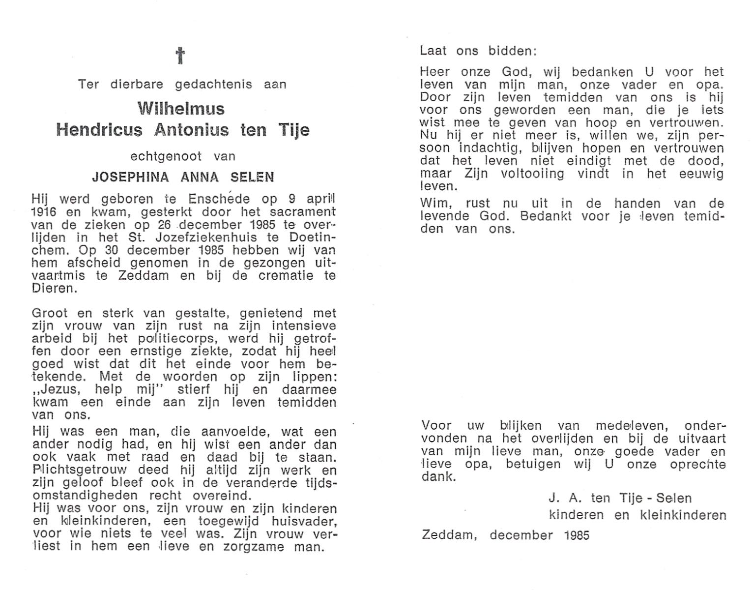 TIJE, ten, Wilhelmus Hendricus Antonius, geboren op 9-4-1916 te Enschede, overleden op 26-12-1985 te Doetinchem op 69-jarige leeftijd, gecremeerd op 30-12-1985 te Dieren.