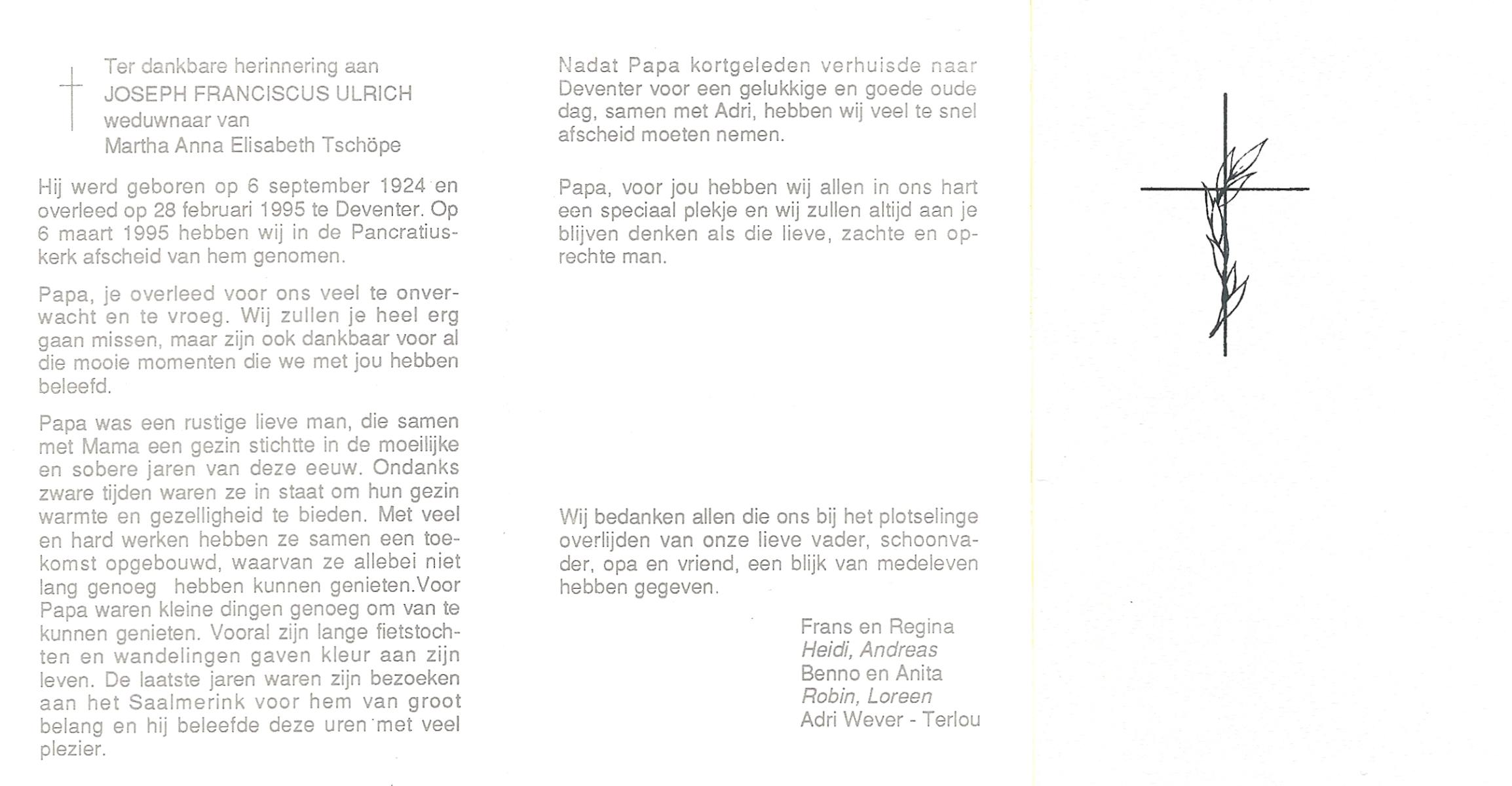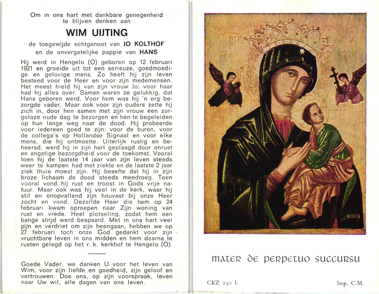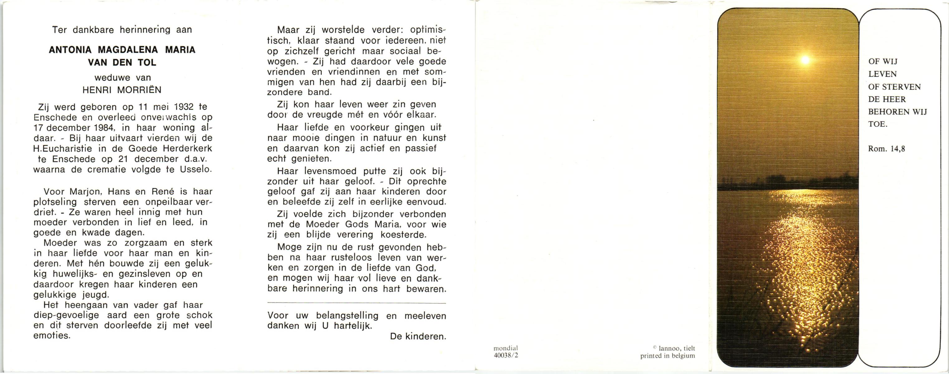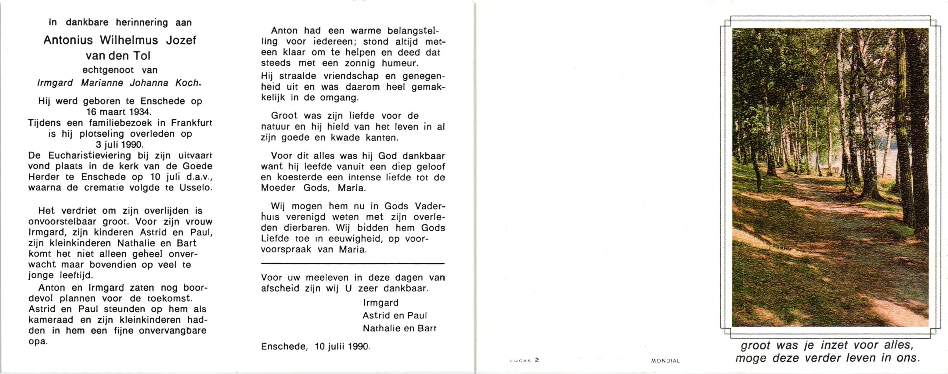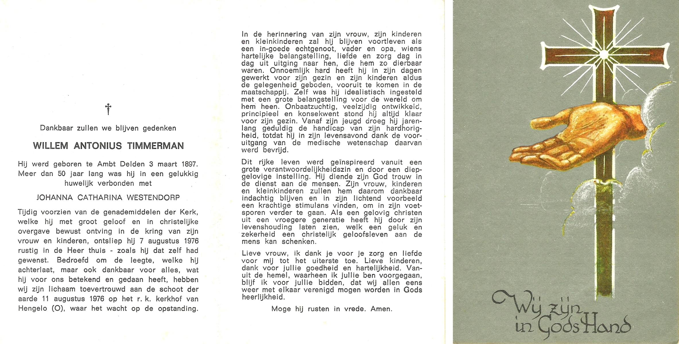 TIJE, ten, Wilhelmus Hendricus Antonius, geboren op 9-4-1916 te Enschede, overleden op 26-12-1985 te Doetinchem op 69-jarige leeftijd, gecremeerd op 30-12-1985 te Dieren.
