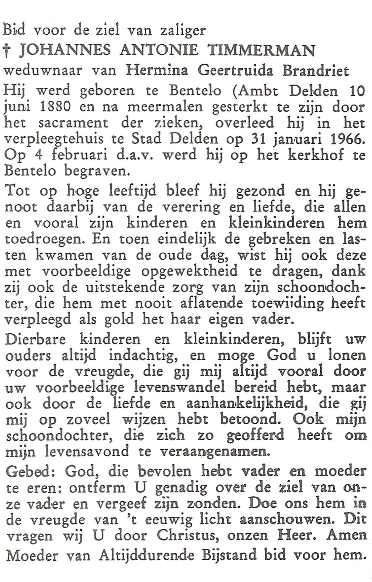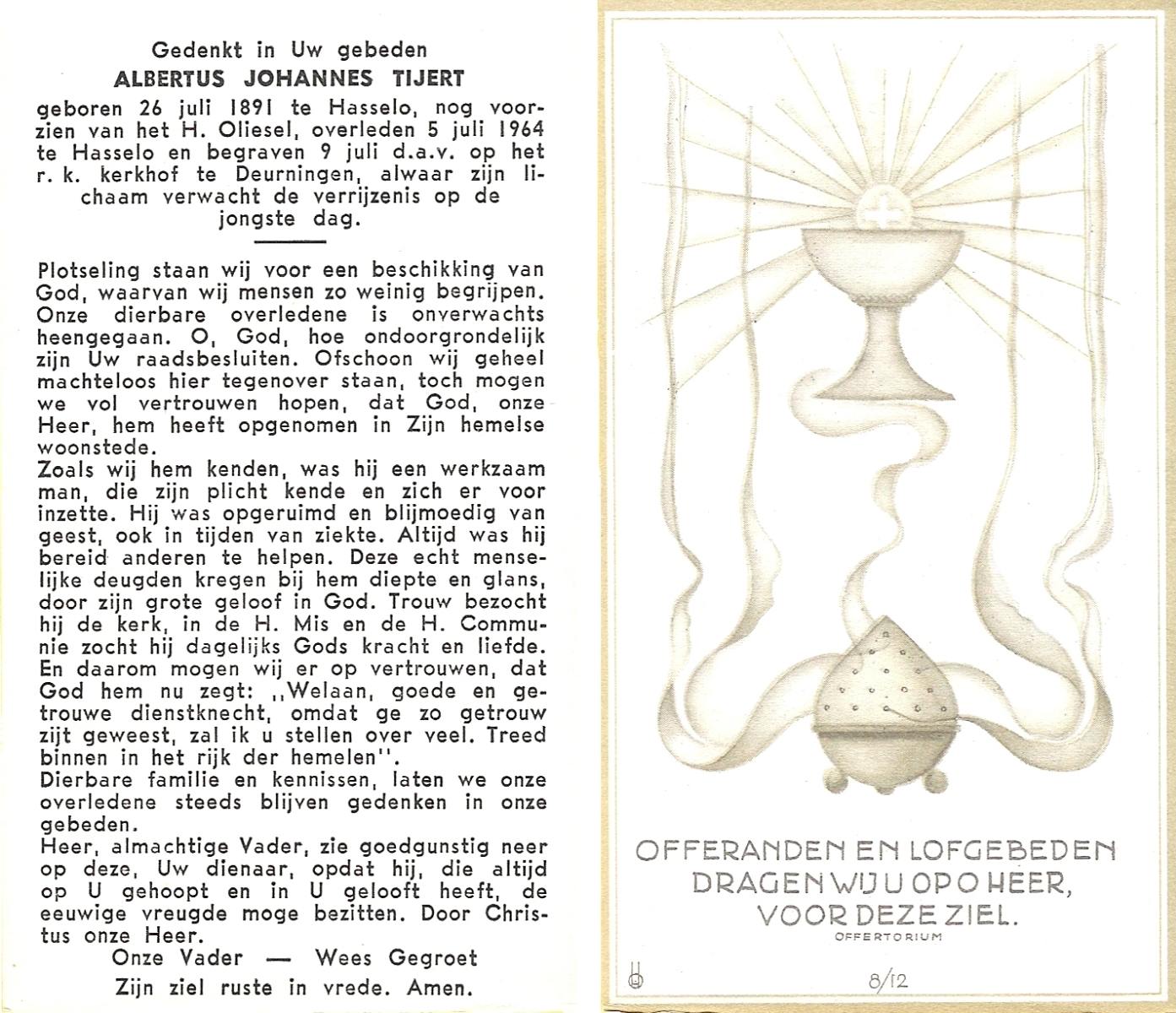 TIJERT, Albertus Johannes, geboren op 26-07-1891 te Hasselo, overleden op 5-7-1964 te Hasselo op 72-jarige leeftijd, begraven op 9-7-1964 te Deurningen.