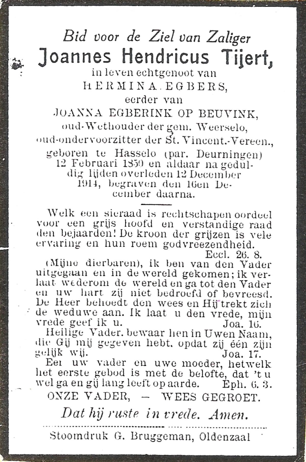 TIJERT, Joannes Hendricus, geboren op 12-02-1830 te Hasselo (par.Deurningen), overleden op 12-12-1914 te Hasselo op 84-jarige leeftijd, begraven op 16-12-1914.