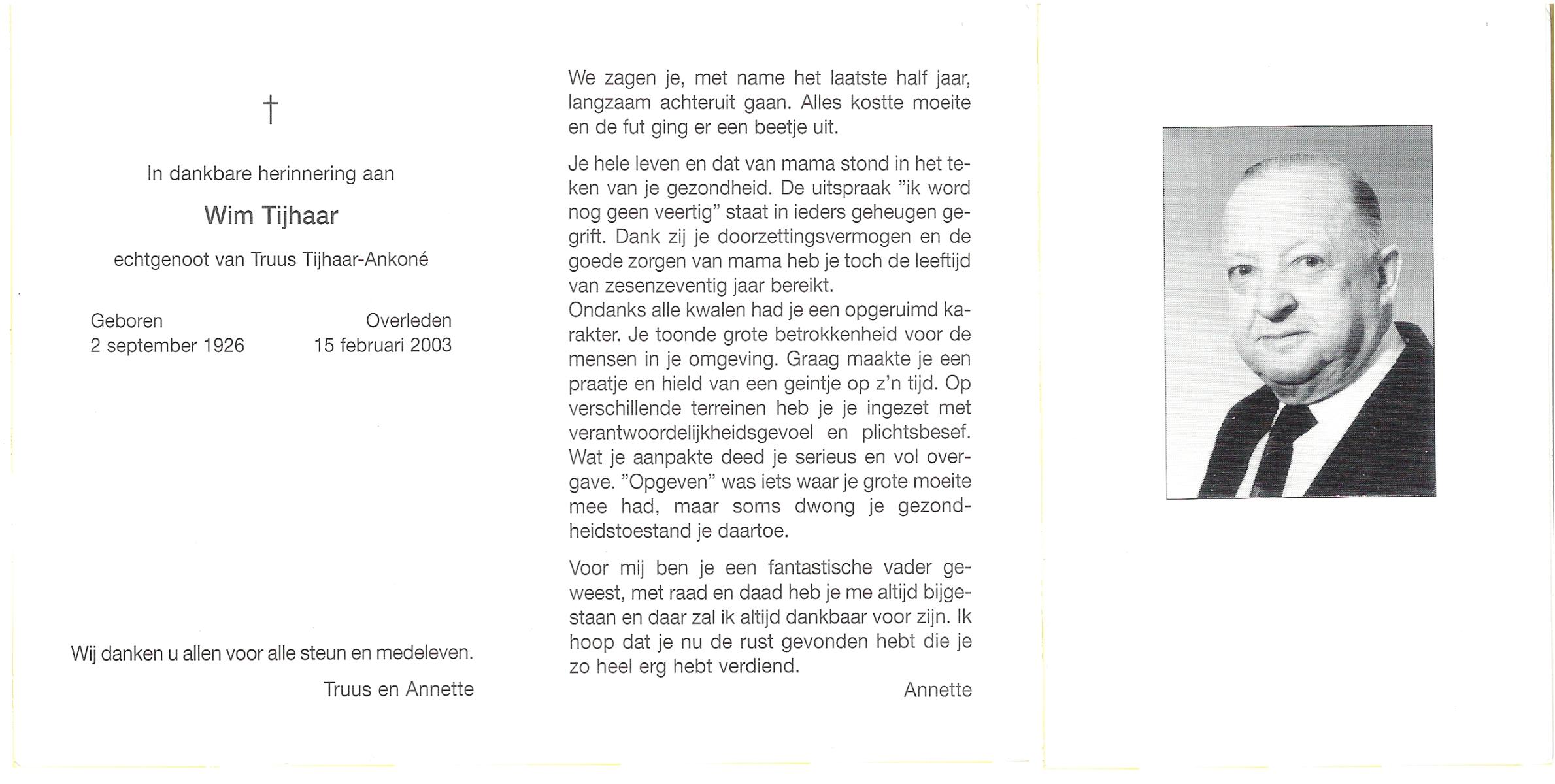 TIJHAAR, Wim, geboren op 2-9-1926, overleden op 15-2-2003 op 76-jarige leeftijd.
