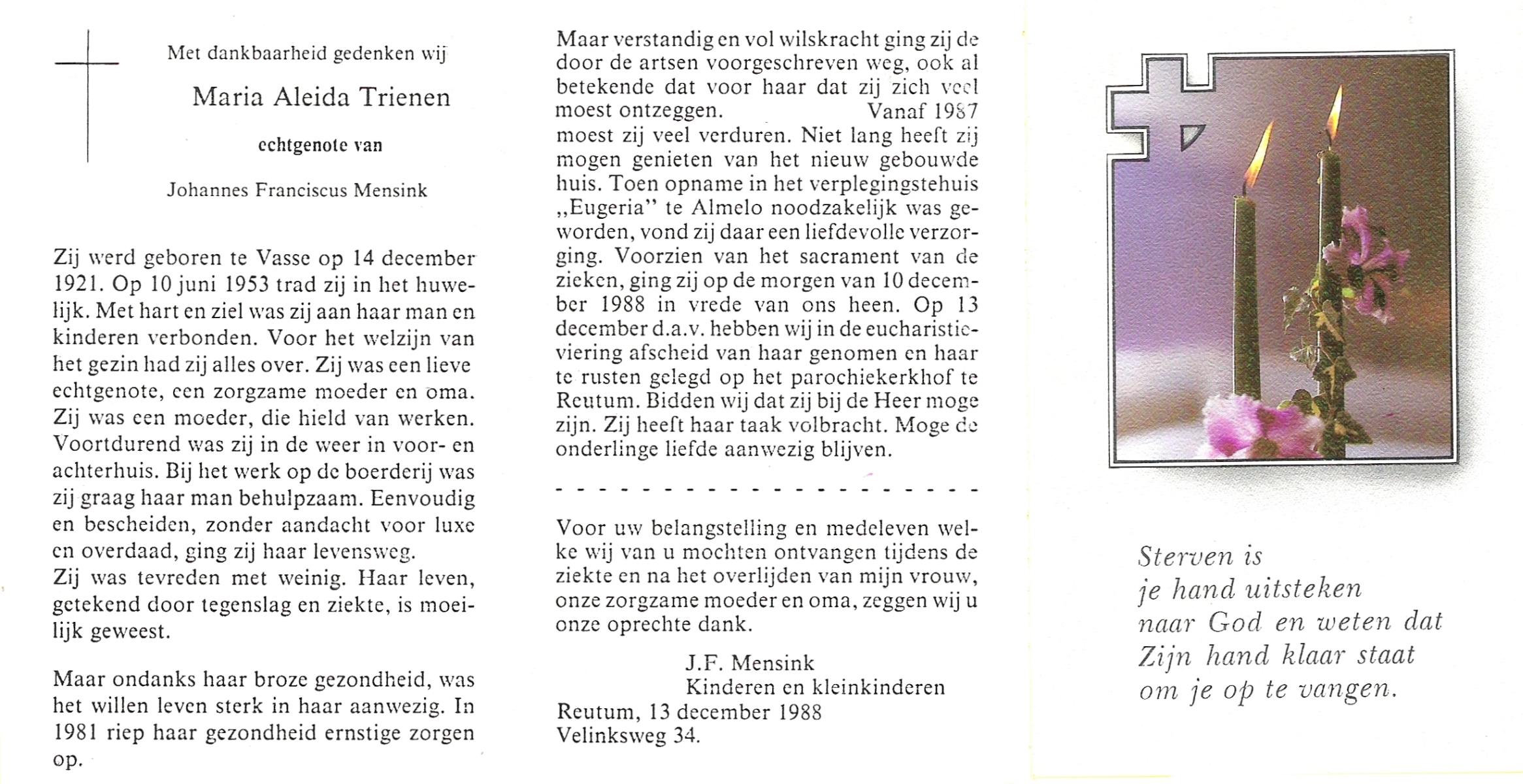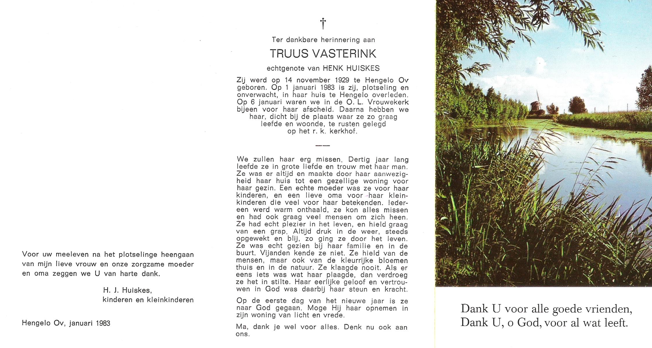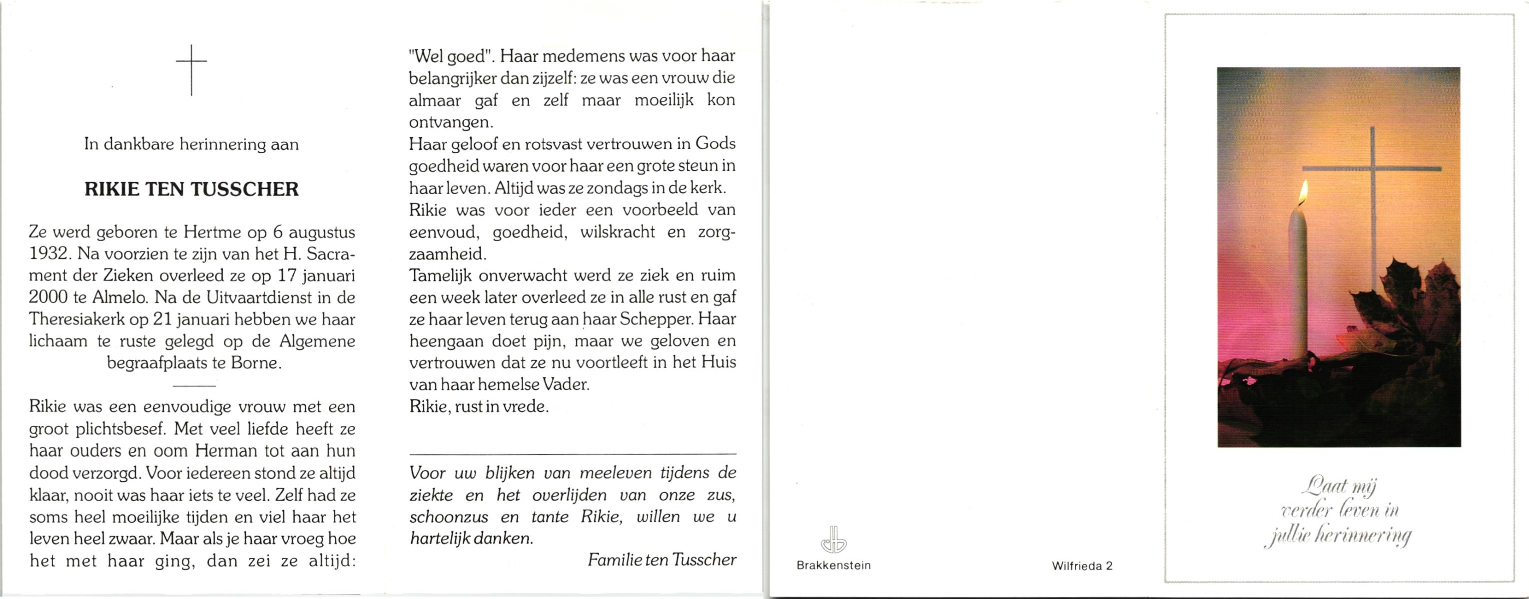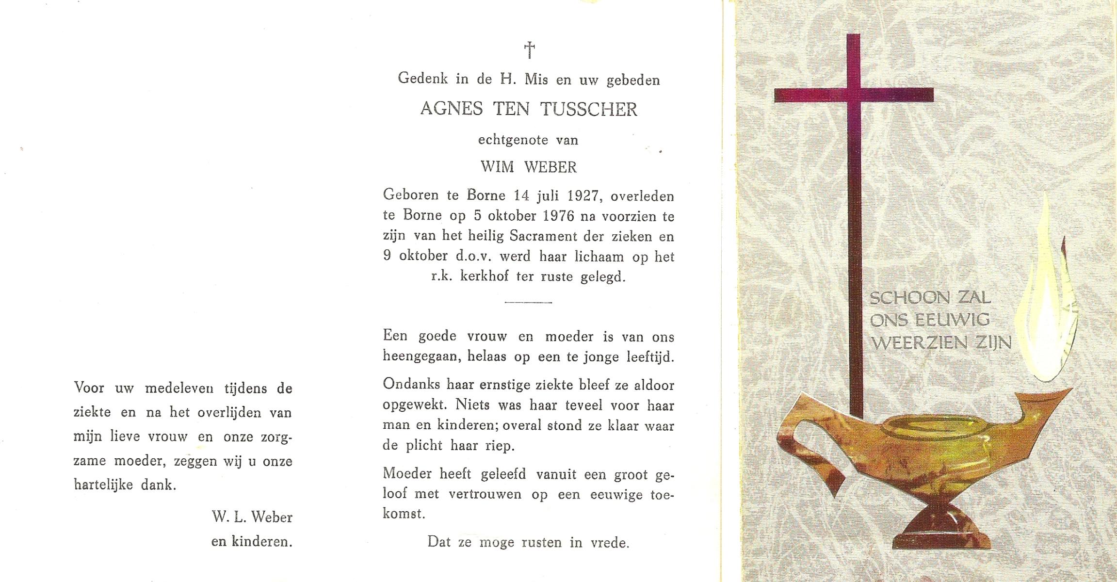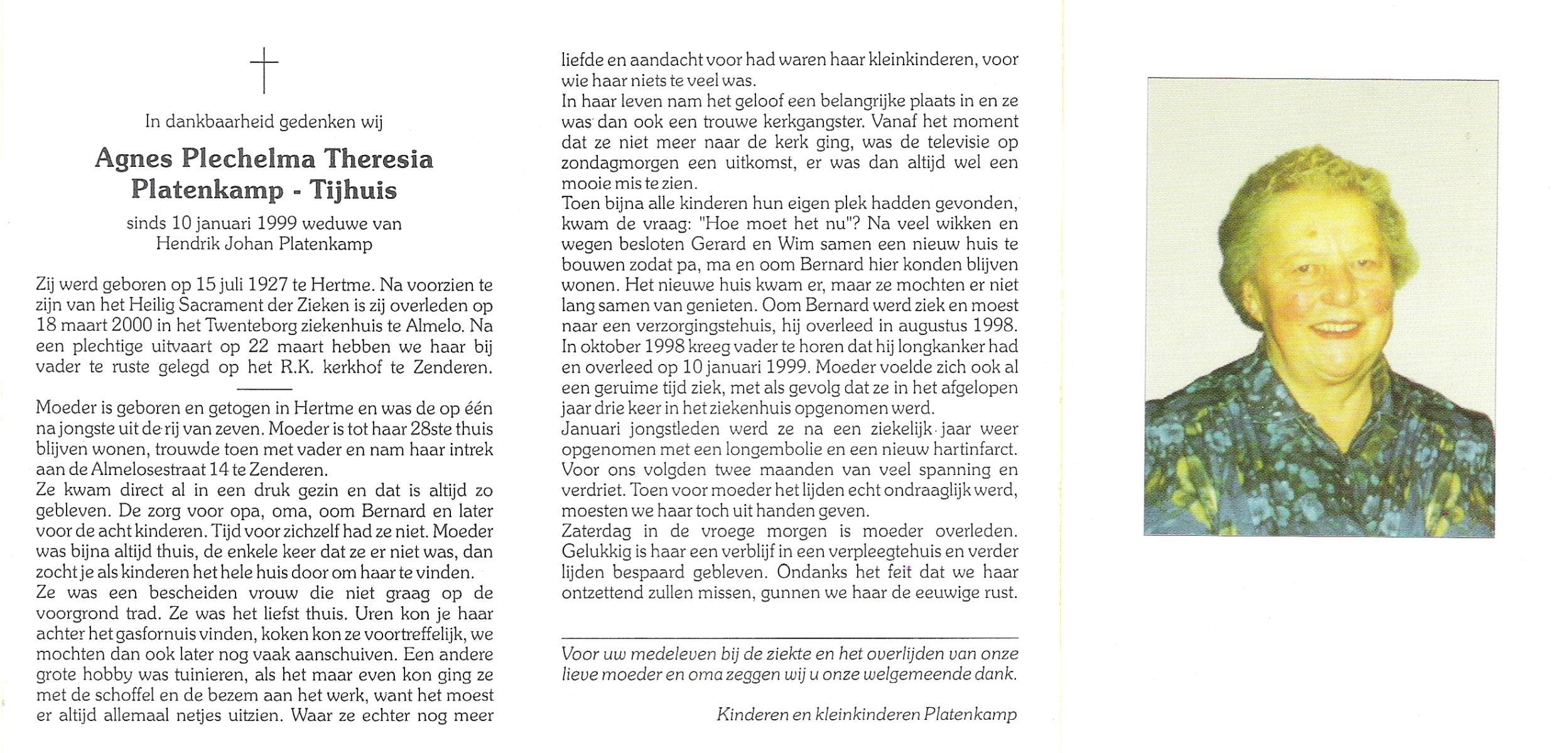 TIJHUIS, Agnes Plechelma Theresia, geboren op 15-7-1927 te Hertme, overleden op 18-3-2000 te Almelo op 72-jarige leeftijd, begraven op 22-3-2000 te Zenderen.