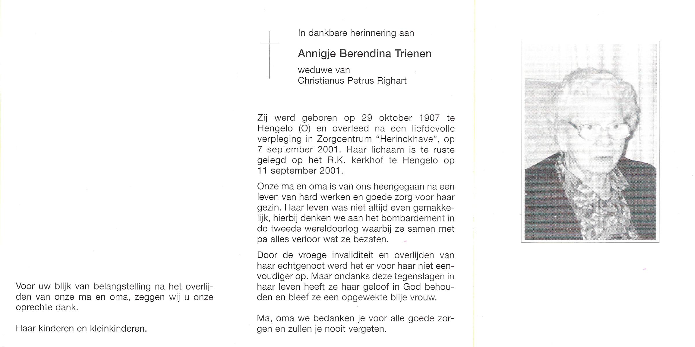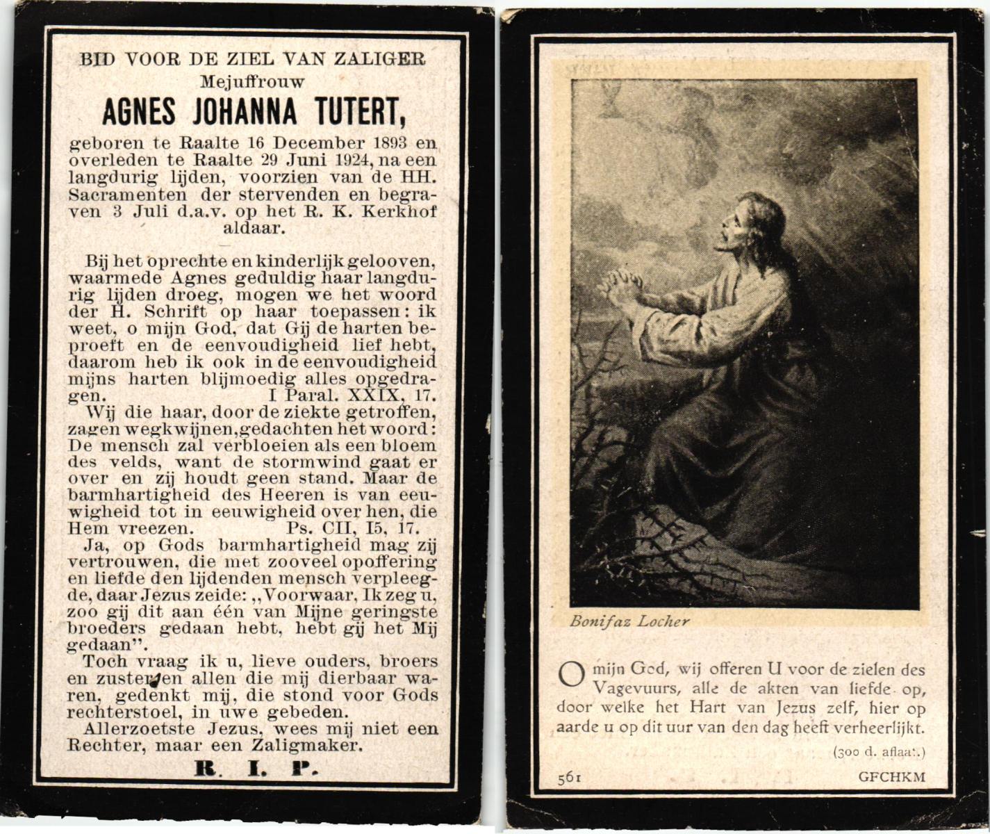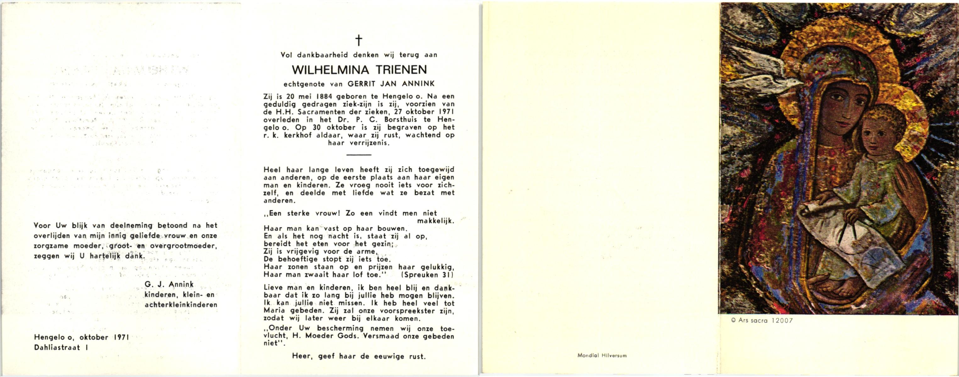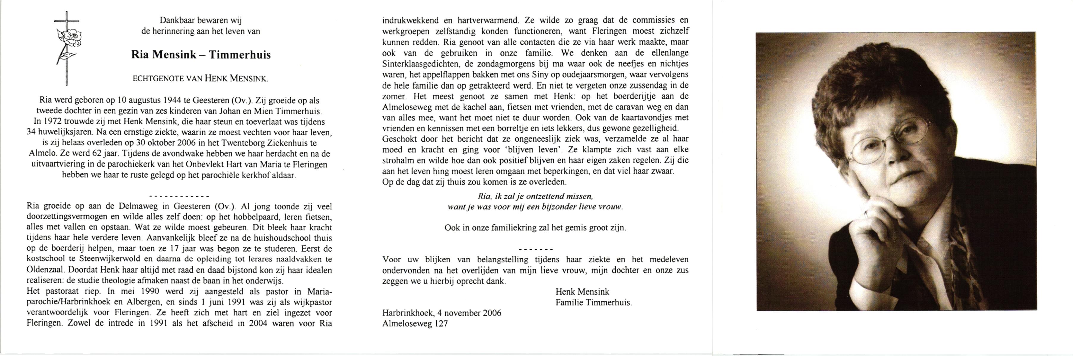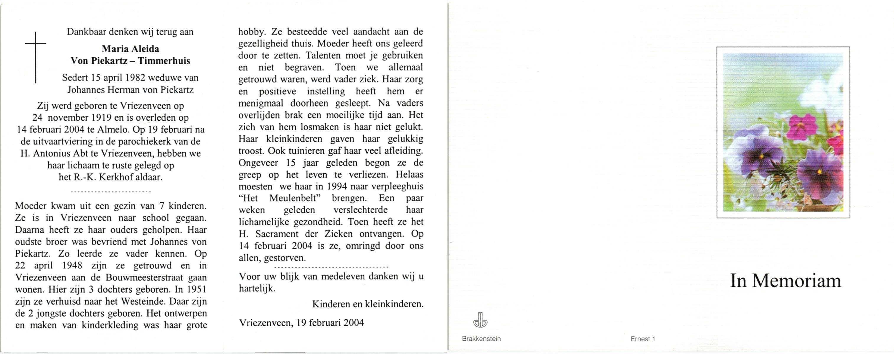 TIJHUIS, Agnes Plechelma Theresia, geboren op 15-7-1927 te Hertme, overleden op 18-3-2000 te Almelo op 72-jarige leeftijd, begraven op 22-3-2000 te Zenderen.