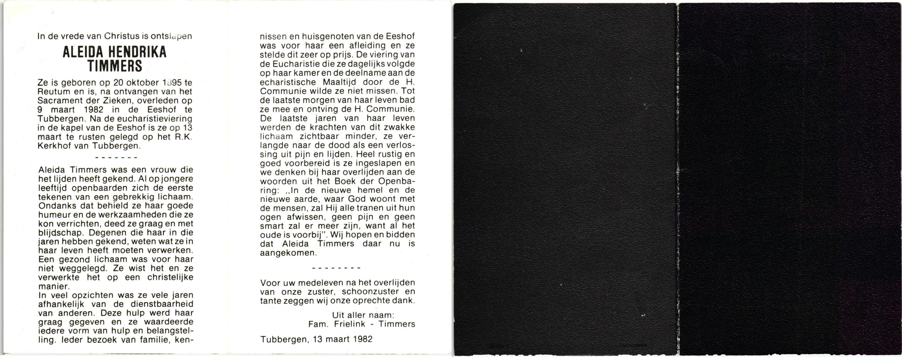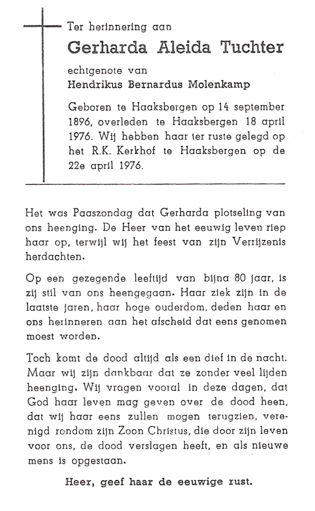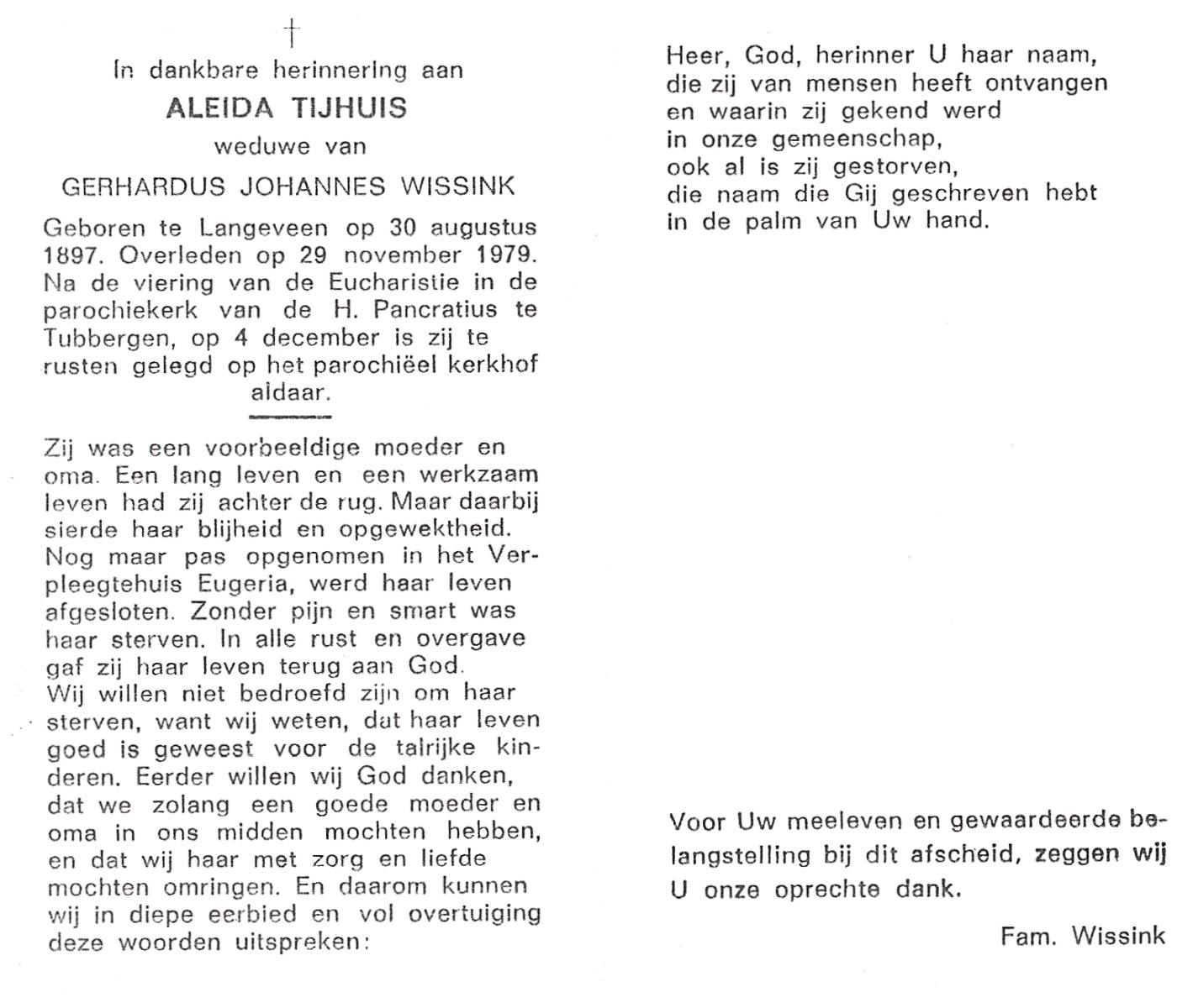TIJHUIS, Aleida, geboren op 30-08-1897 te Langeveen, overleden op 29-11-1979 op 82-jarige leeftijd, begraven op 4-12-1979 te Tubbergen.