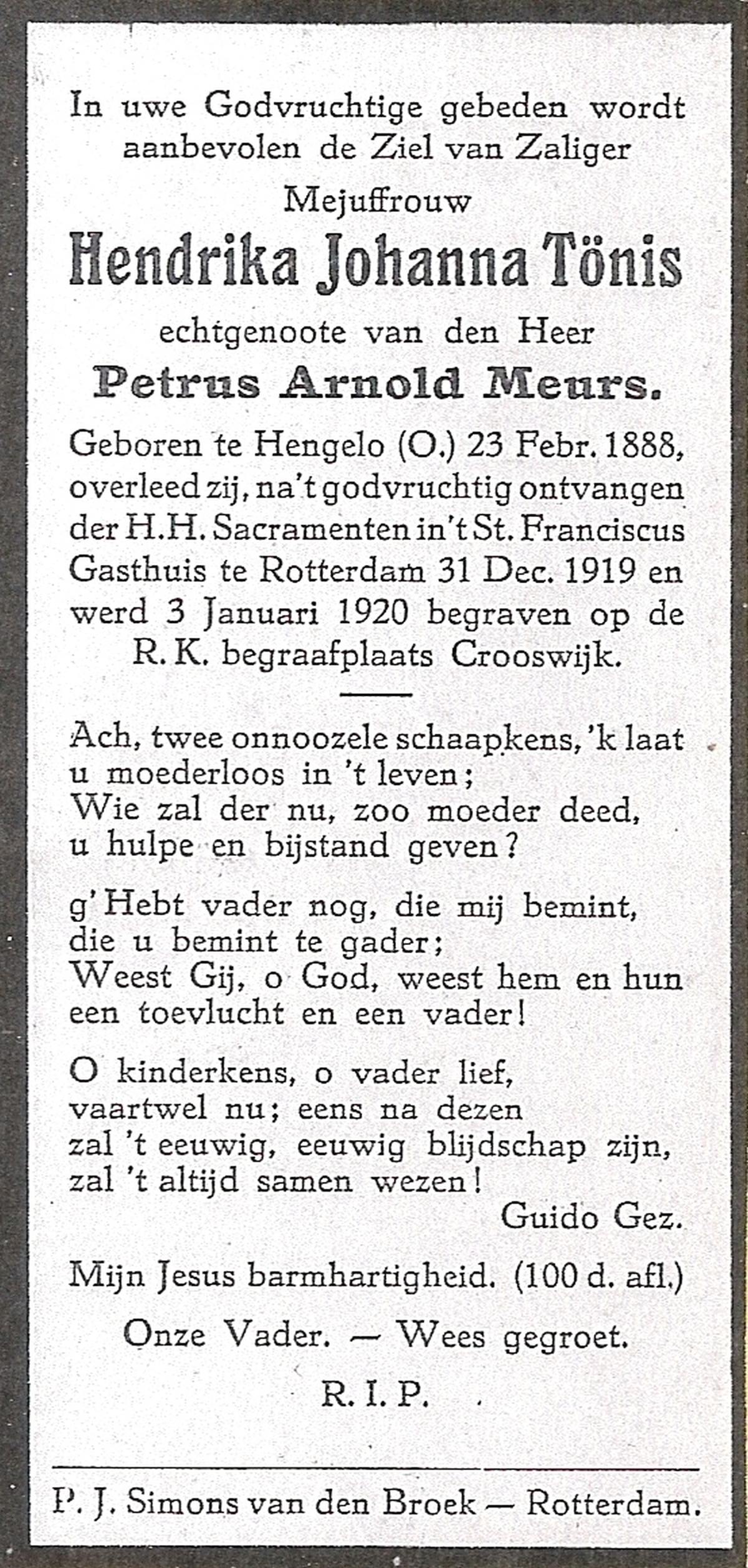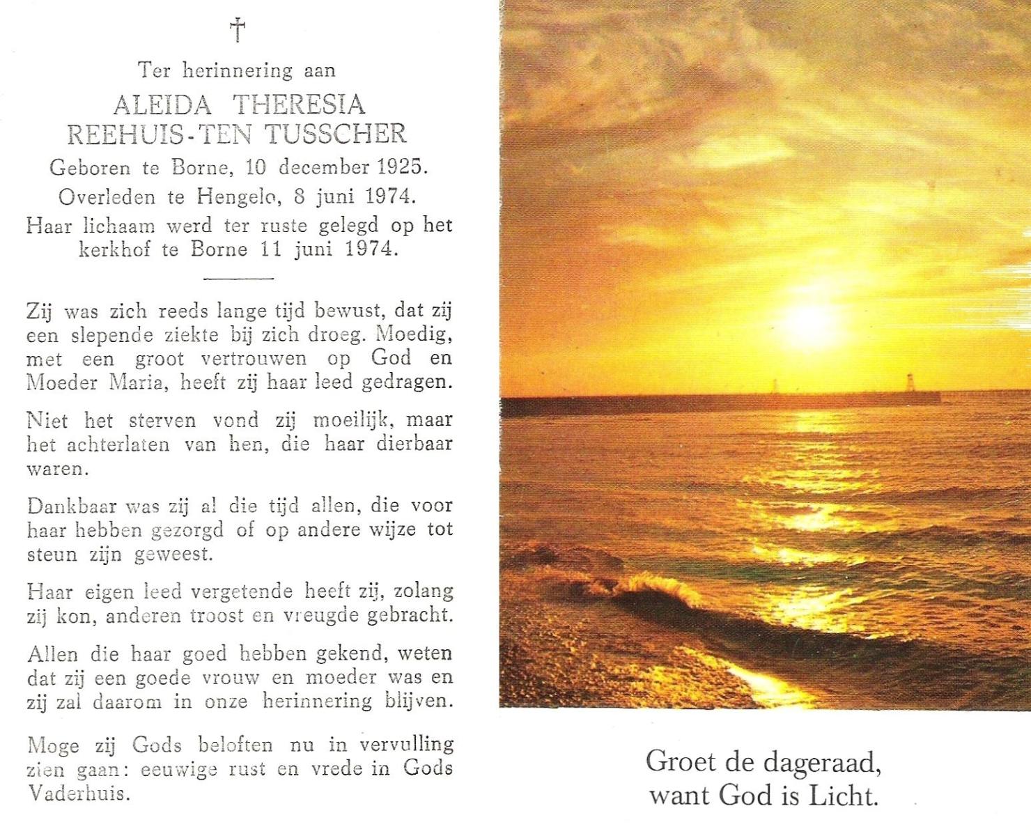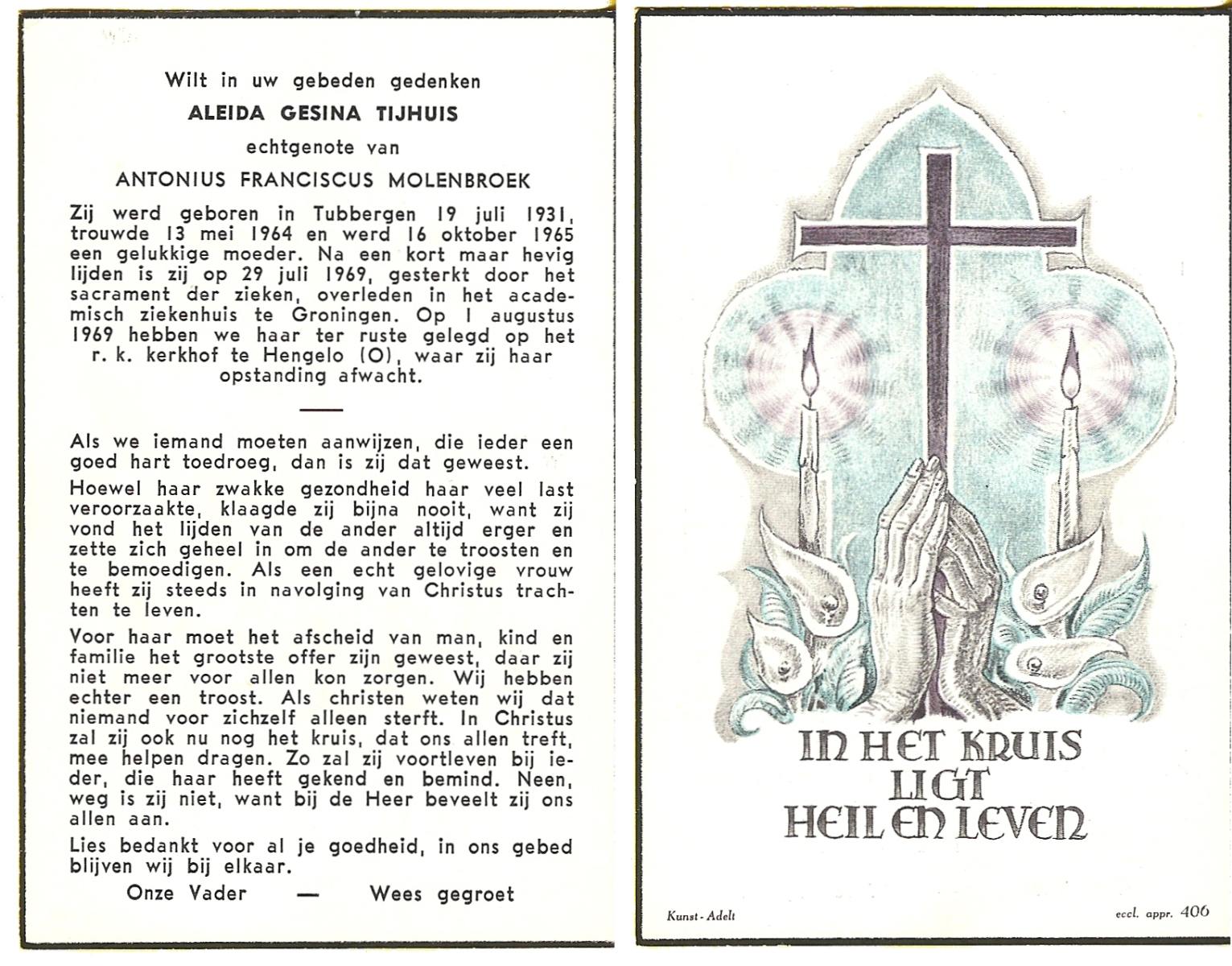 TIJHUIS, Aleida Gesina, geboren op 19-7-1931 te Tubbergen, overleden op 29-7-1969 te Groningen op 38-jarige leeftijd, begraven op 1-8-1969 te Hengelo (Ov.).