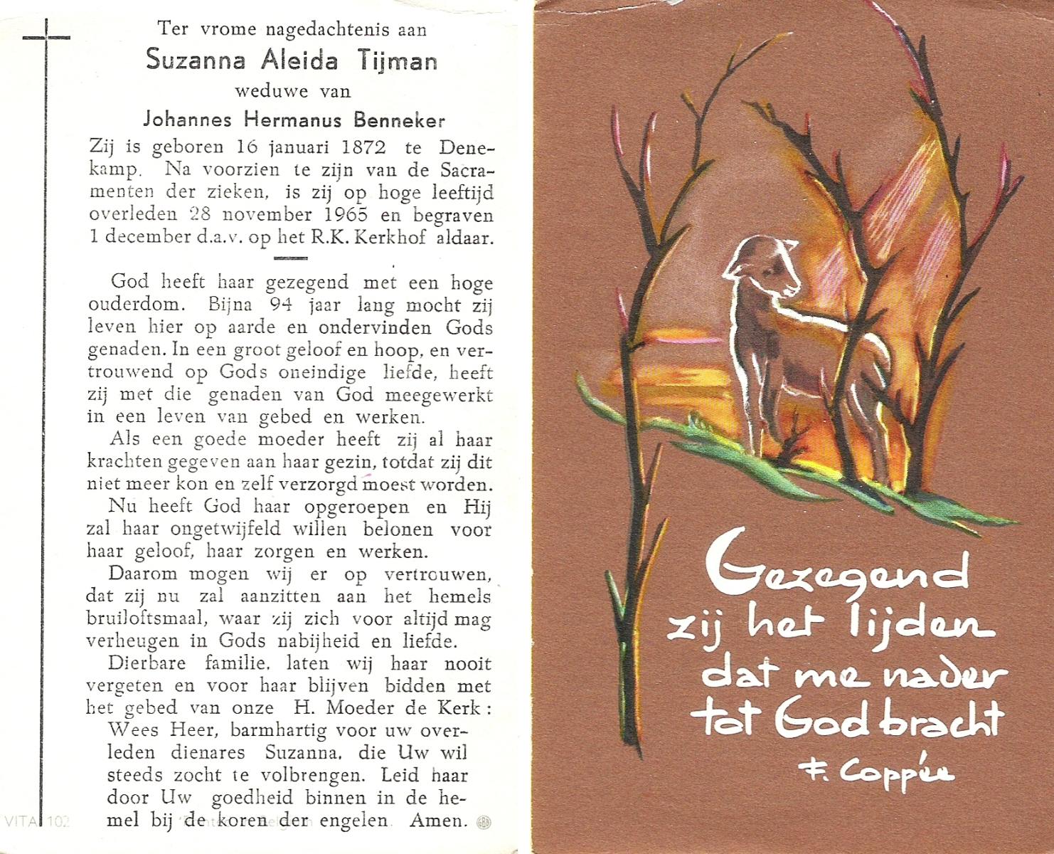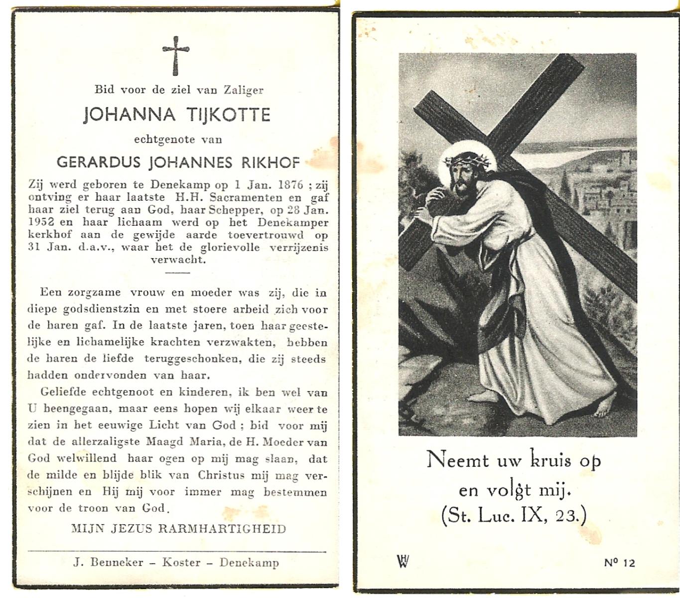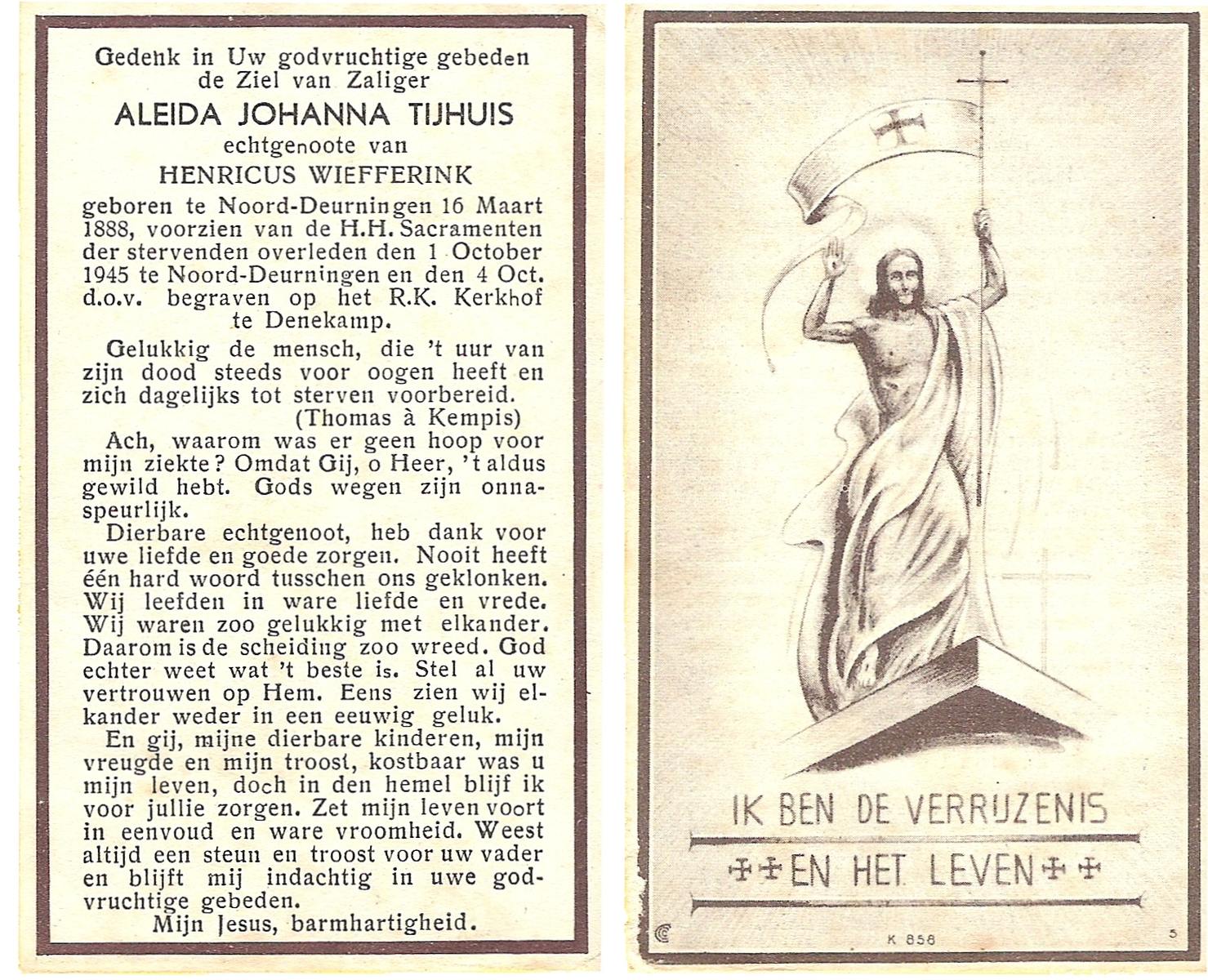 TIJHUIS, Aleida Johanna, geboren op 16-03-1888 te Noord Deurningen, overleden op 1-10-1945 te Noord Deurningen op 58-jarige leeftijd, begraven op 4-10-1945 te Denekamp.