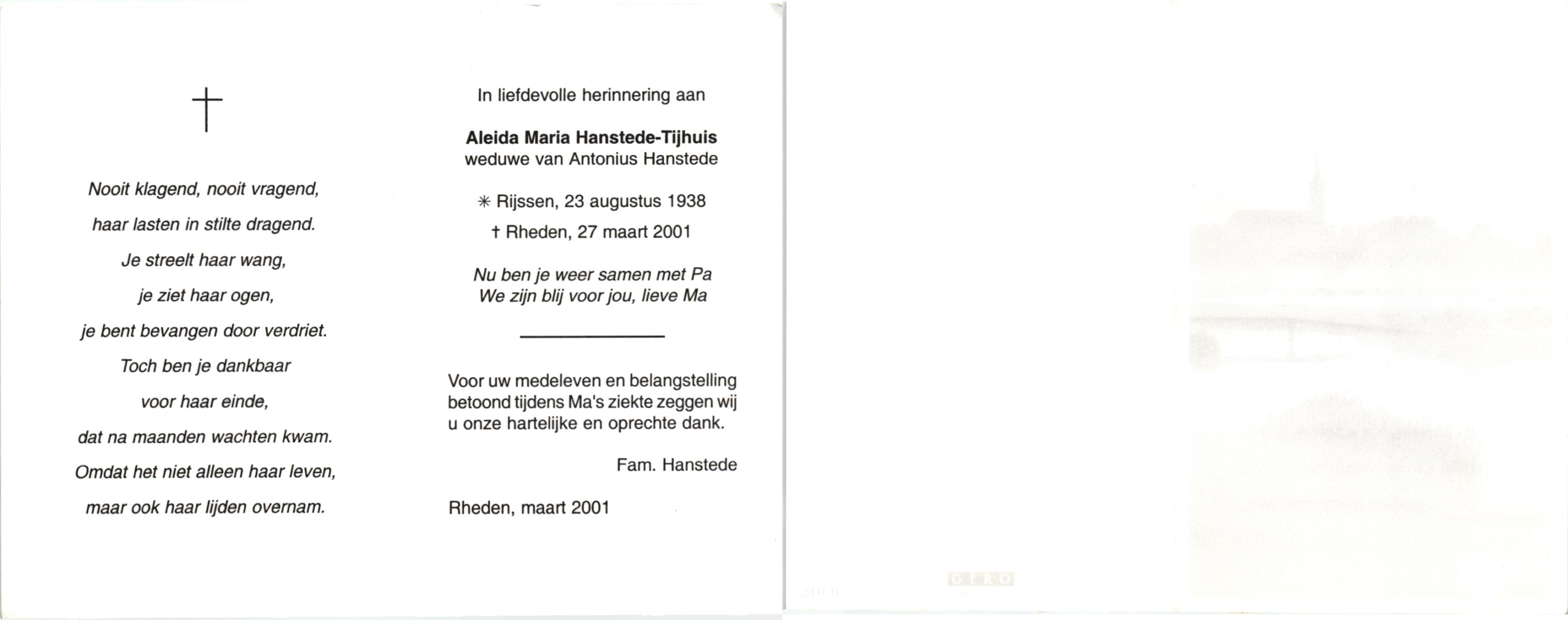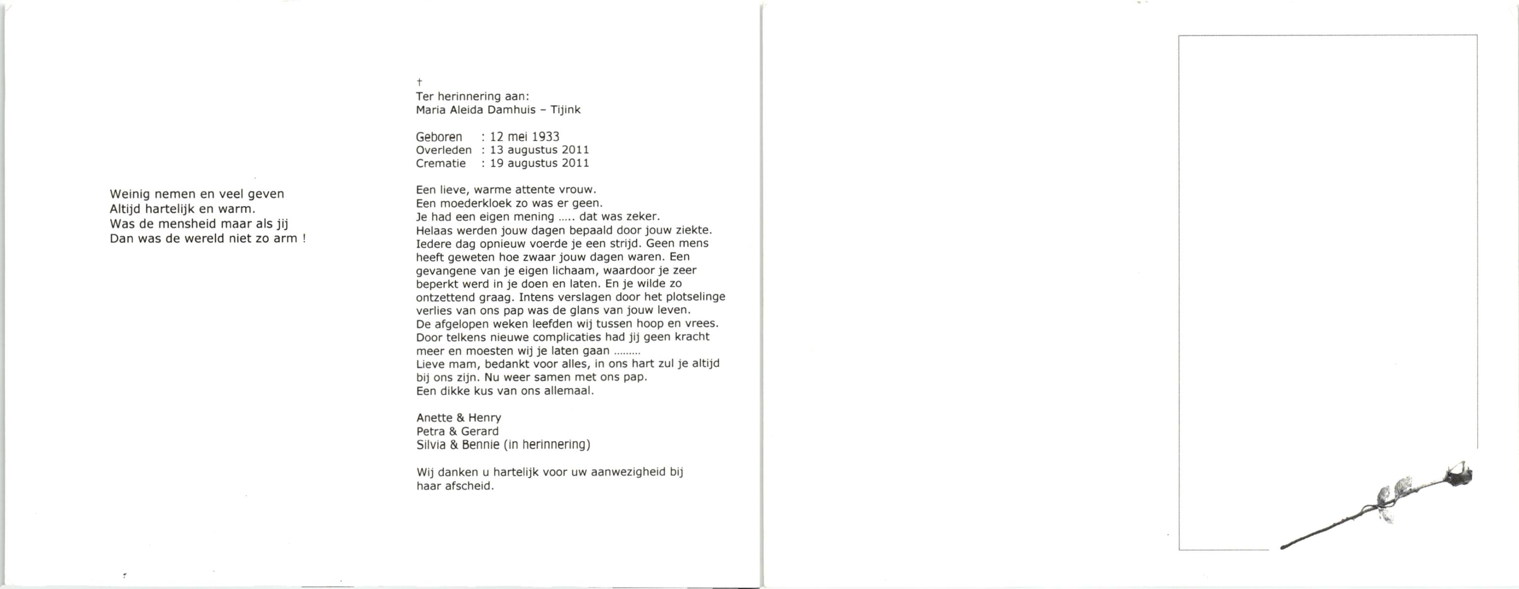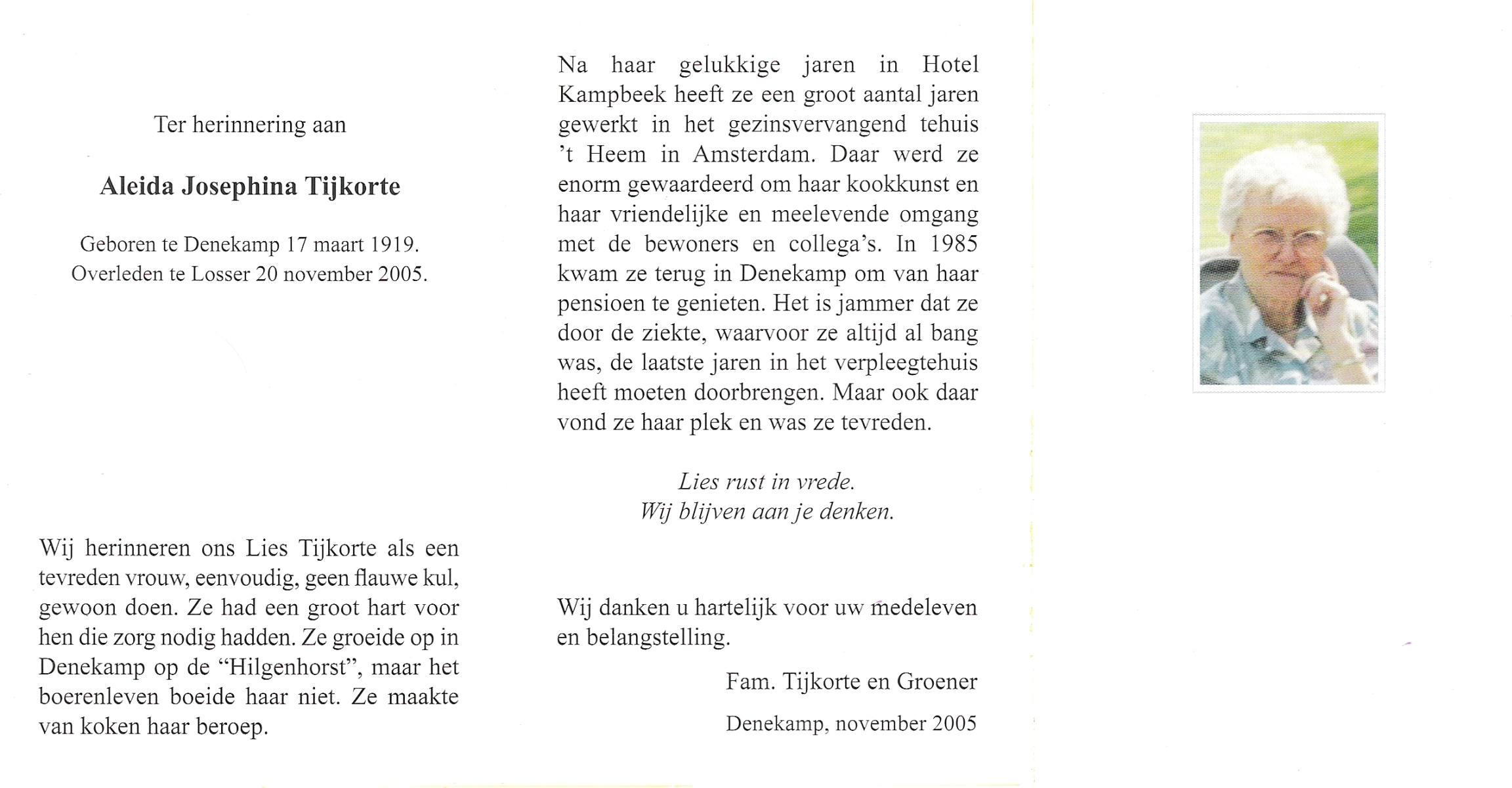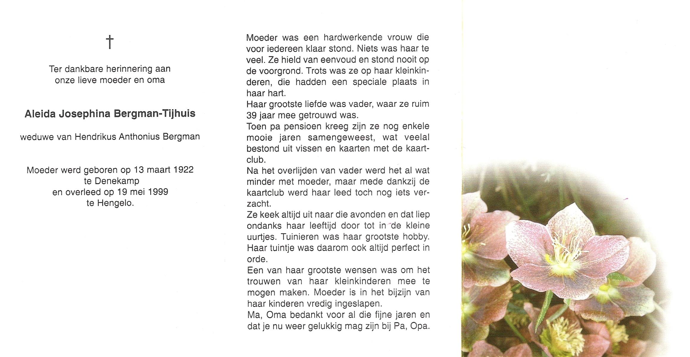 TIJHUIS, Aleida Josephina, geboren op 13-3-1922 te Denekamp, overleden op 19-5-1999 te Hengelo (Ov.) op 77-jarige leeftijd.