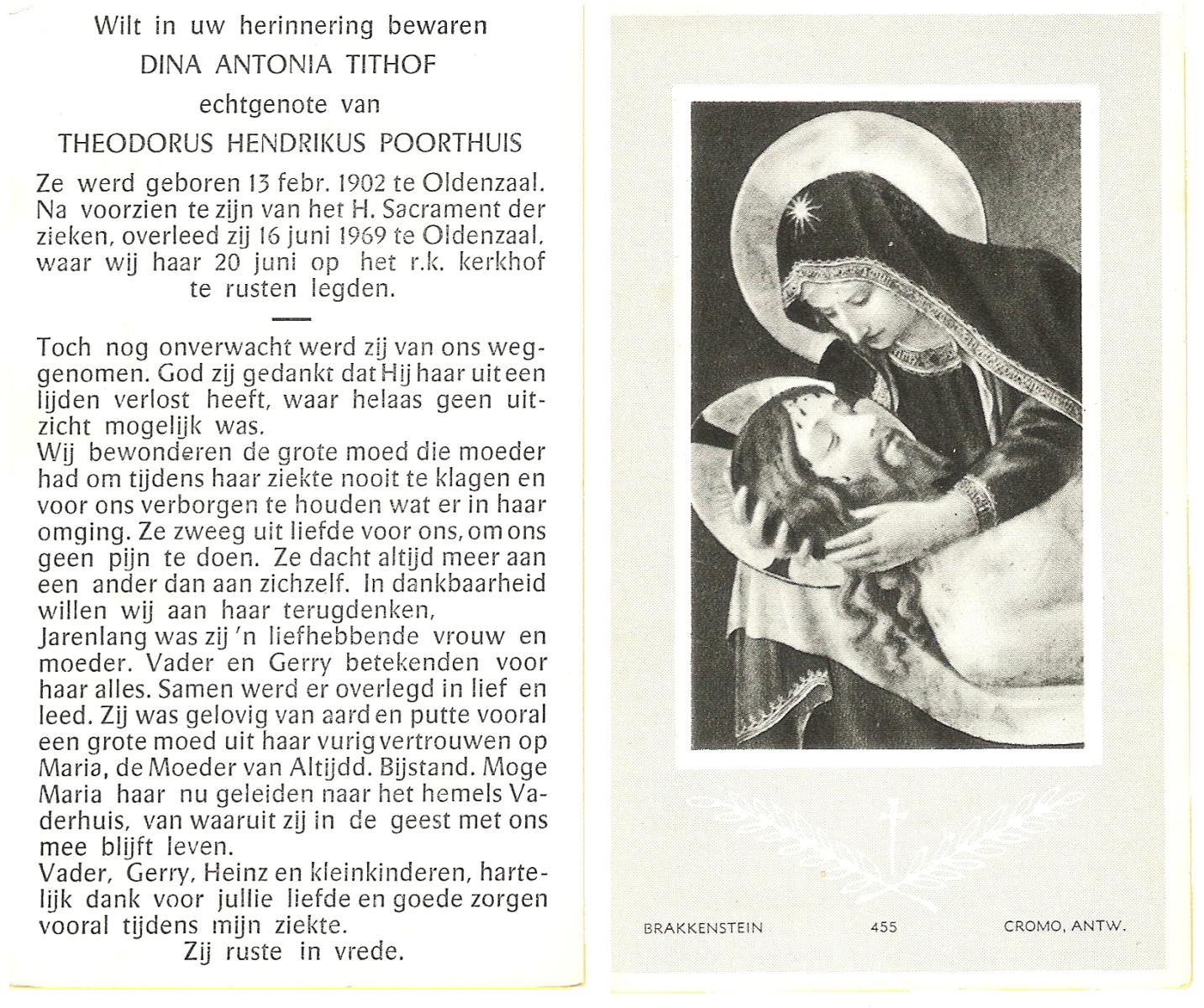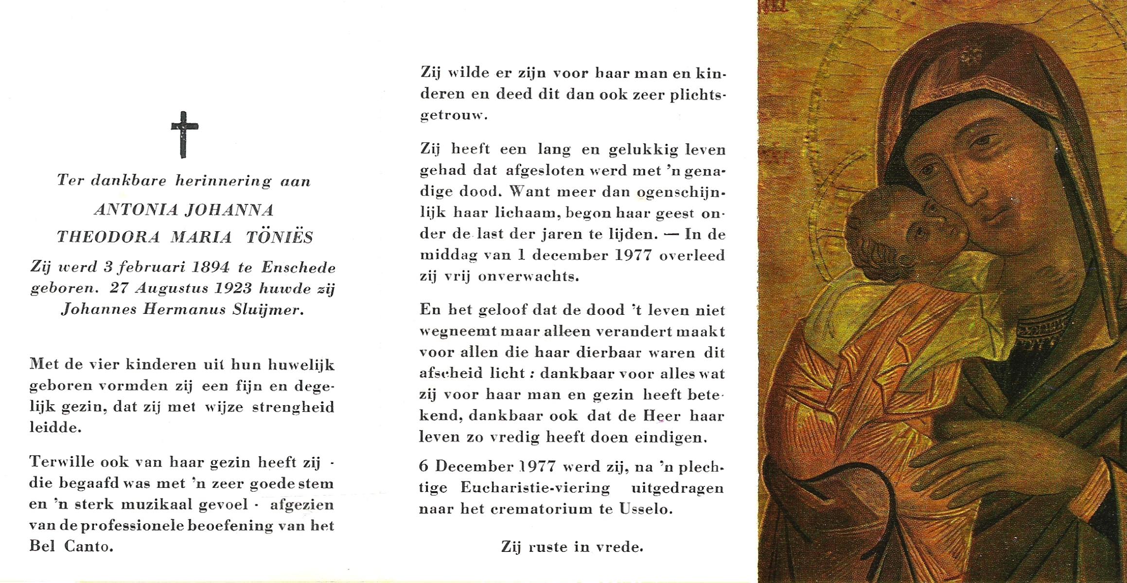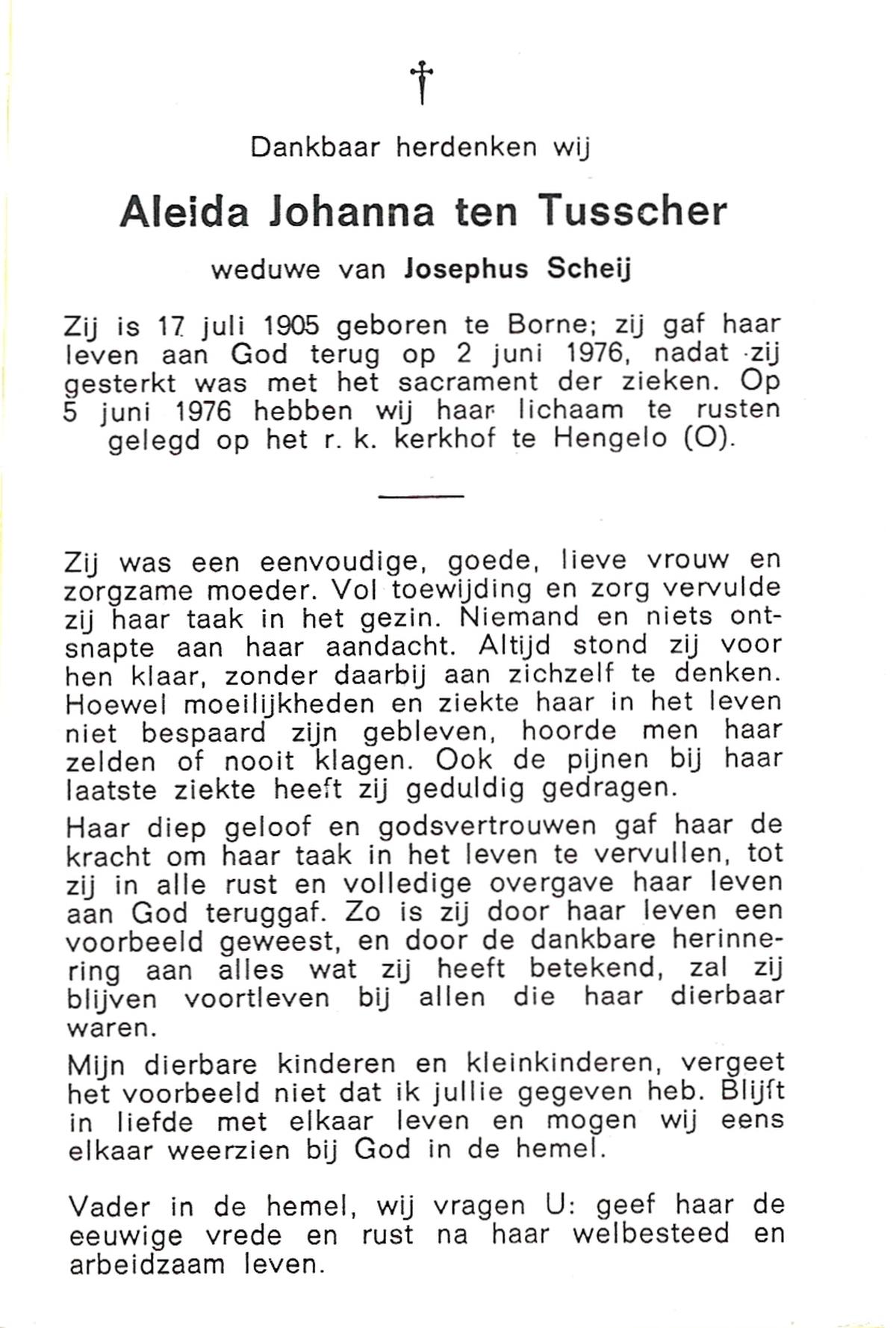 TIJHUIS, Aleida Josephina, geboren op 13-3-1922 te Denekamp, overleden op 19-5-1999 te Hengelo (Ov.) op 77-jarige leeftijd.