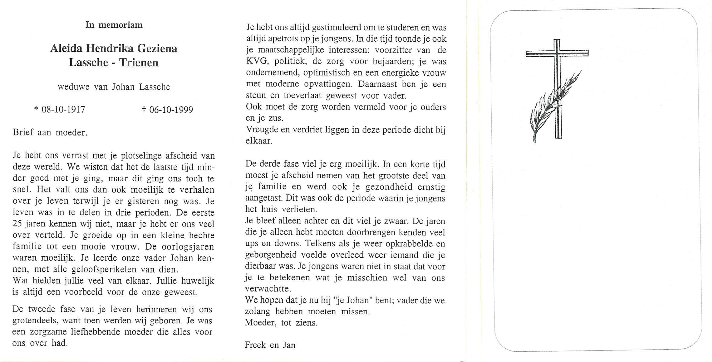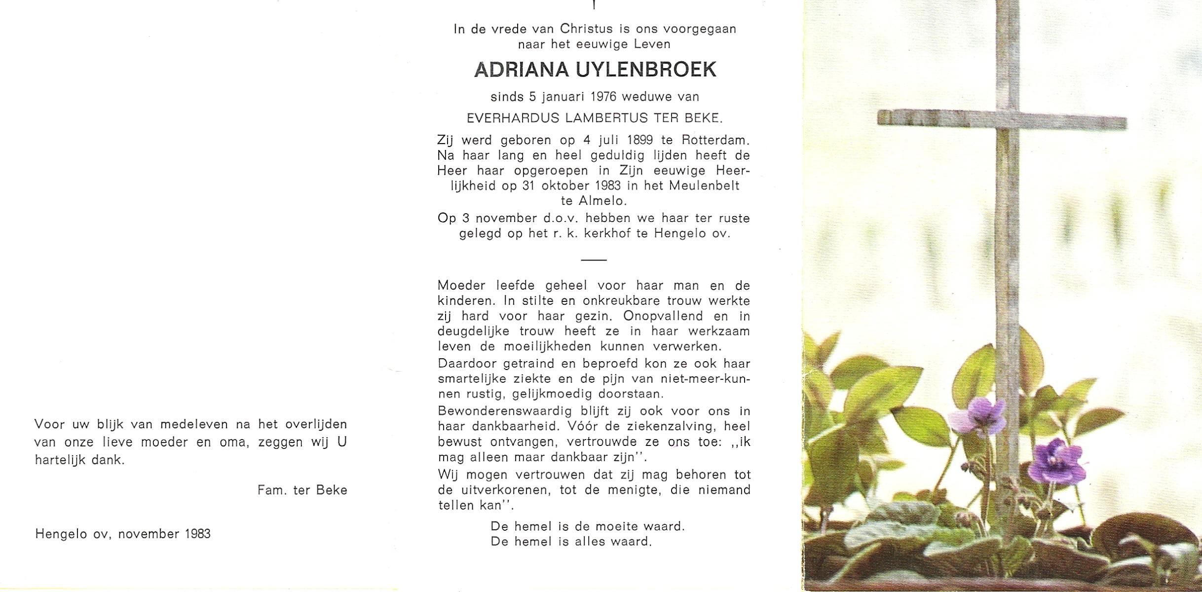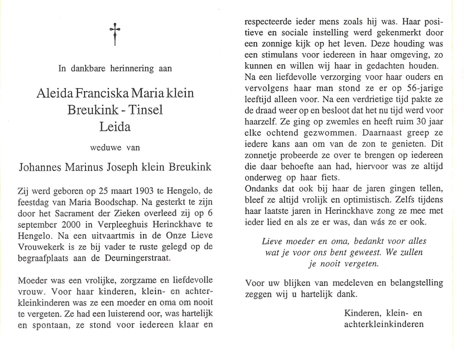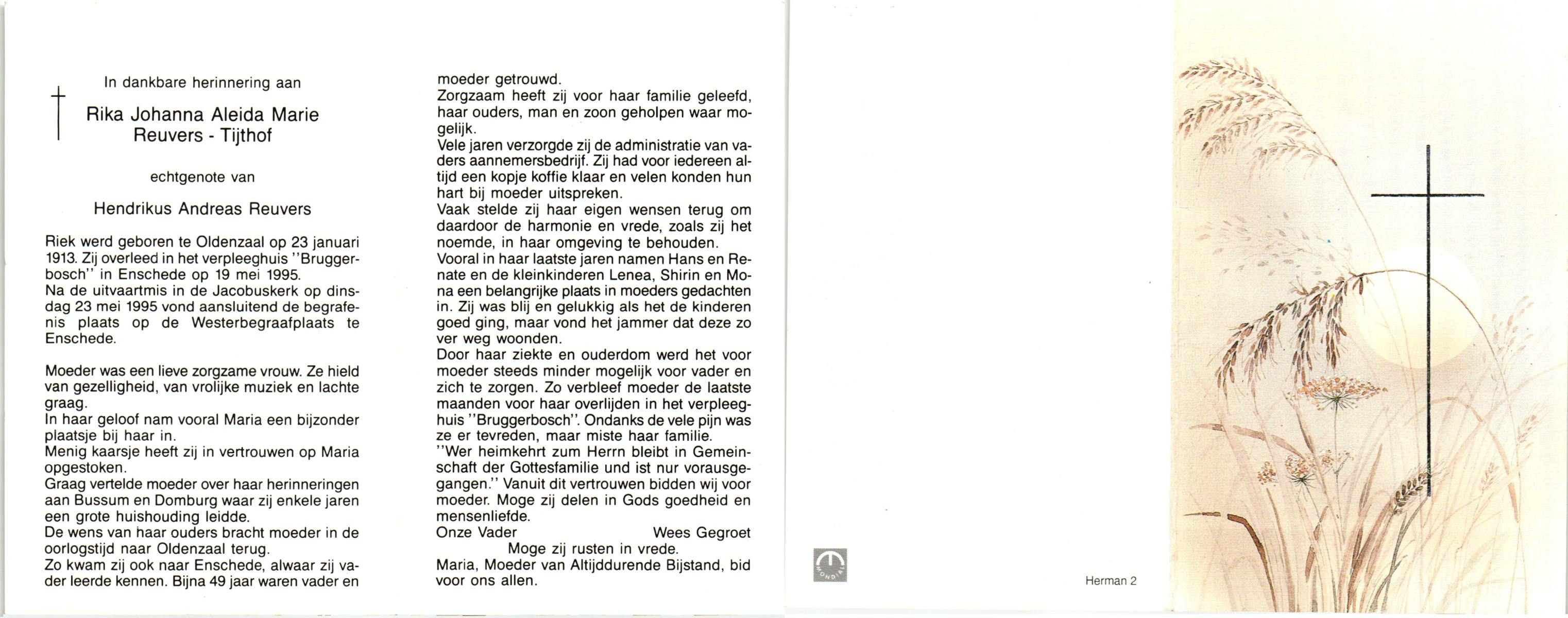 TIJHUIS, Aleida Josephina, geboren op 13-3-1922 te Denekamp, overleden op 19-5-1999 te Hengelo (Ov.) op 77-jarige leeftijd.