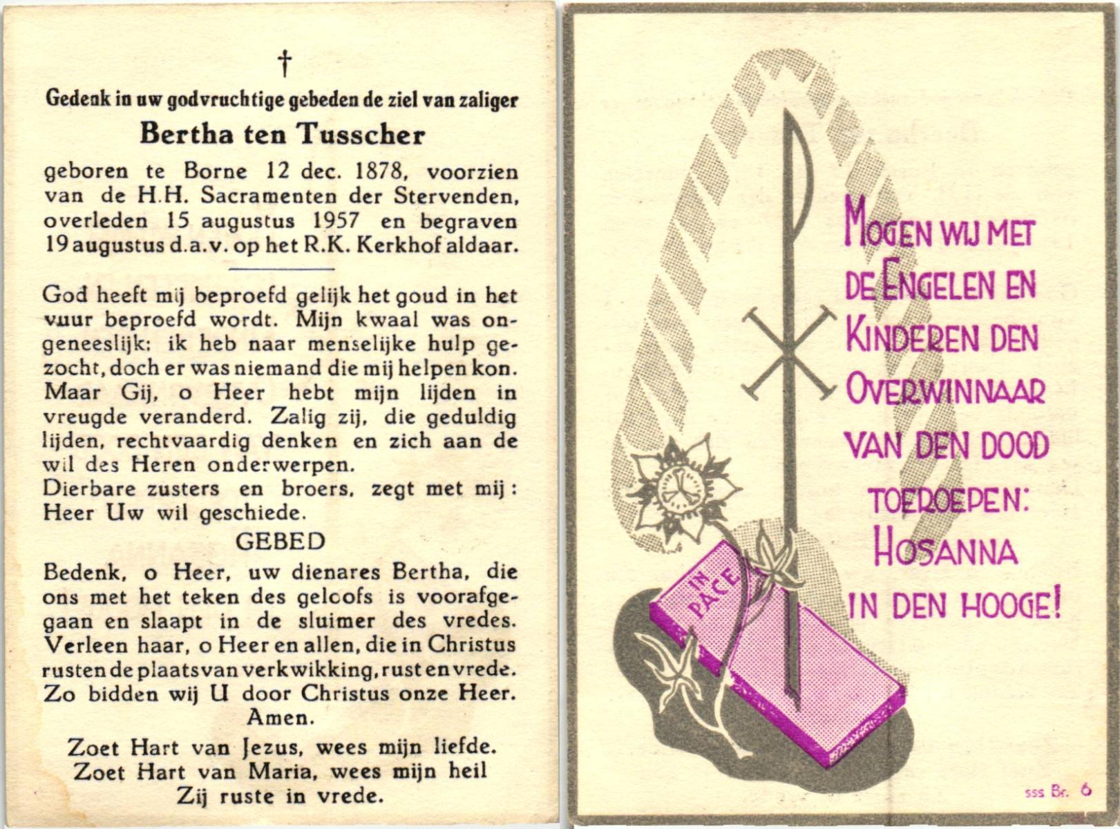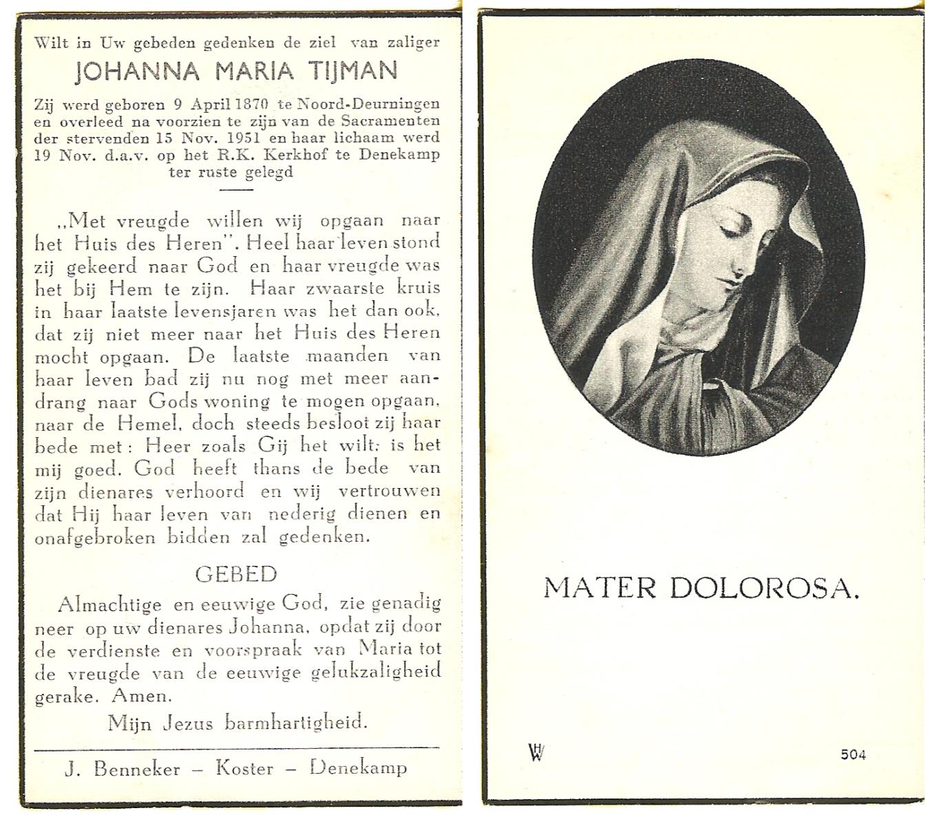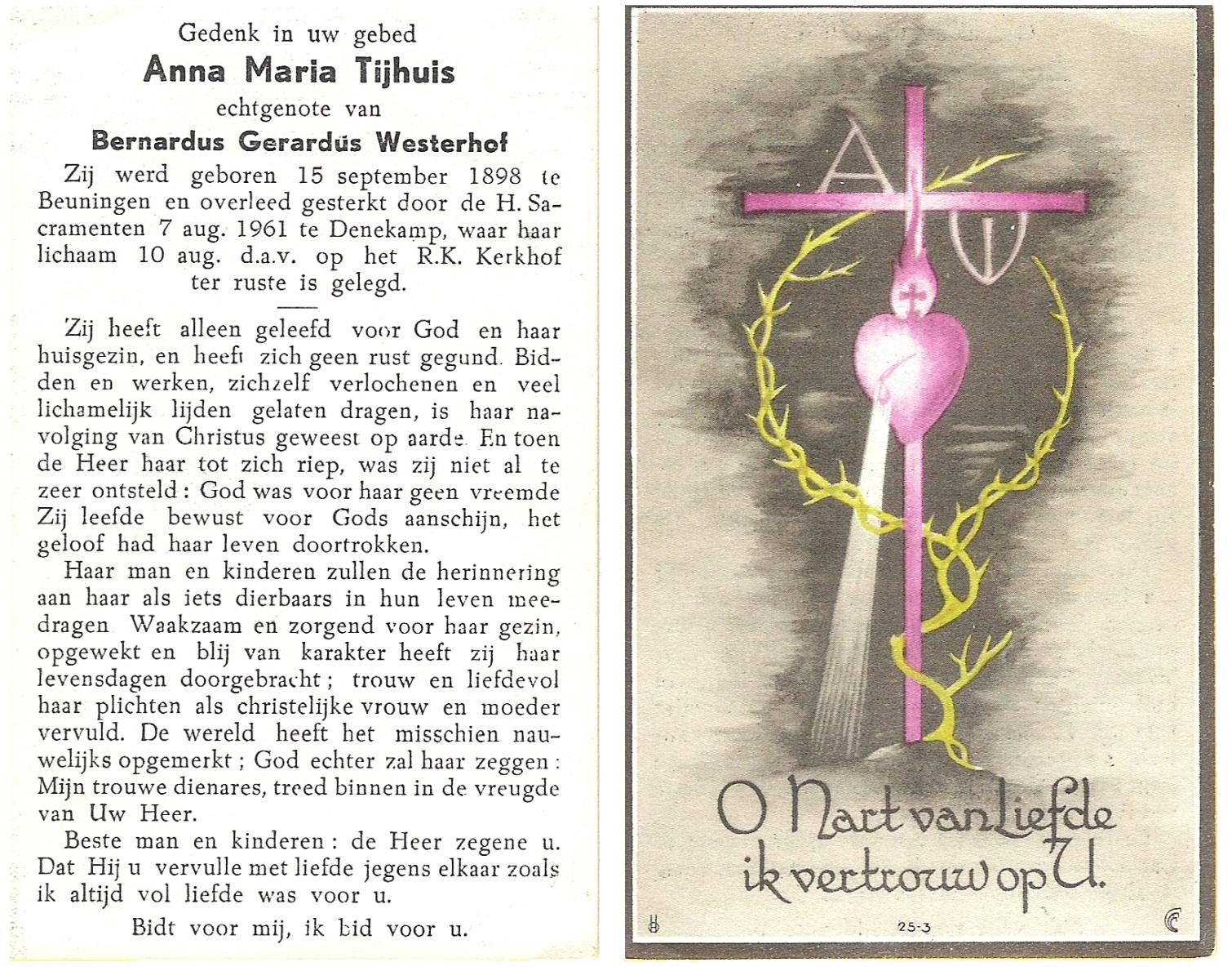 TIJHUIS, Anna Maria, geboren op 15-09-1898 te Beuningen (Ov.), overleden op 7-8-1961 te Denekamp op 62-jarige leeftijd, begraven op 10-8-1961 te Denekamp R.K.kerkhof.
