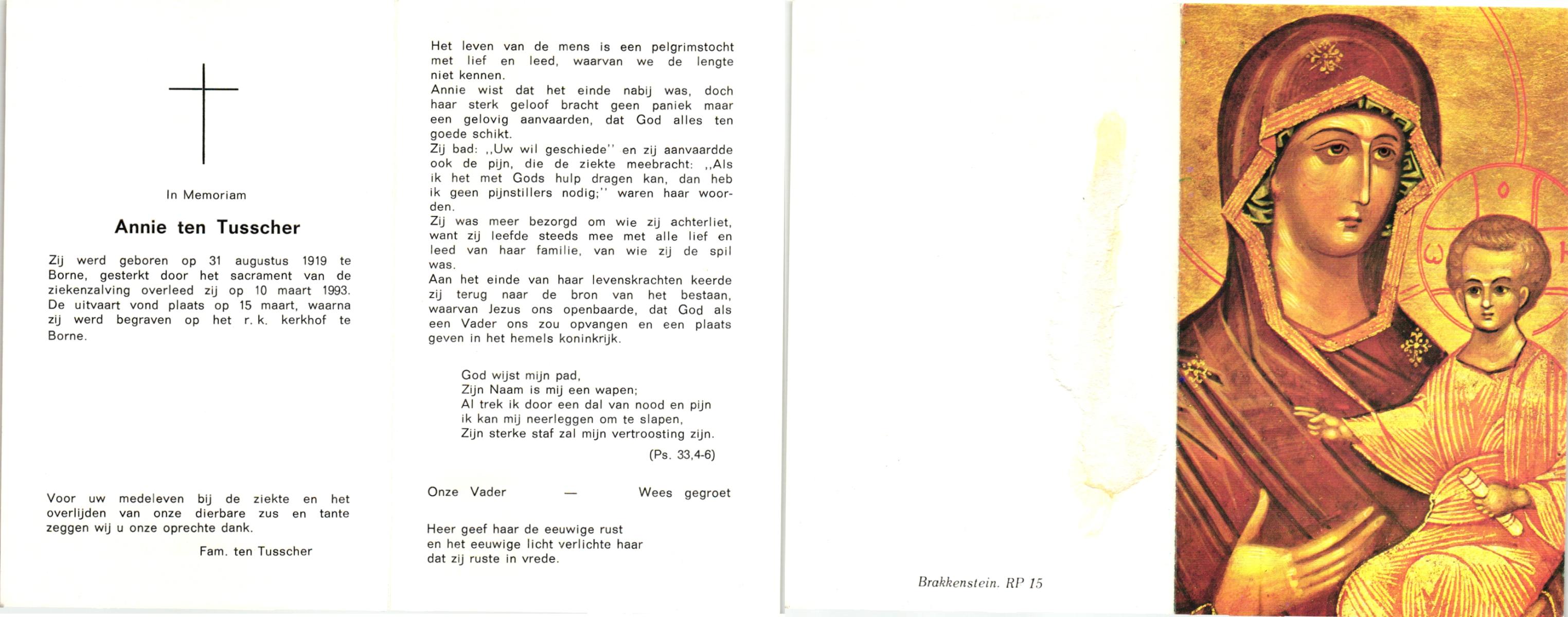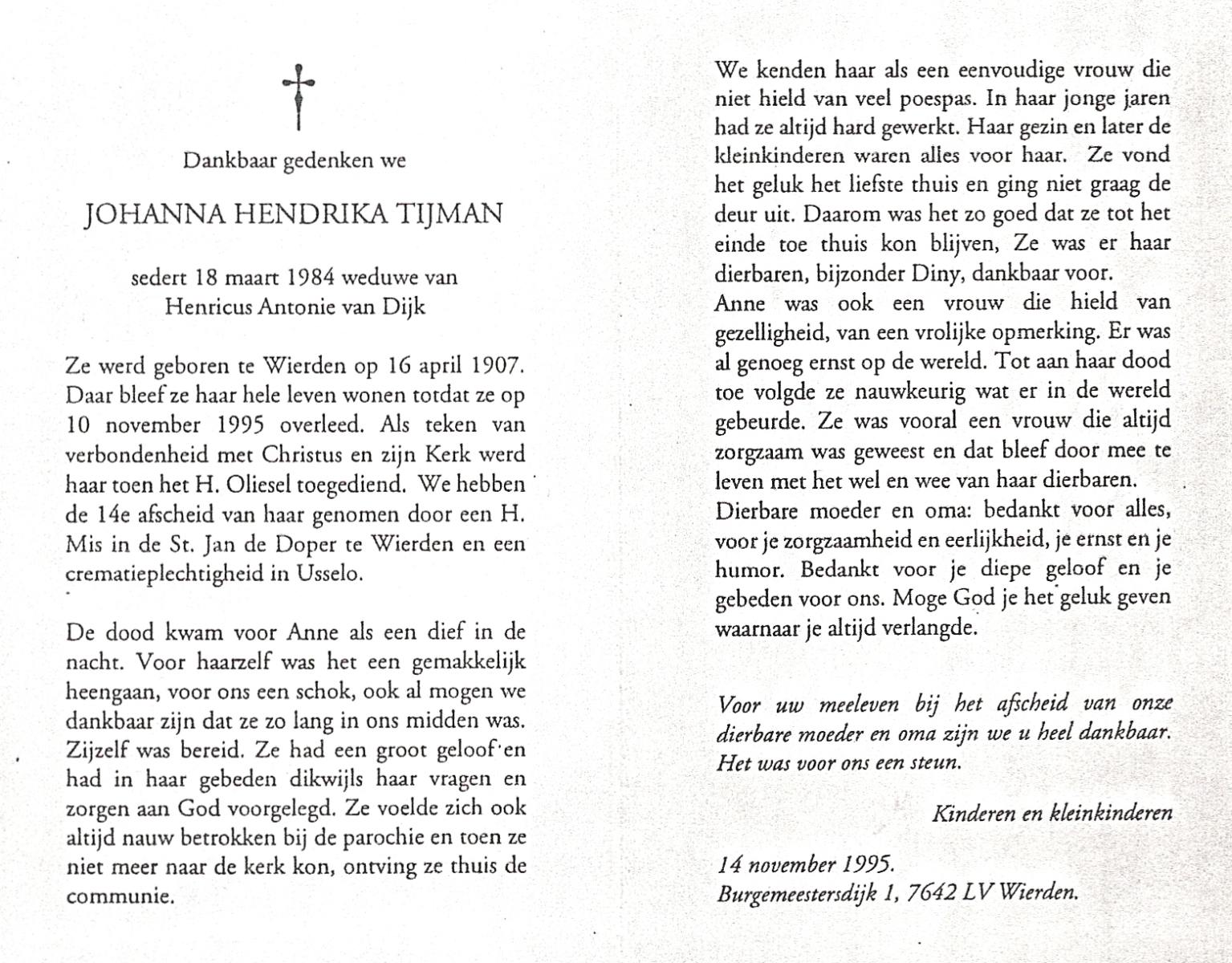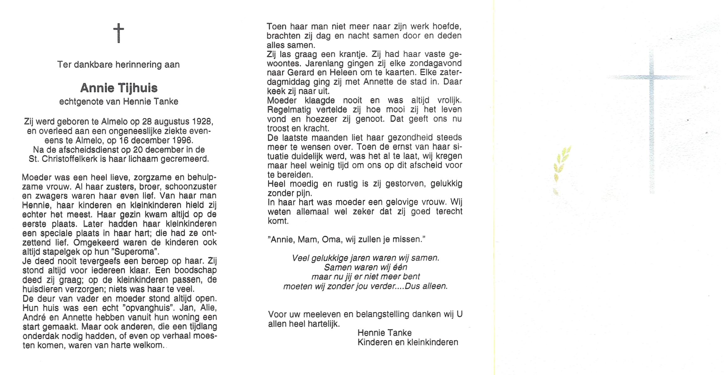 TIJHUIS, Annie, geboren op 28-8-1928 te Almelo, overleden op 16-12-1996 op 68-jarige leeftijd, gecremeerd op 20-12-1996 te Almelo.