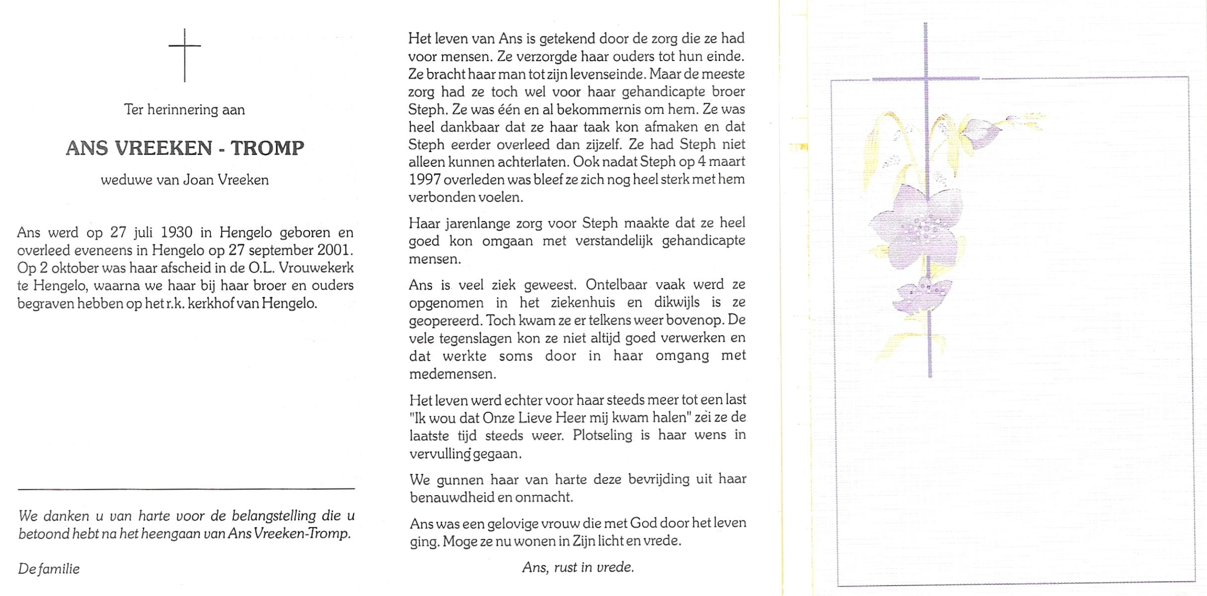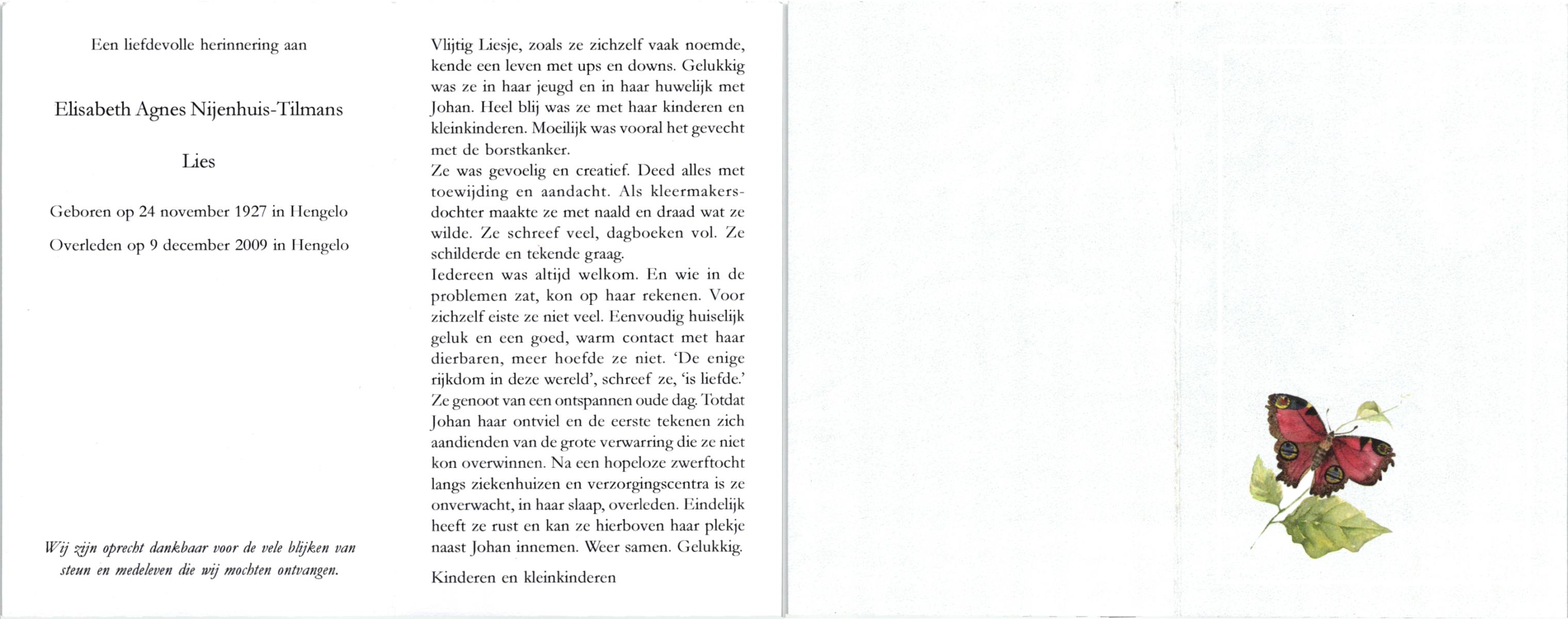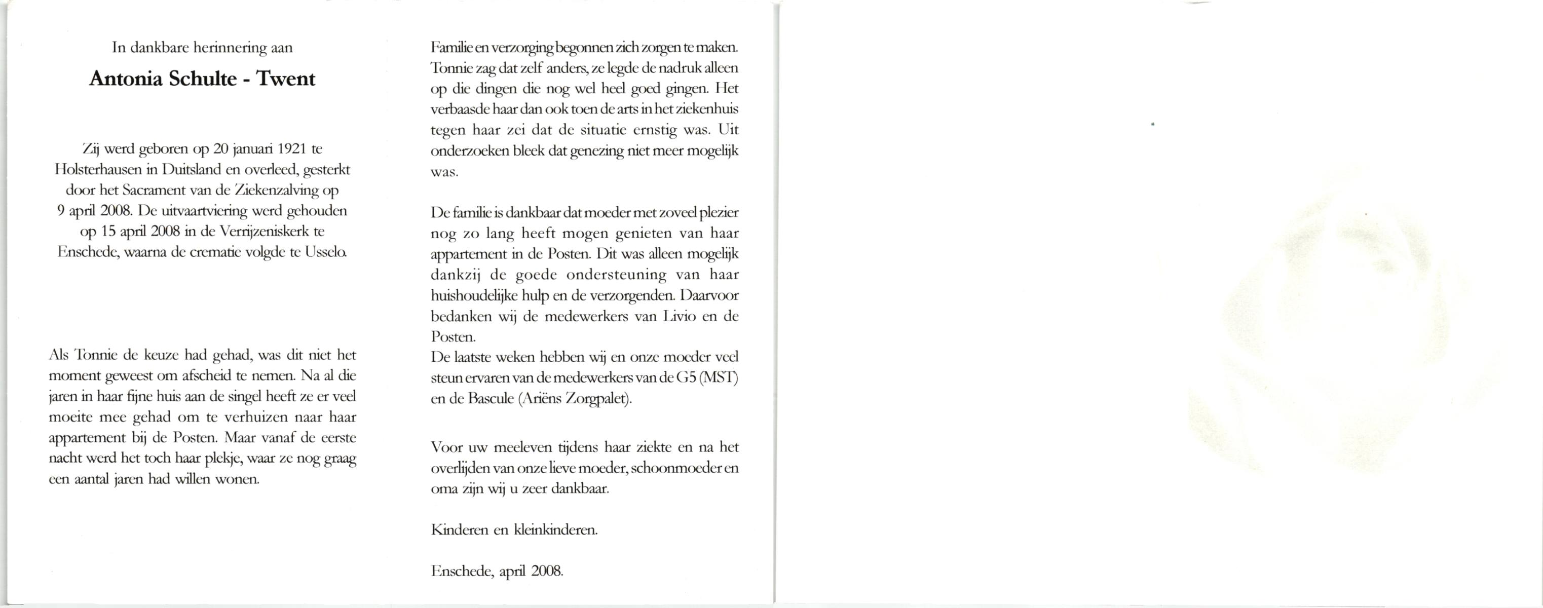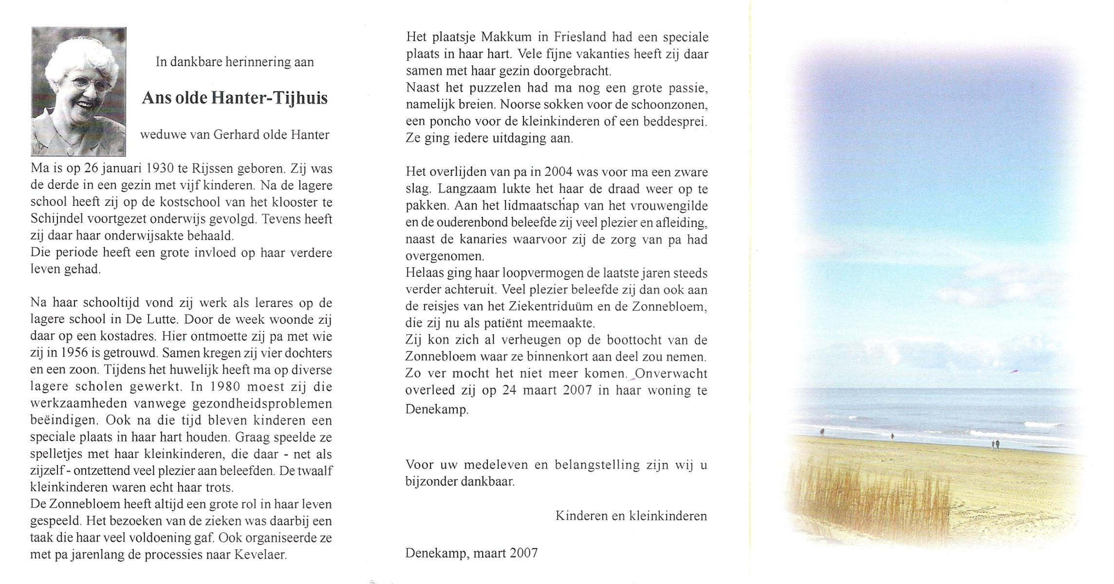TIJHUIS, Ans, geboren op 26-1-1930 te Rijssen, overleden op 24-3-2007 te Denekamp op 77-jarige leeftijd.