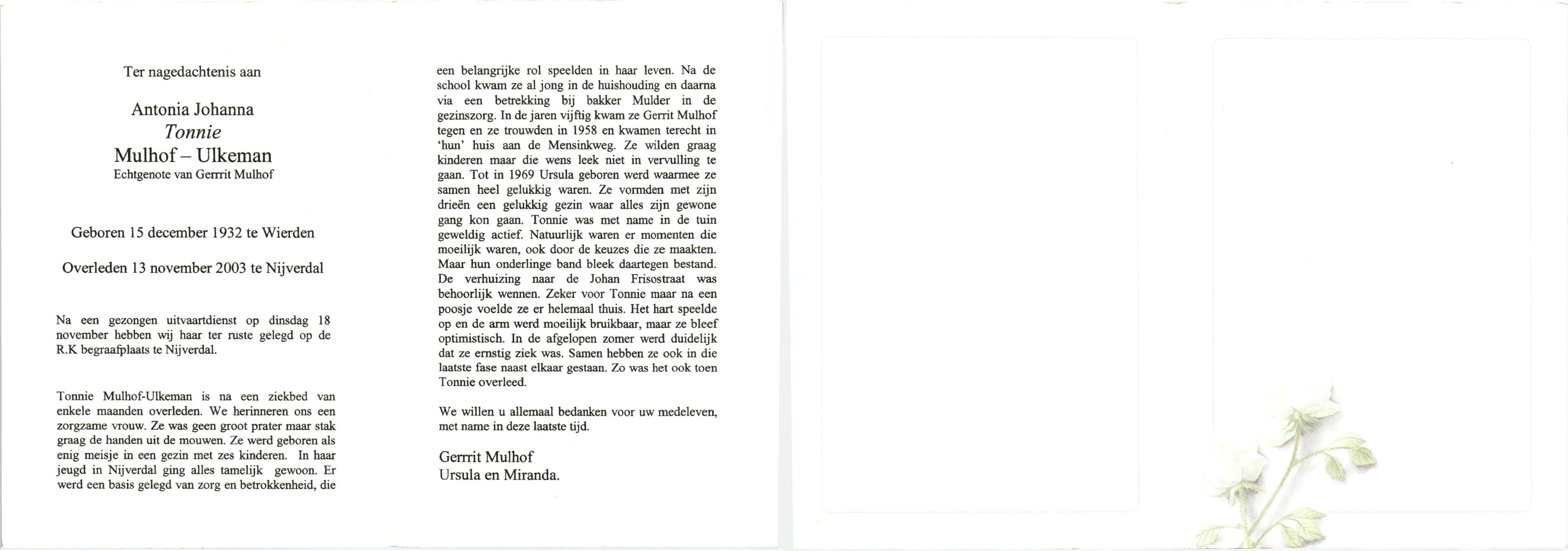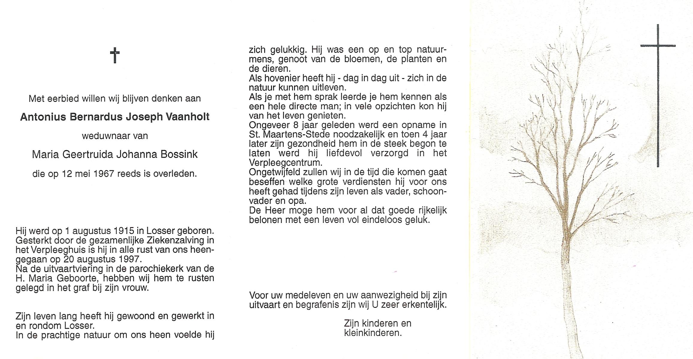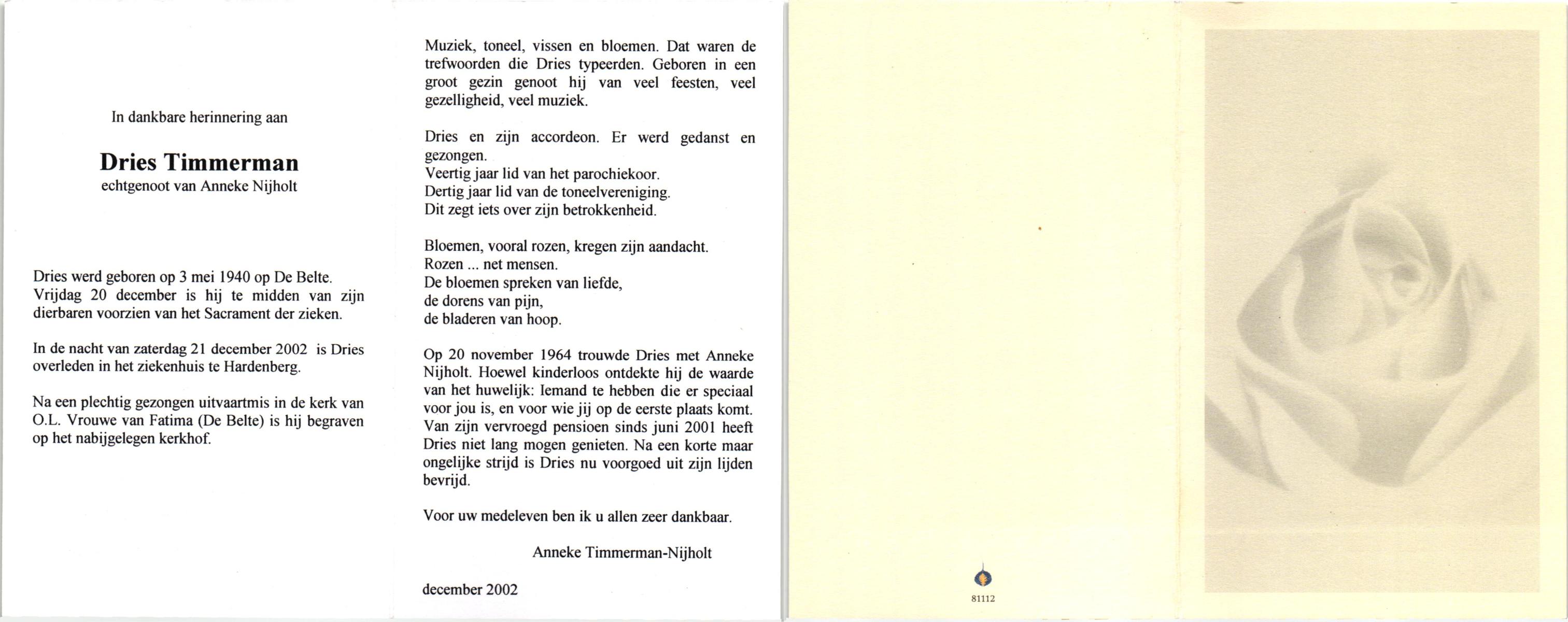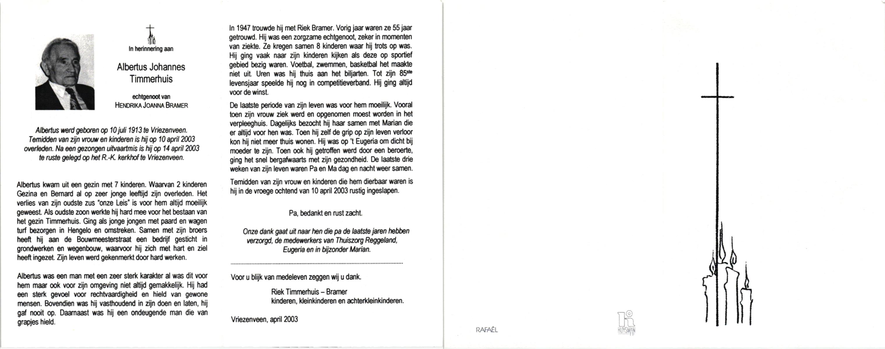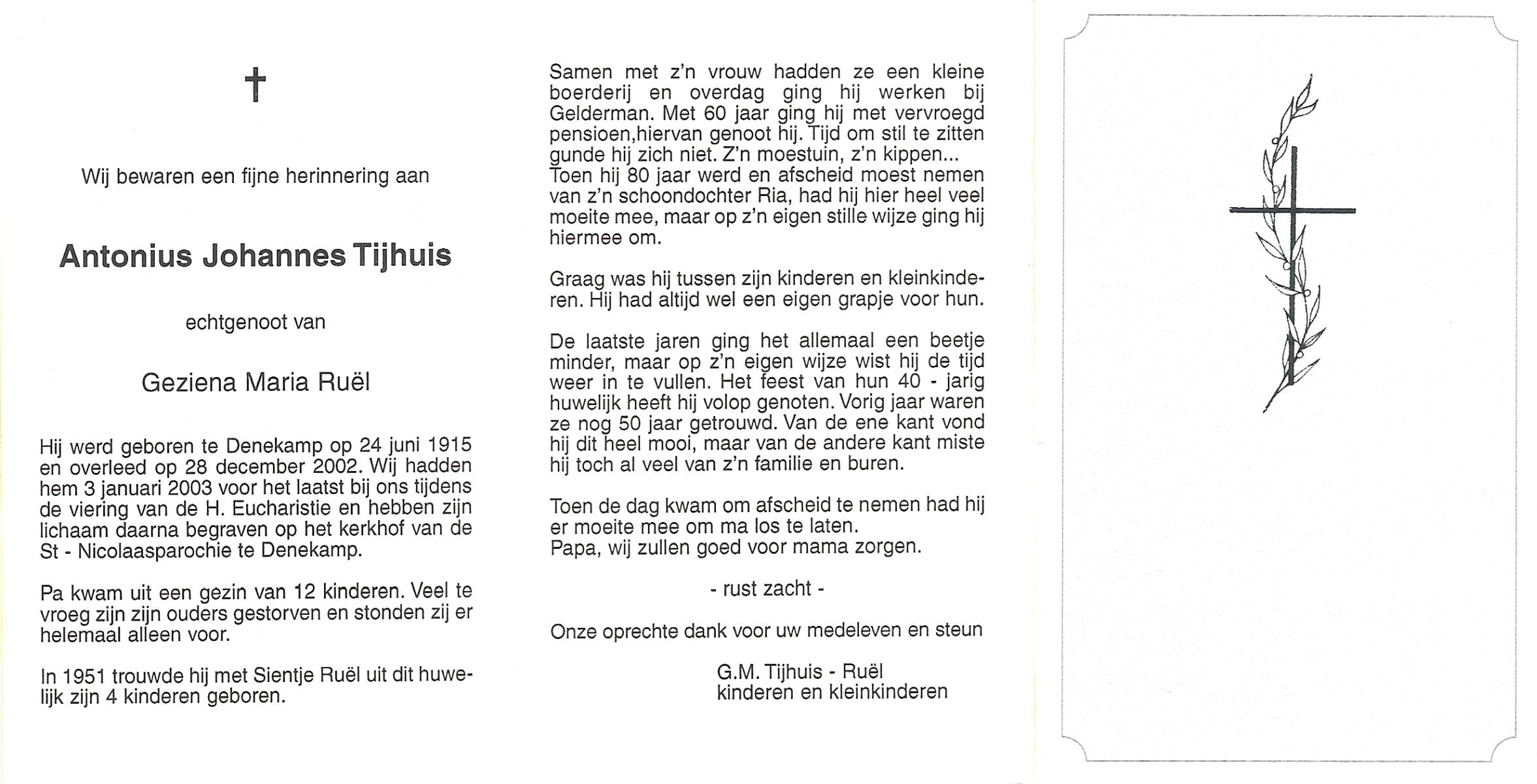 TIJHUIS, Antonius Johannes, geboren op 24-6-1915 te Denekamp, overleden op 28-12-2002 op 87-jarige leeftijd, begraven op 3-1-2003 te Denekamp.