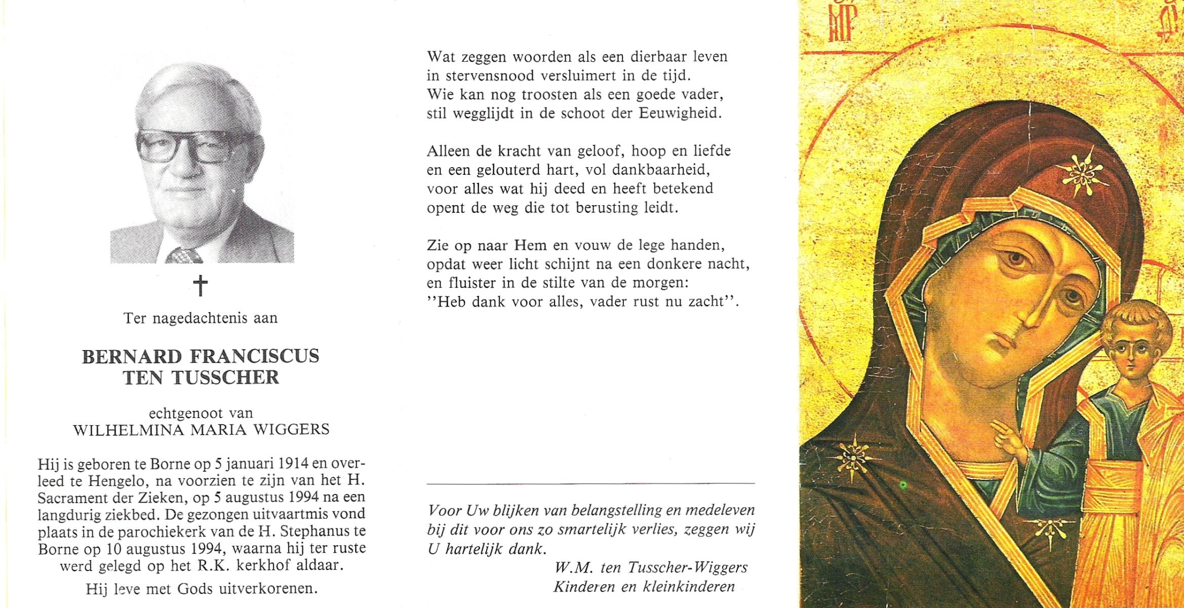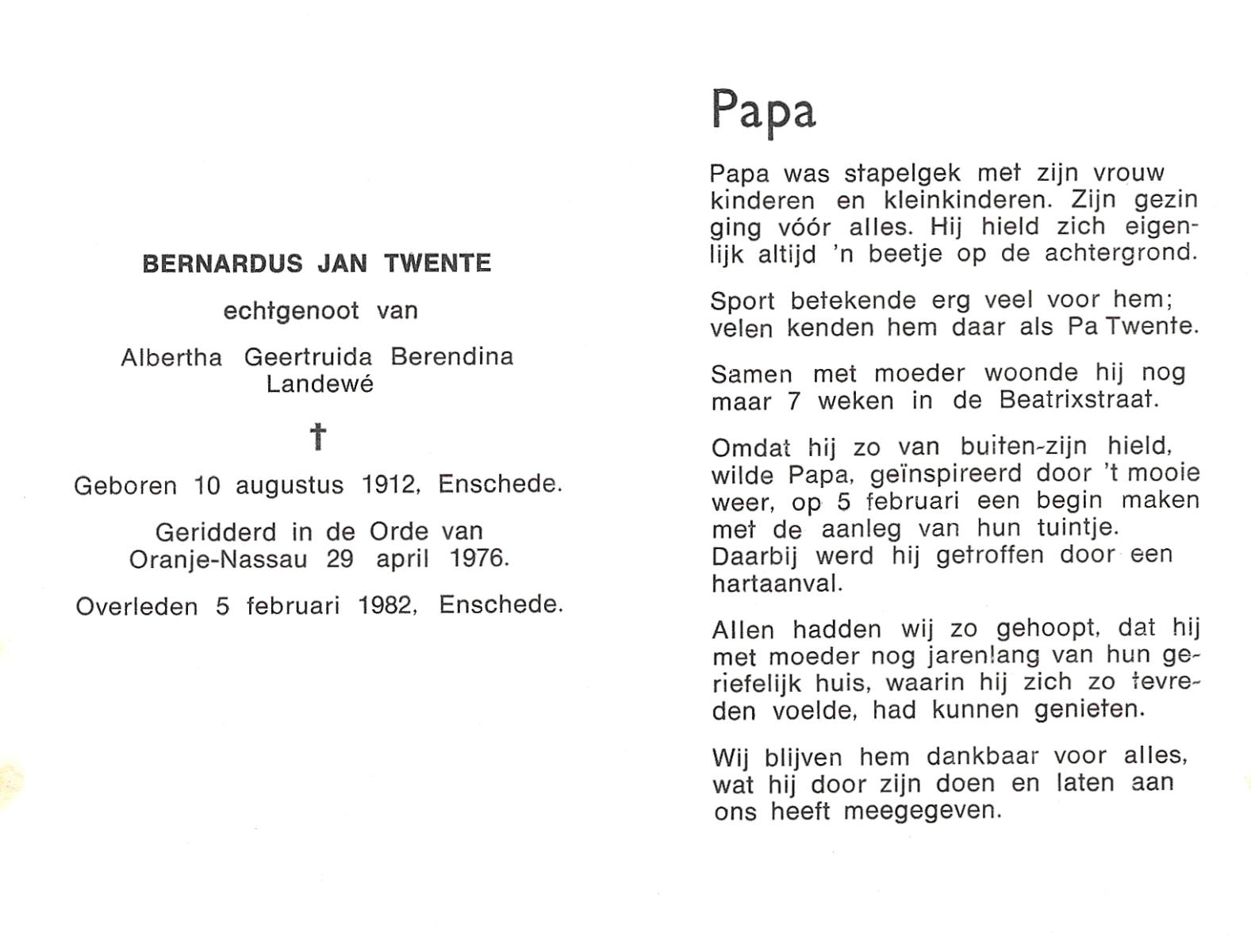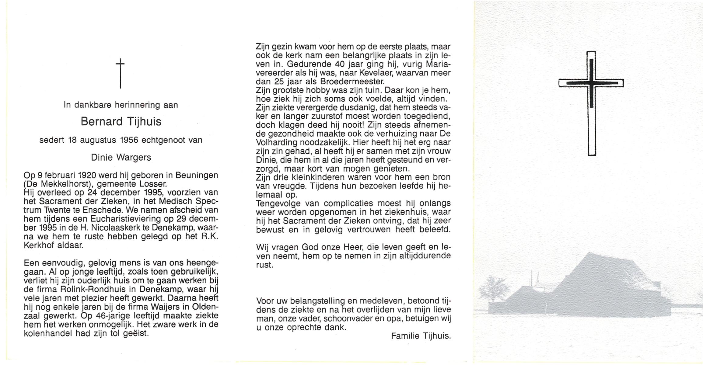 TIJHUIS, Bernard, geboren op 9-2-1920 te Beuningen (Ov.), overleden op 24-12-1995 te Enschede op 75-jarige leeftijd, begraven op 29-12-1995 te Denekamp.