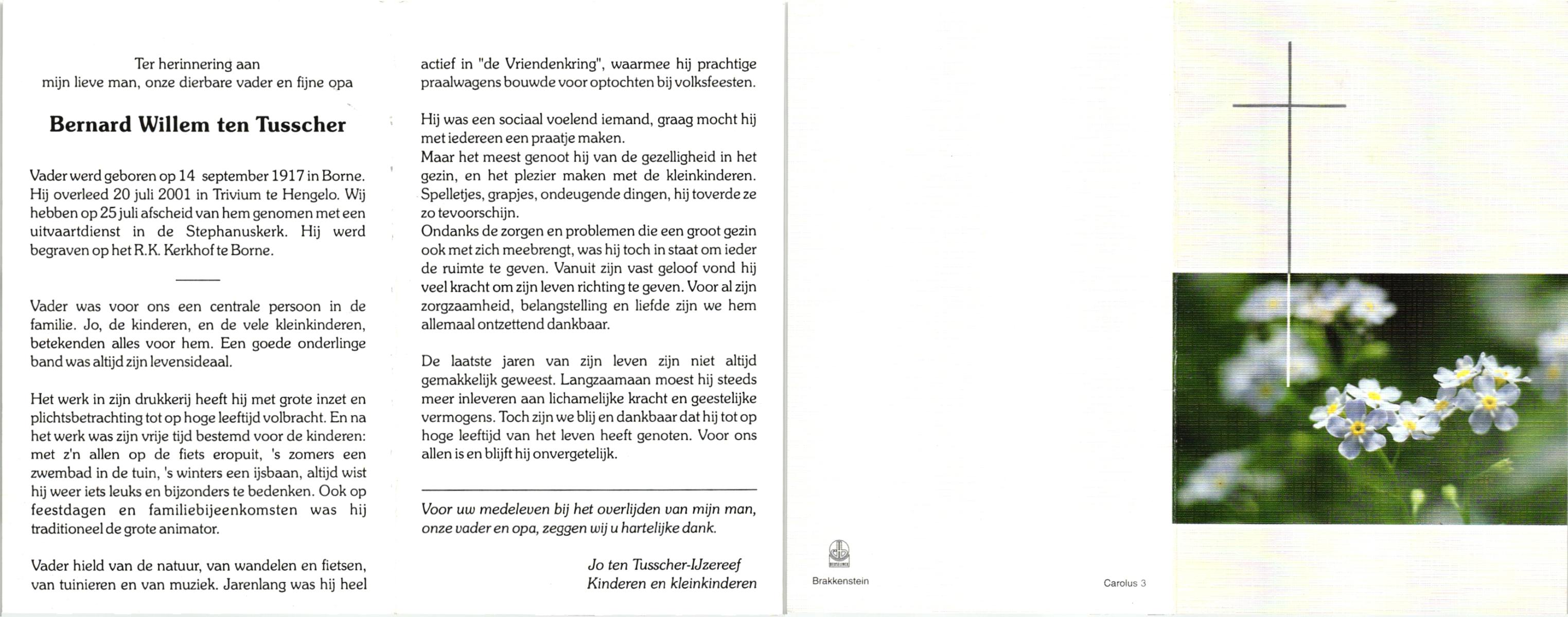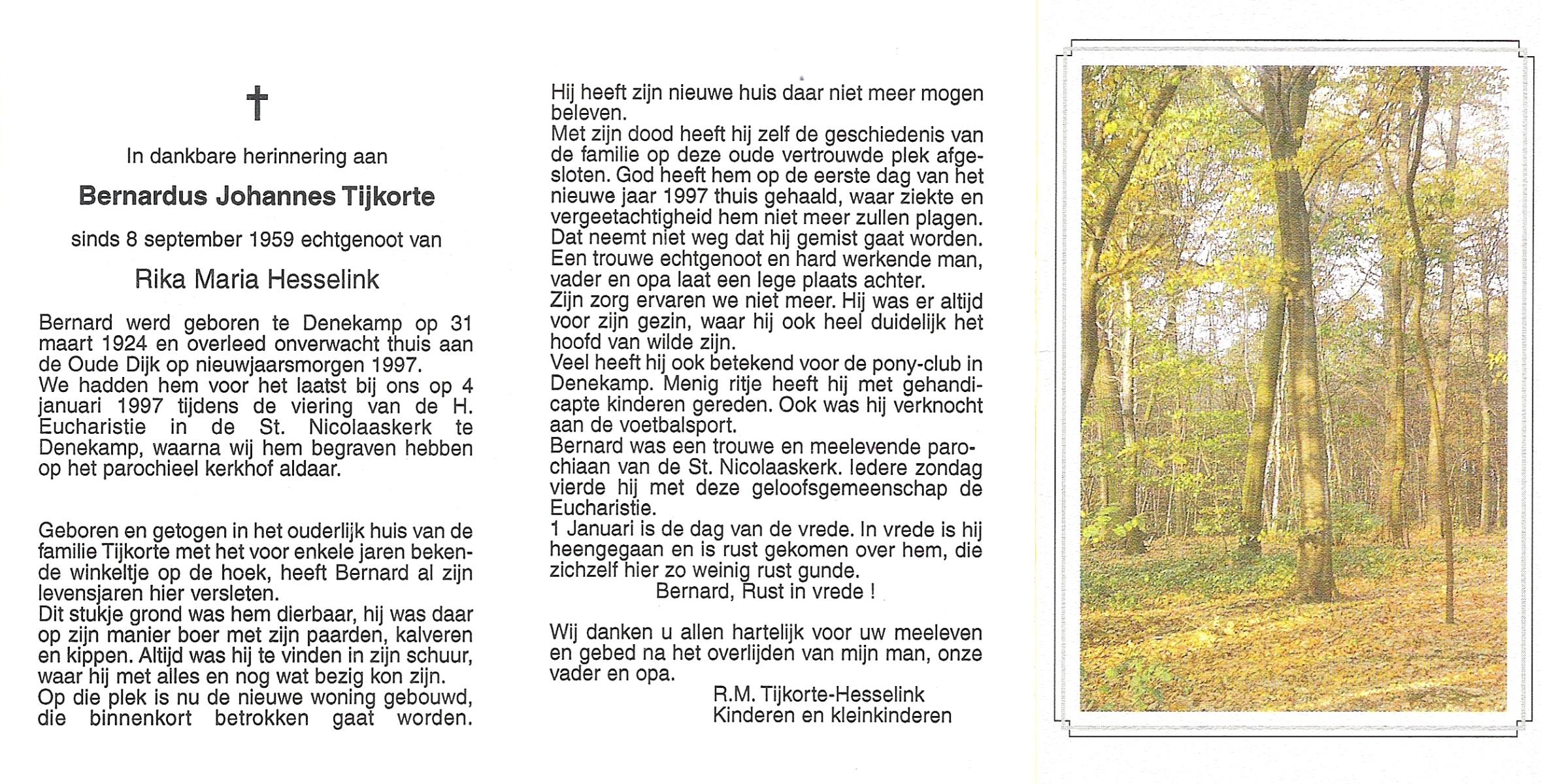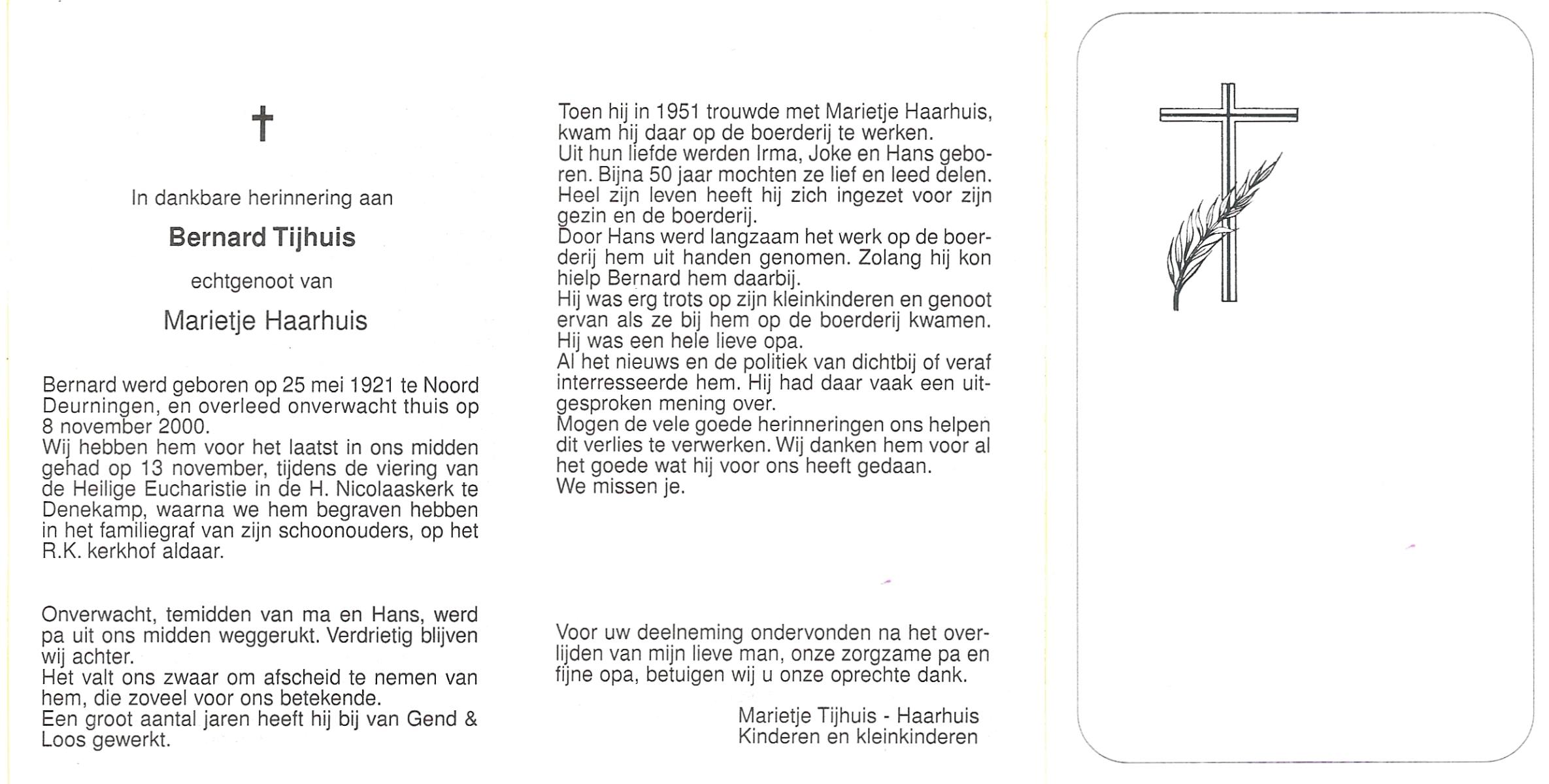 TIJHUIS, Bernard, geboren op 25-5-1921 te Noord Deurningen, overleden op 8-11-2000 te Noord Deurningen op 79-jarige leeftijd, begraven op 13-11-2000 te Denekamp R.K.kerkhof.