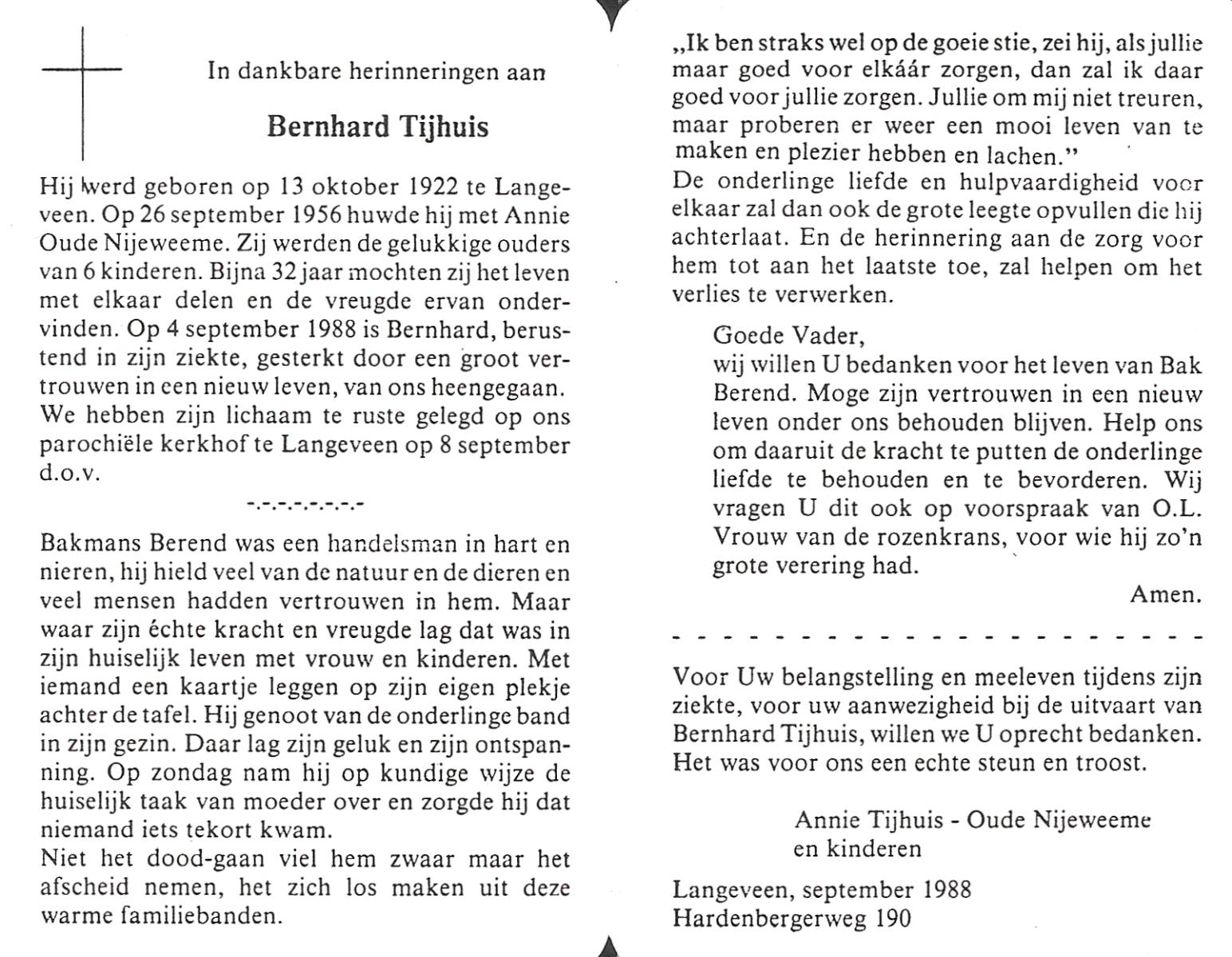TIJHUIS, Bernard, geboren op 13-10-1922 te Langeveen, overleden op 4-9-1988 te Langeveen op 65-jarige leeftijd, begraven op 8-9-1988 te Langeveen R.K.kerhof.