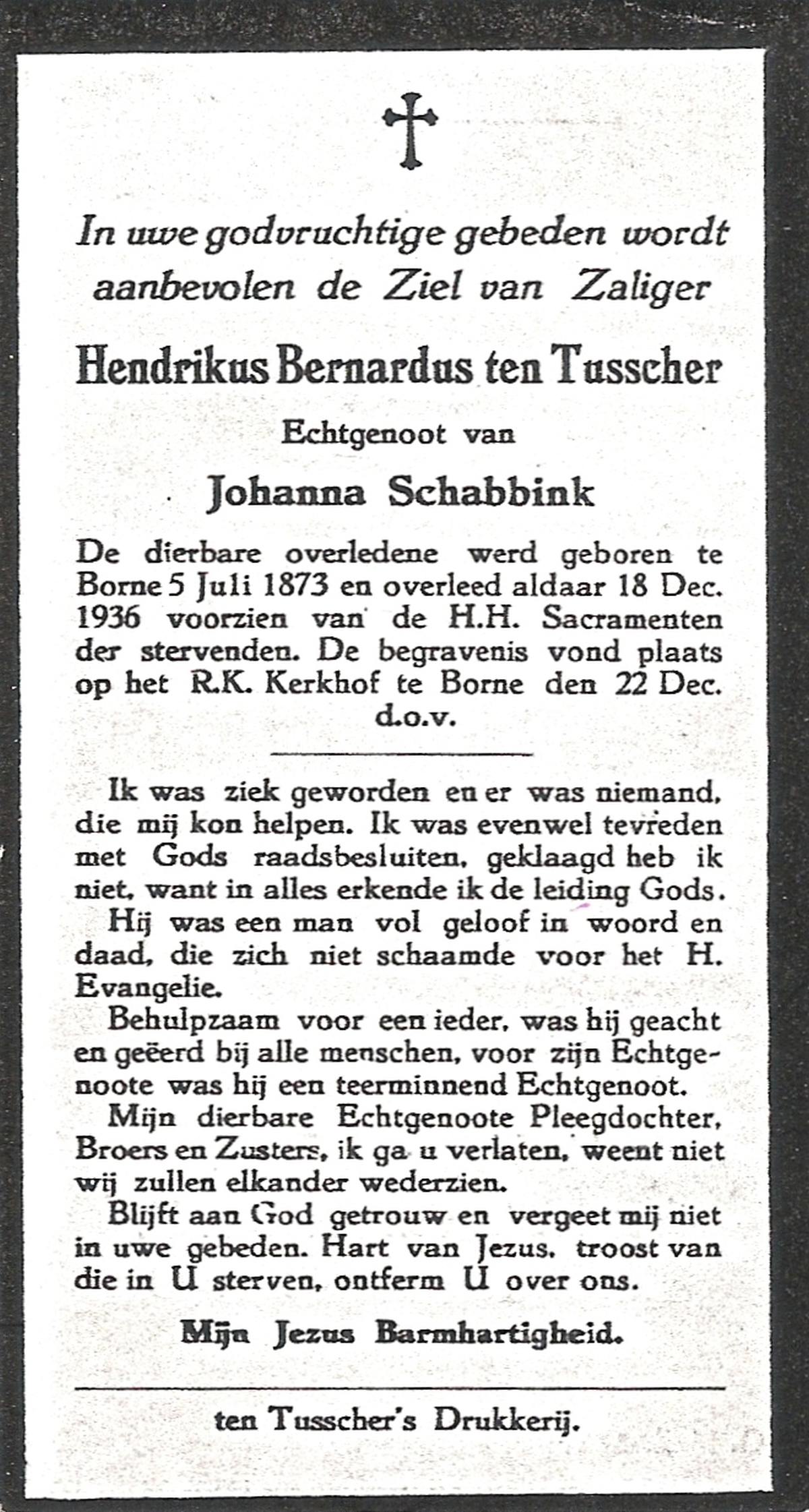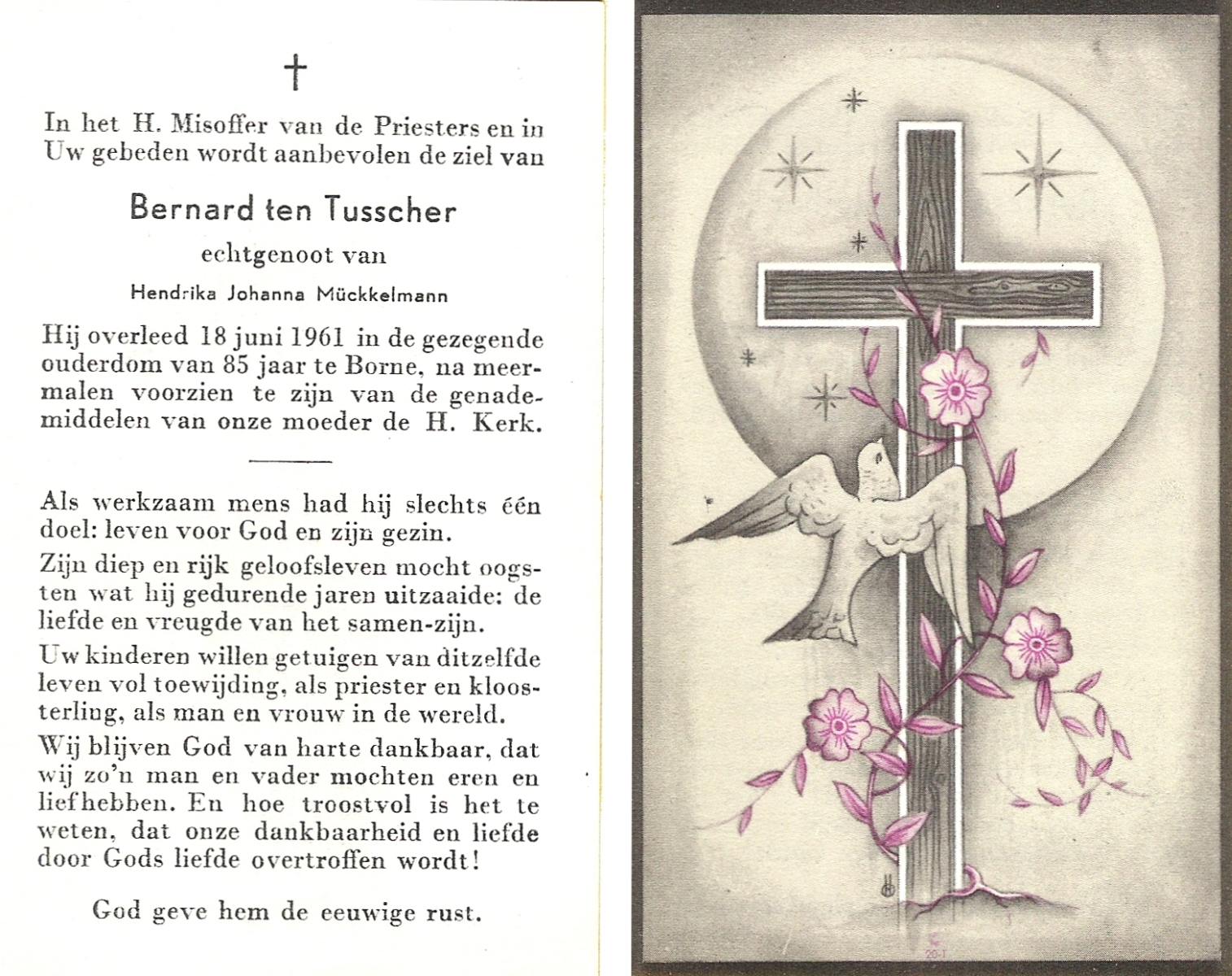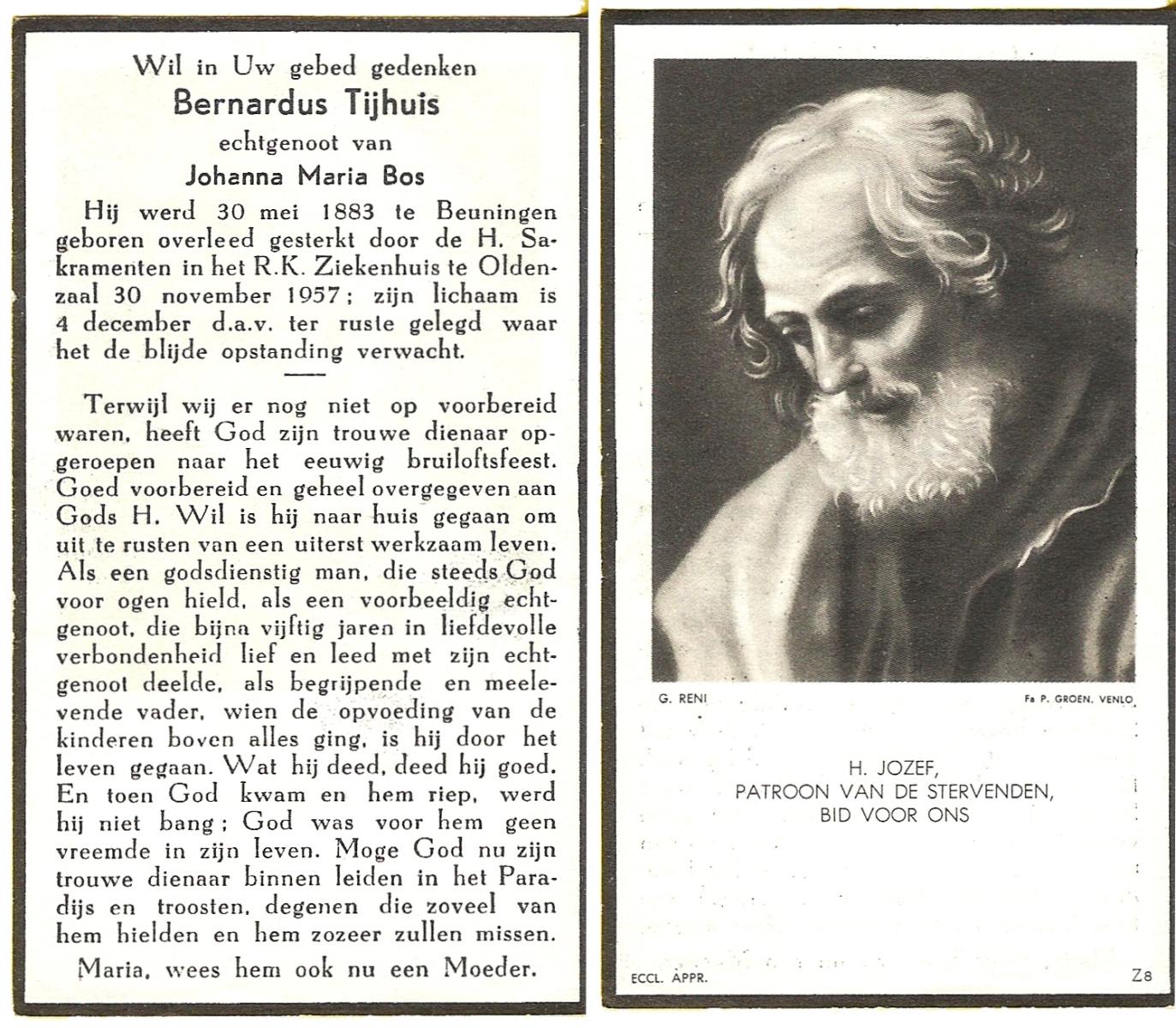 TIJHUIS, Bernardus, geboren op 30-05-1883 te Beuningen (Ov.), overleden op 30-11-1957 te Oldenzaal op 74-jarige leeftijd, begraven op 4-12-1957.