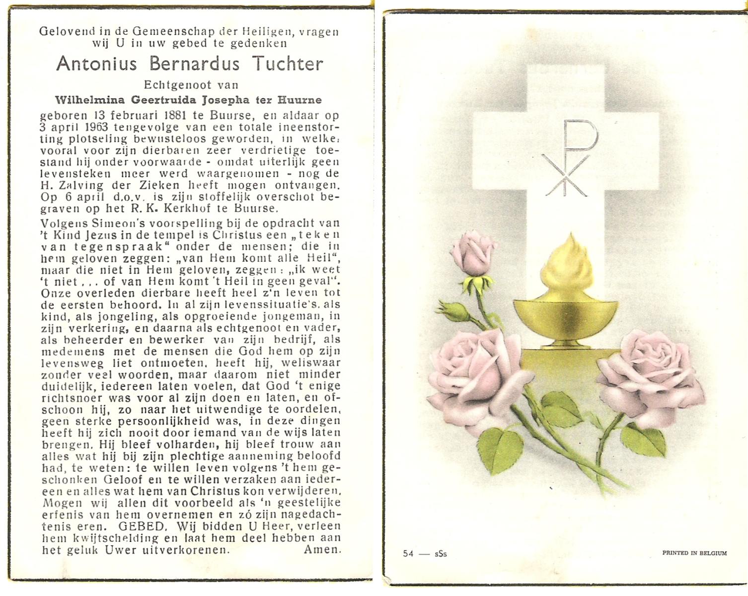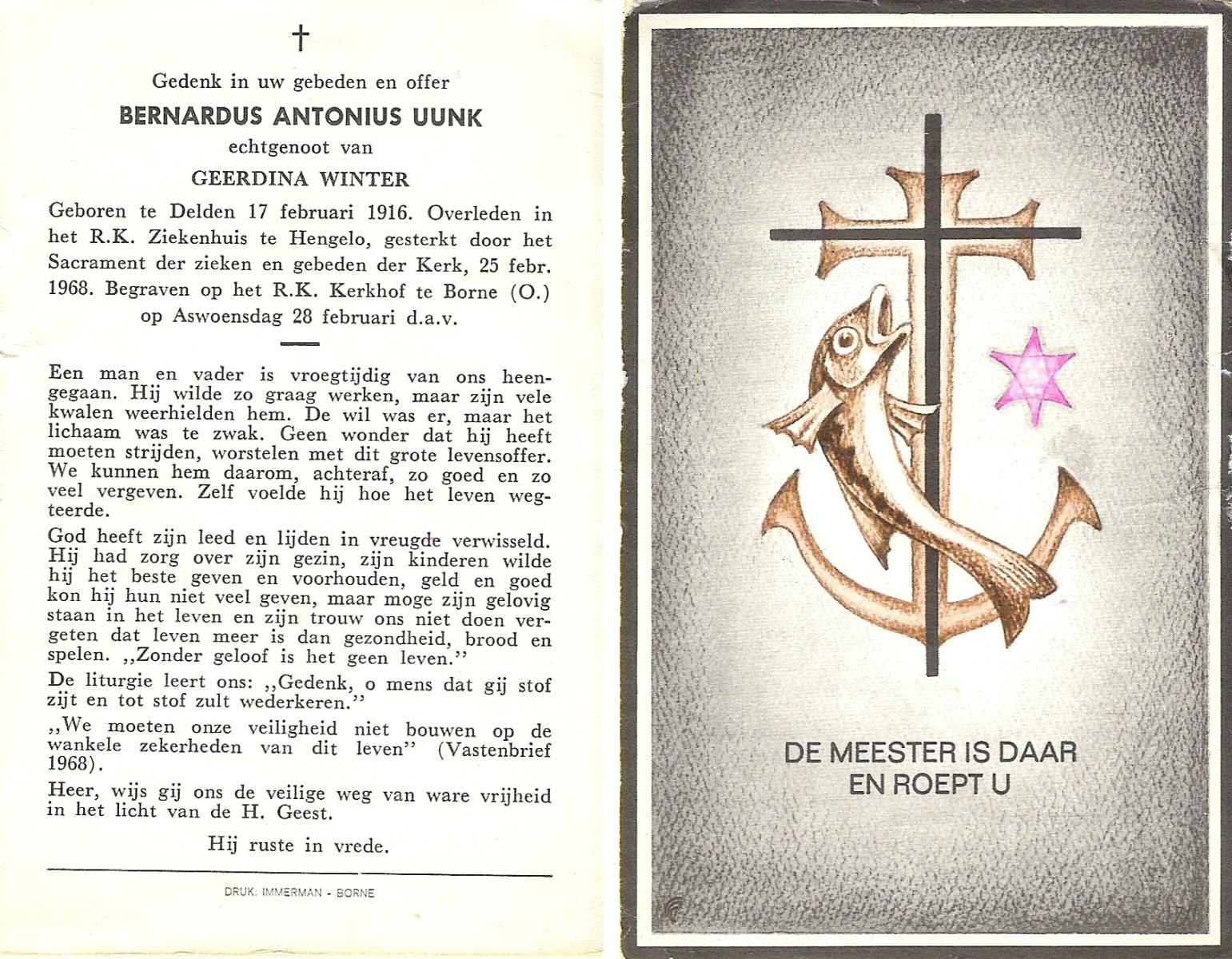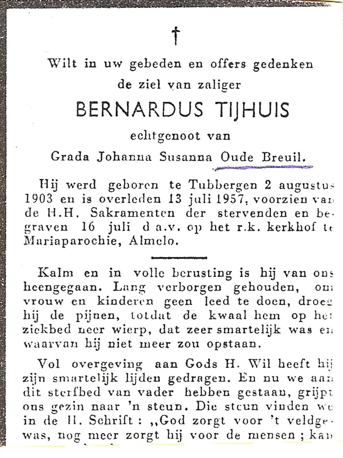 TIJHUIS, Bernardus, geboren op 2-8-1903 te Tubbergen, overleden op 13-7-1957 te Almelo op 53-jarige leeftijd, begraven op 16-7-1957 te Almelo.