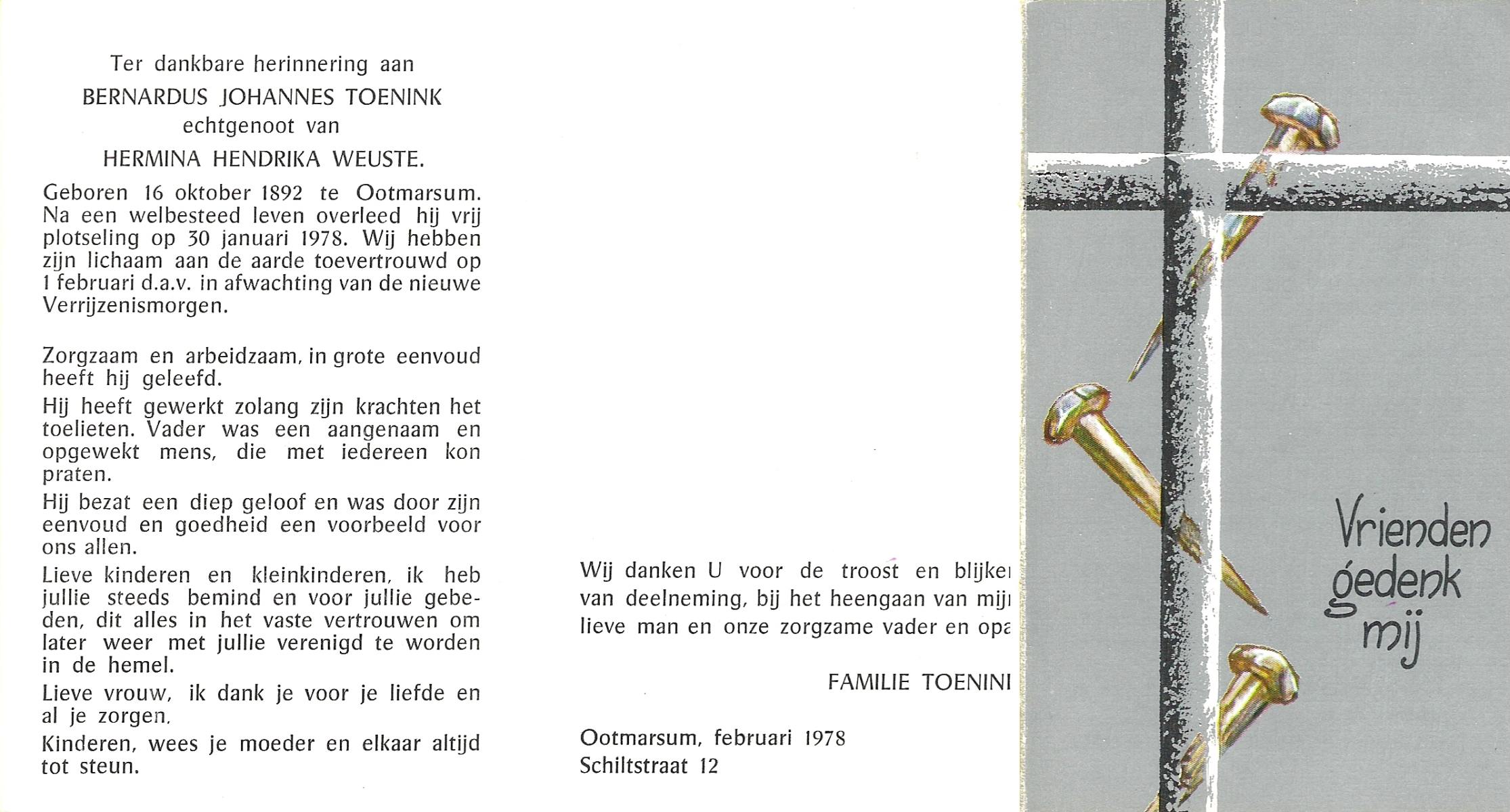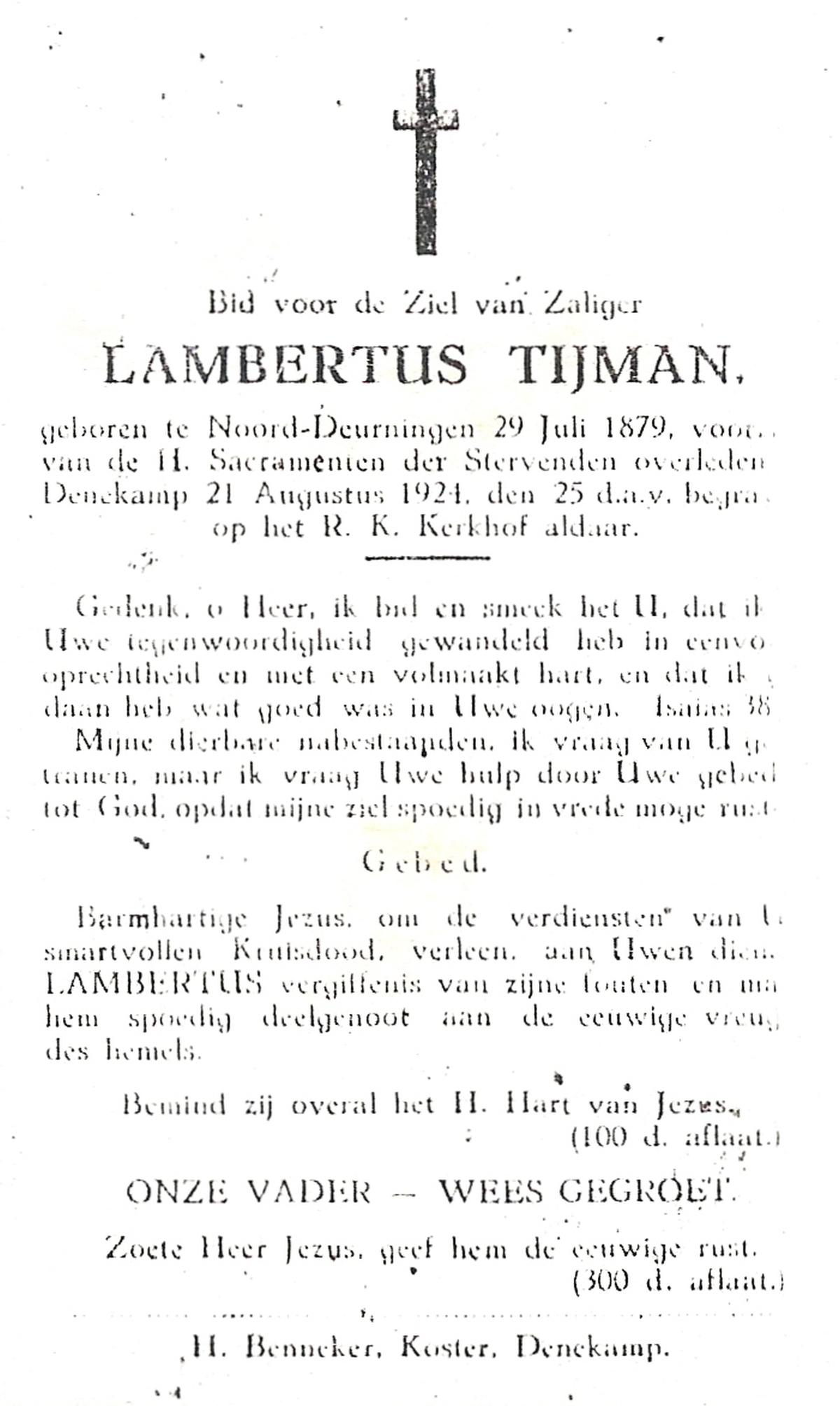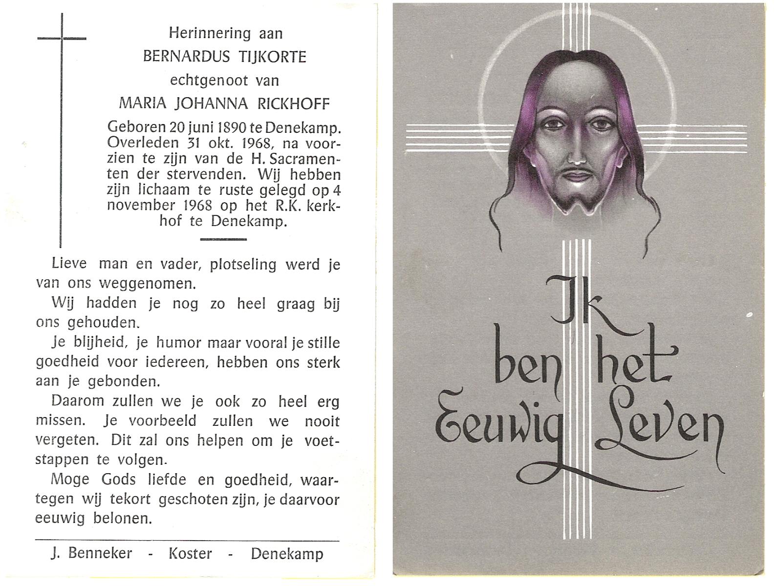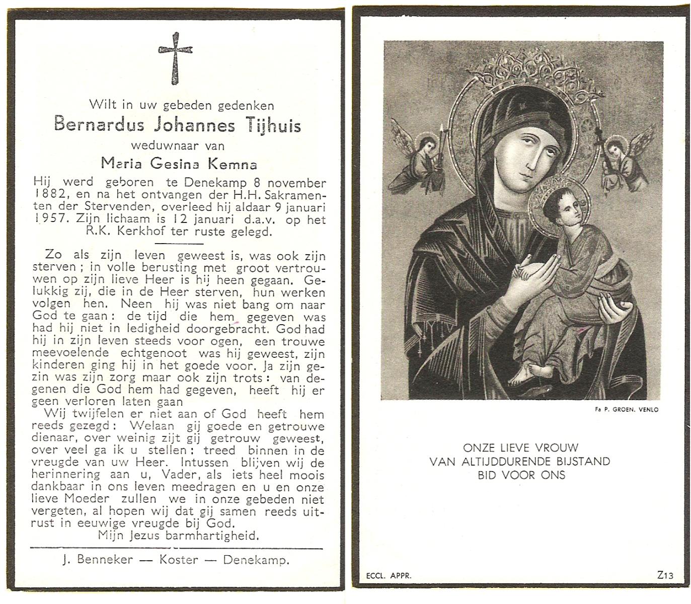 TIJHUIS, Bernardus Johannes, geboren op 08-11-1882 te Denekamp, overleden op 9-1-1957 te Denekamp op 74-jarige leeftijd, begraven op 12-1-1957 te Denekamp R.K.kerkhof.