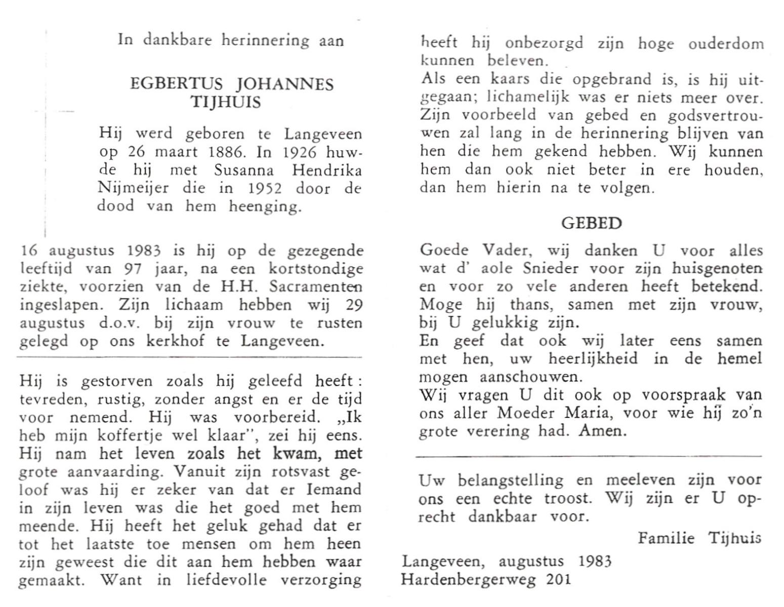 TIJHUIS, Egbertus Johannes, geboren op 26-03-1886 te Langeveen, overleden op 16-8-1983 op 97-jarige leeftijd, begraven op 29-8-1983 te Langeveen R.K.kerhof.