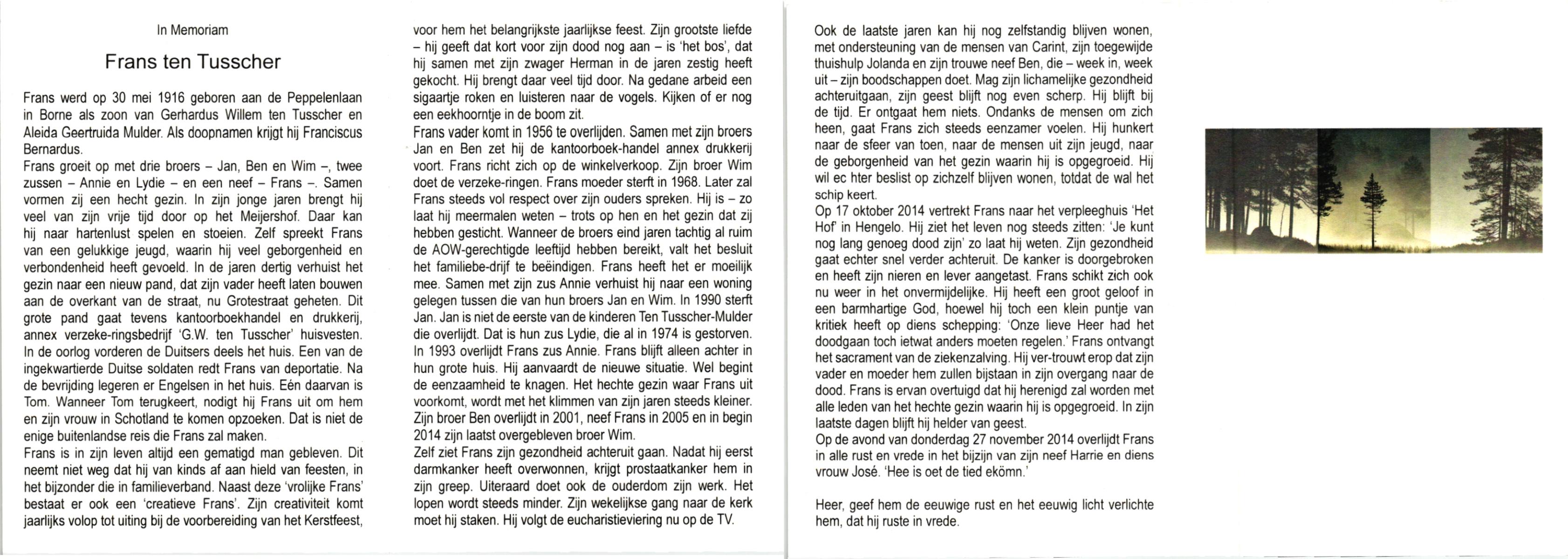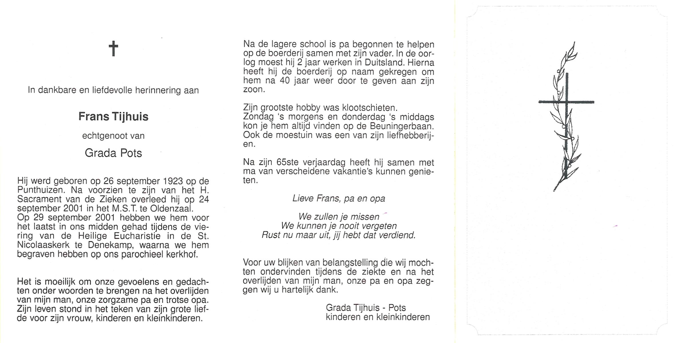 TIJHUIS, Frans, geboren op 26-9-1923 te Punthuizen, overleden op 24-9-2001 te Oldenzaal op 77-jarige leeftijd, begraven op 29-9-2001 te Denekamp R.K.kerkhof.
