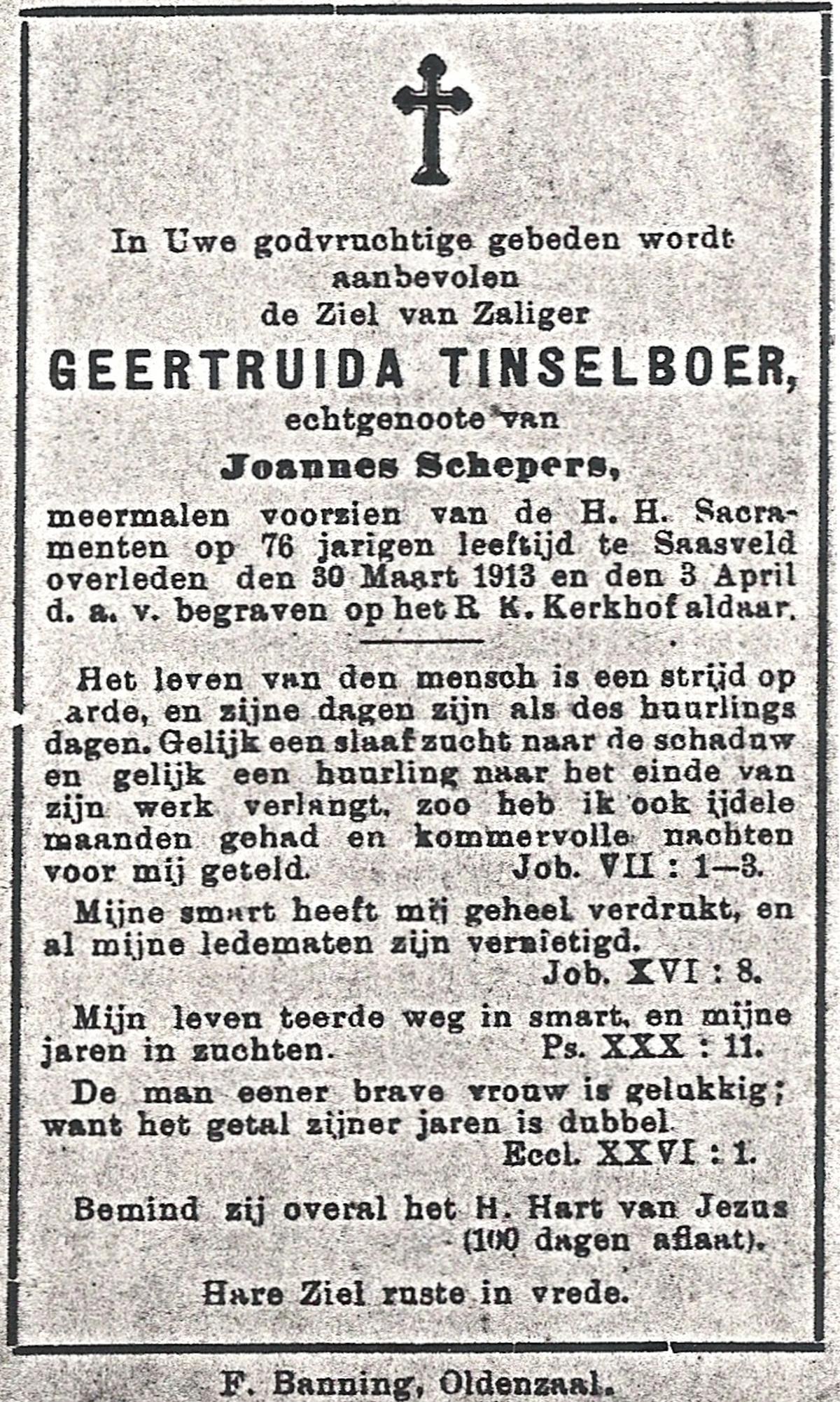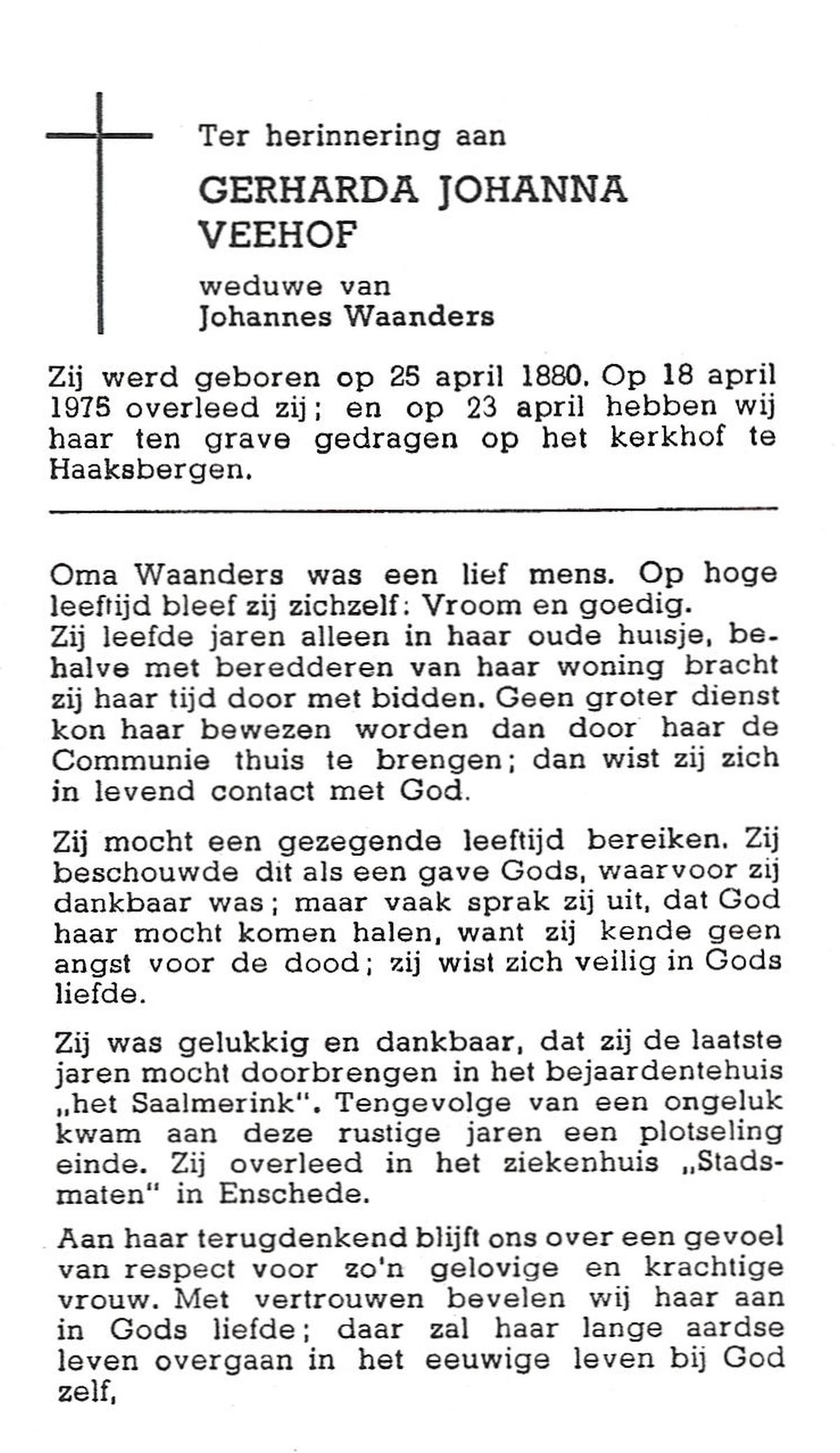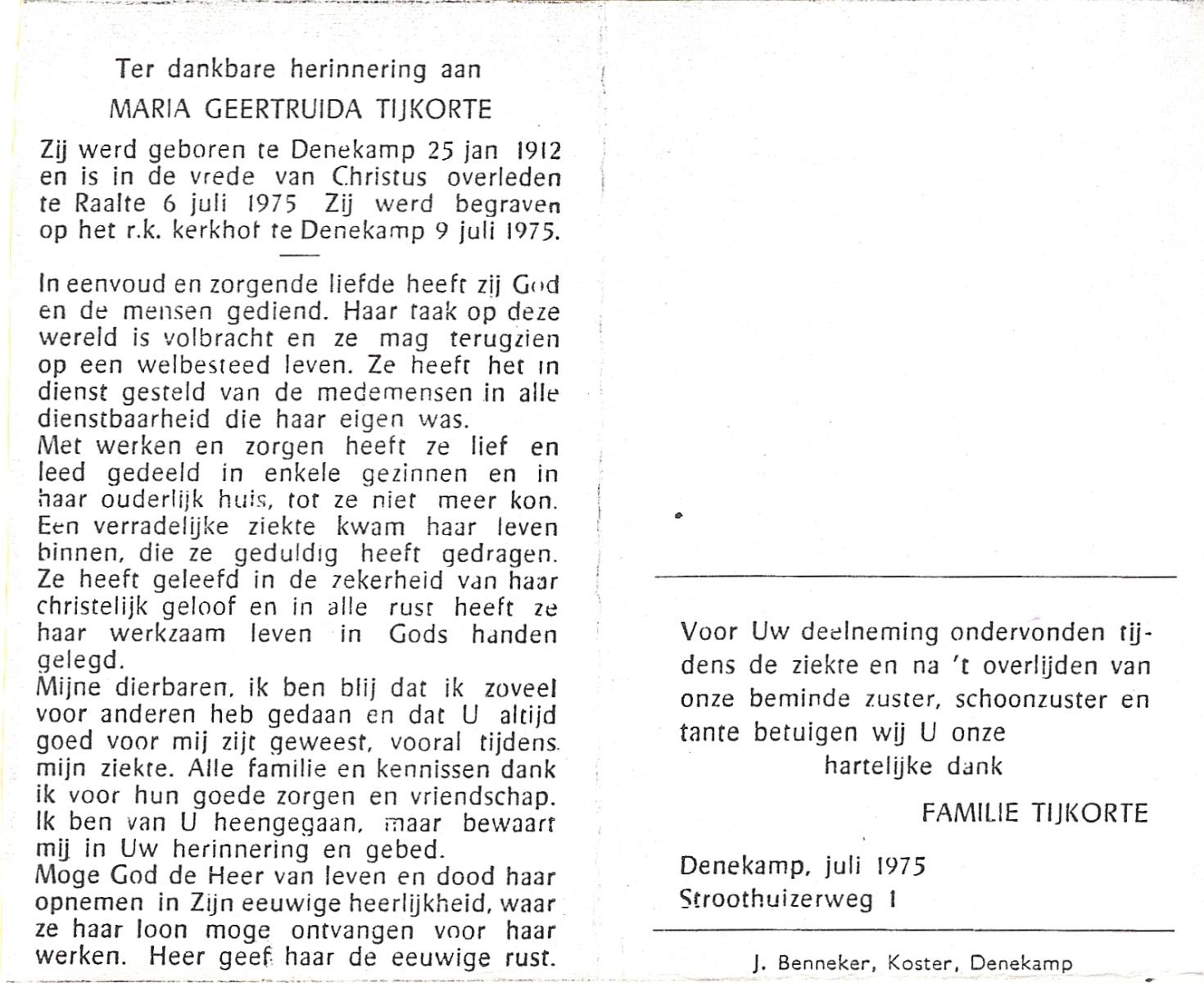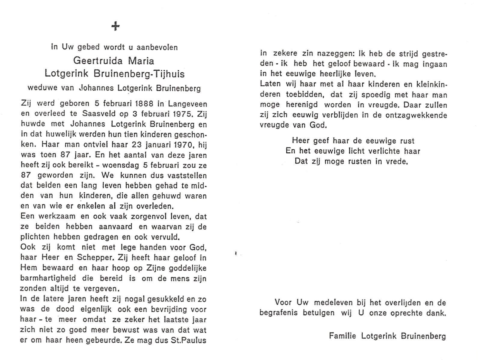 TIJHUIS, Geertruida Maria, geboren op 05-02-1888 te Langeveen, overleden op 3-2-1975 te Saasveld op 86-jarige leeftijd.