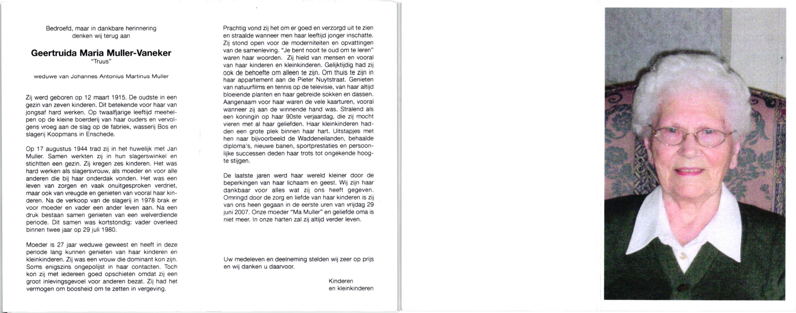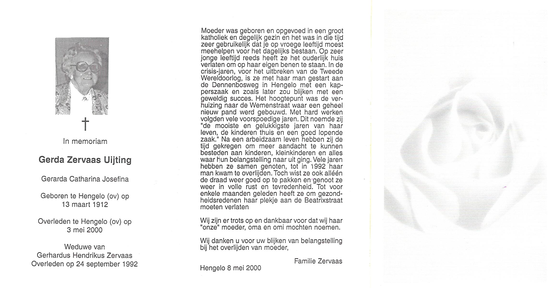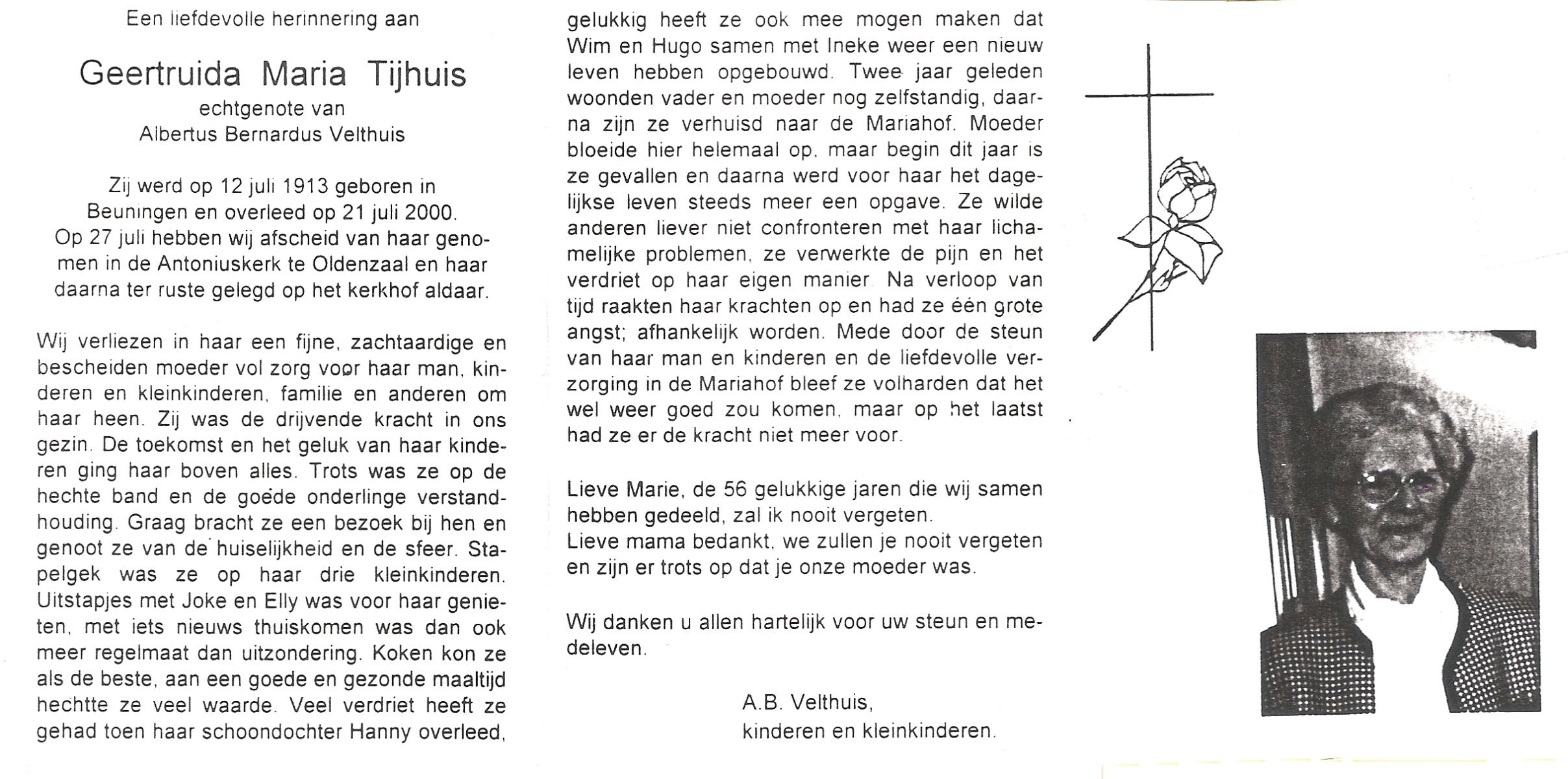 TIJHUIS, Geertruida Maria, geboren op 12-7-1913 te Beuningen (Ov.), overleden op 21-7-2000 op 87-jarige leeftijd, begraven op 27-7-2000 te Oldenzaal.