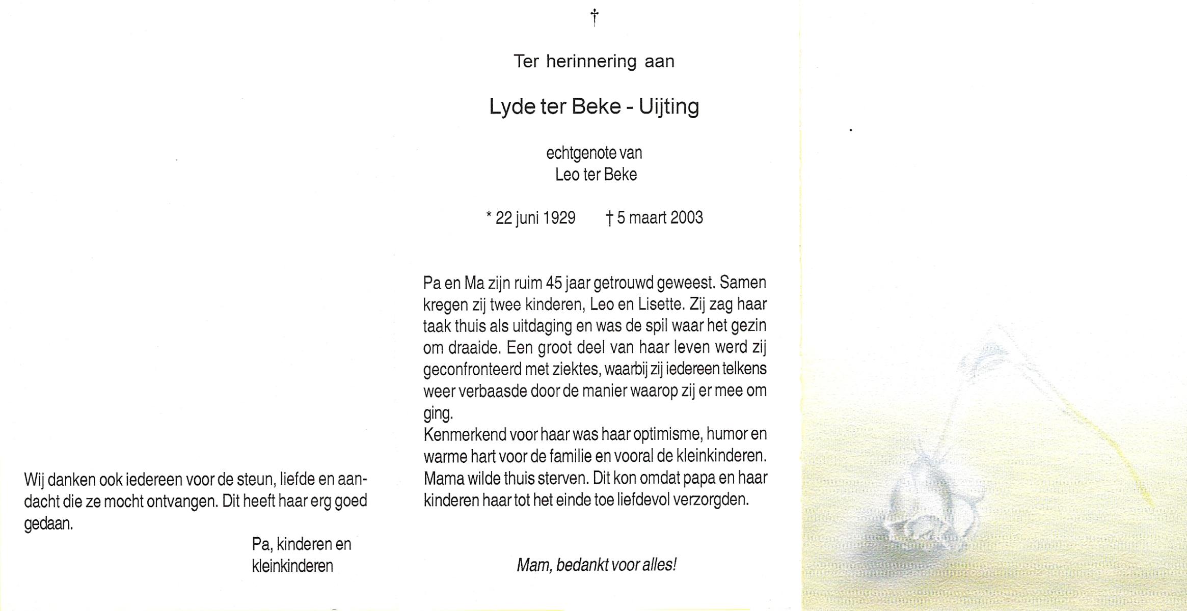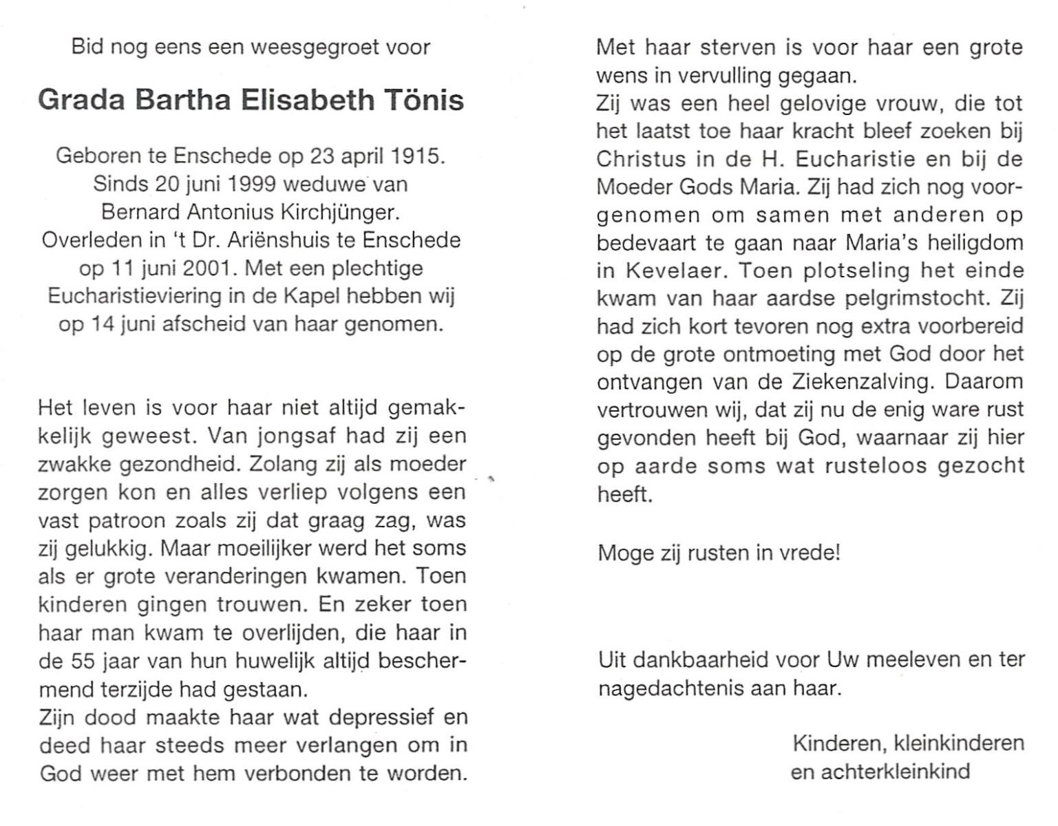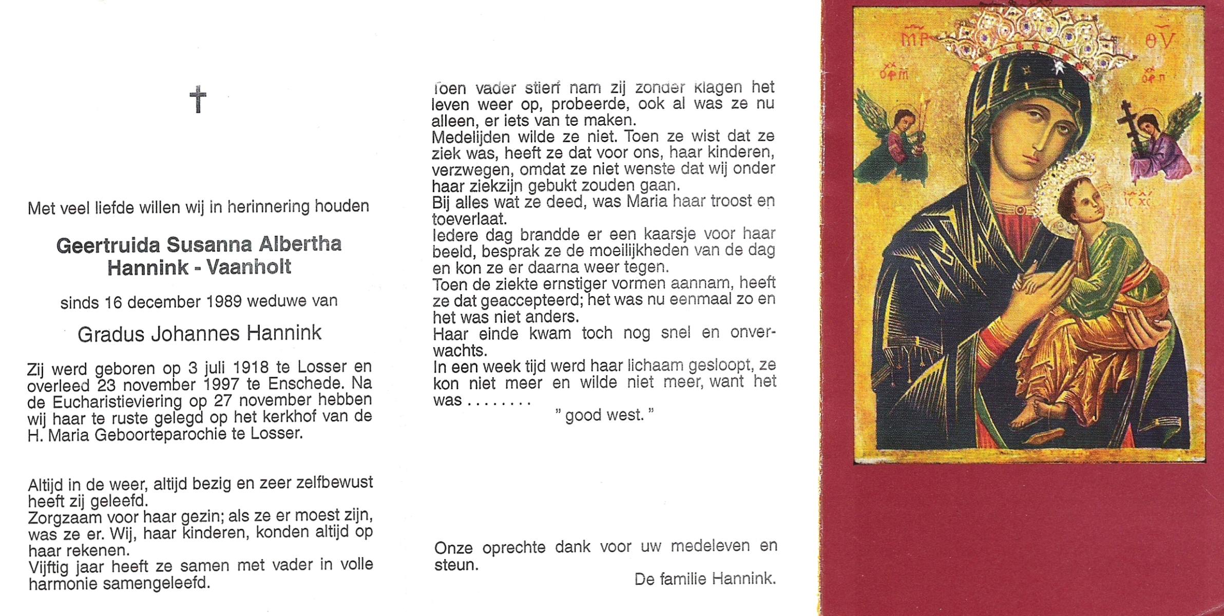 TIJHUIS, Geertruida Maria, geboren op 12-7-1913 te Beuningen (Ov.), overleden op 21-7-2000 op 87-jarige leeftijd, begraven op 27-7-2000 te Oldenzaal.