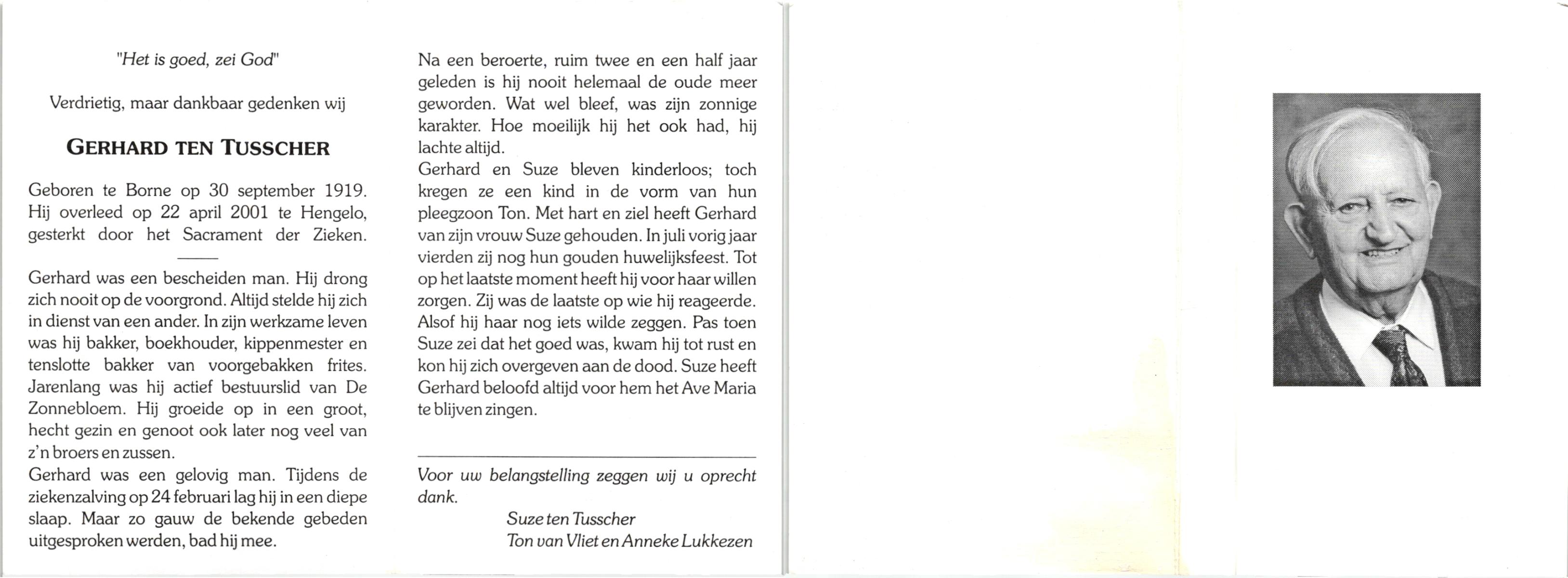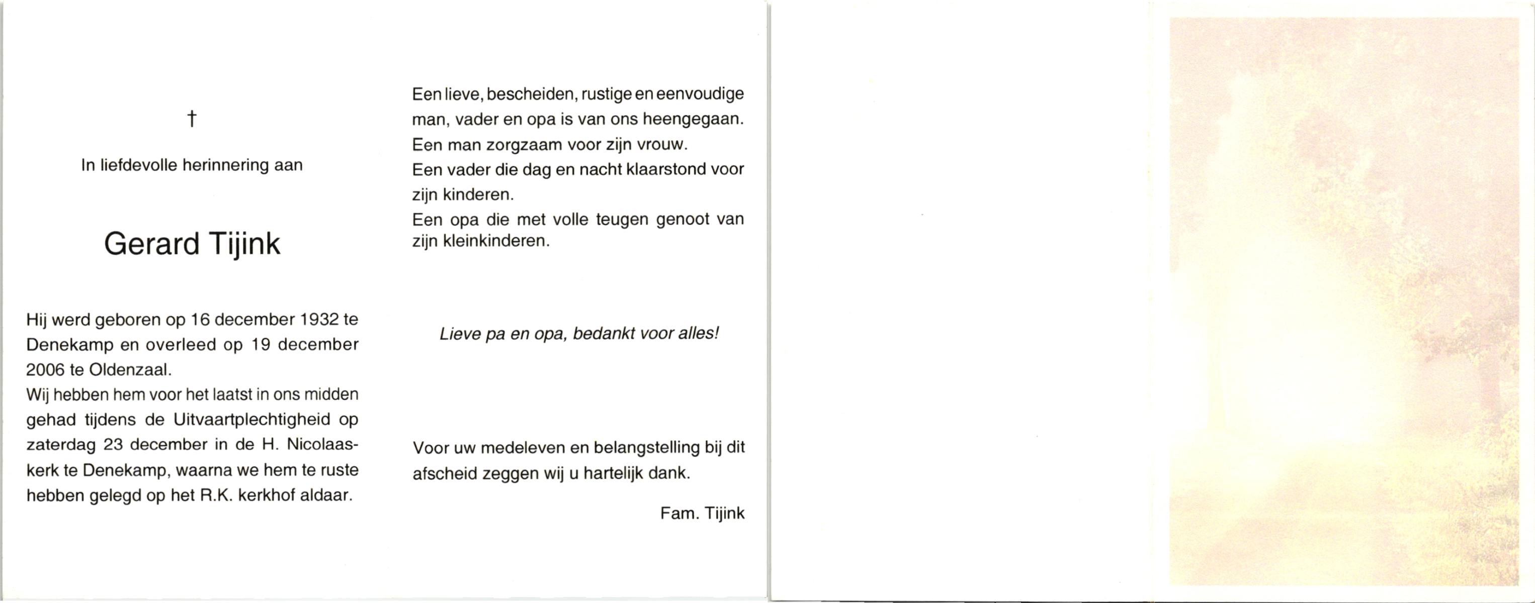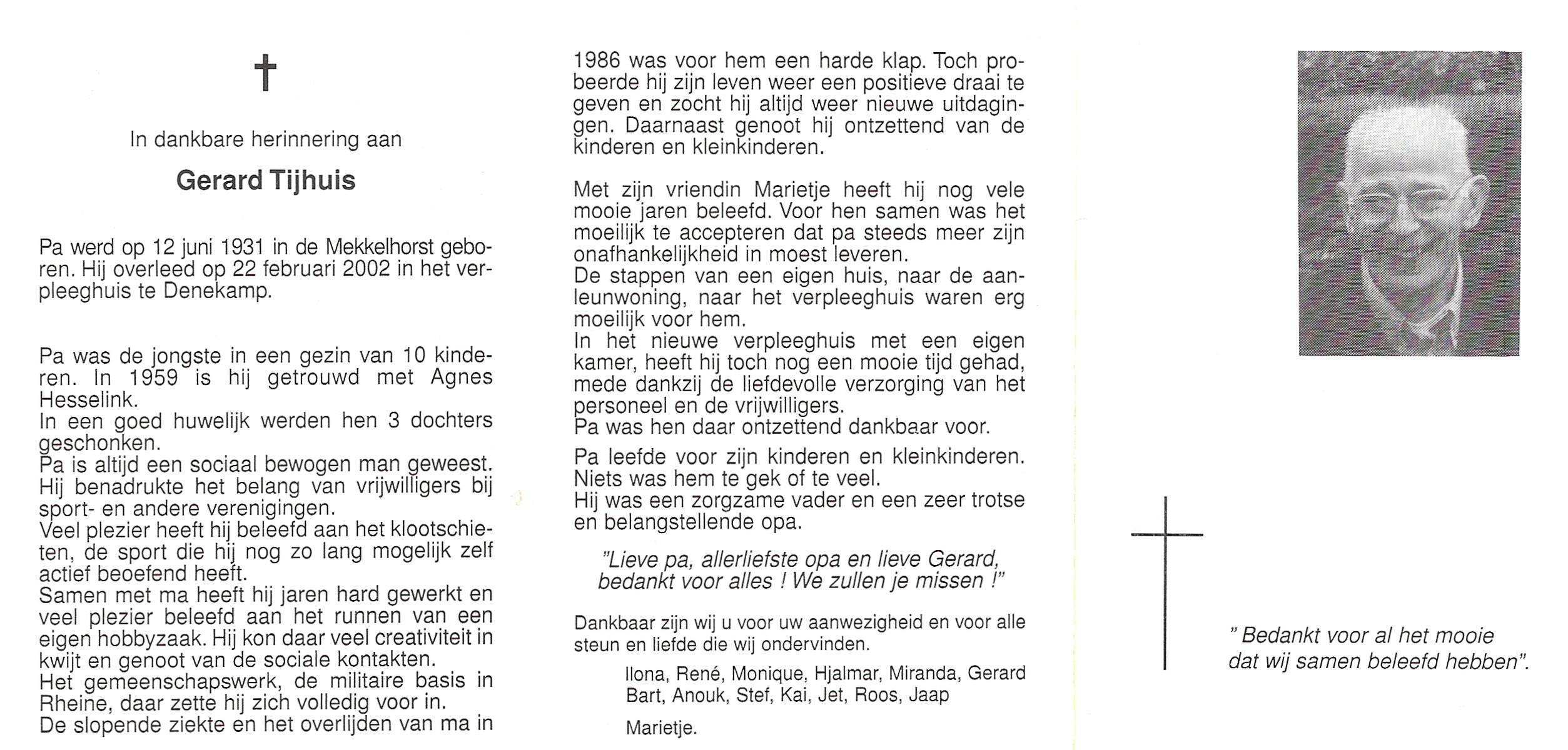 TIJHUIS, Gerard, geboren op 12-6-1931 te de Mekkelhorst, overleden op 22-2-2002 te Denekamp op 70-jarige leeftijd.