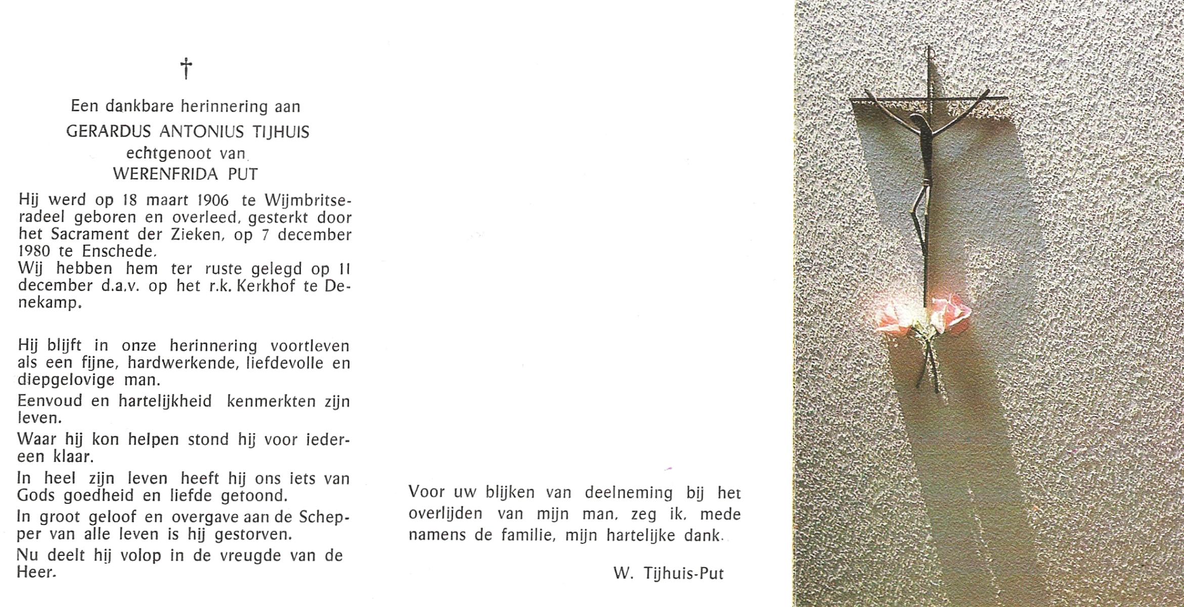 TIJHUIS, Gerardus Antonius, geboren op 18-3-1906 te Wijmbritseradeel, overleden op 7-12-1980 te Enschede op 74-jarige leeftijd, begraven op 11-12-1980 te Denekamp R.K.kerkhof.