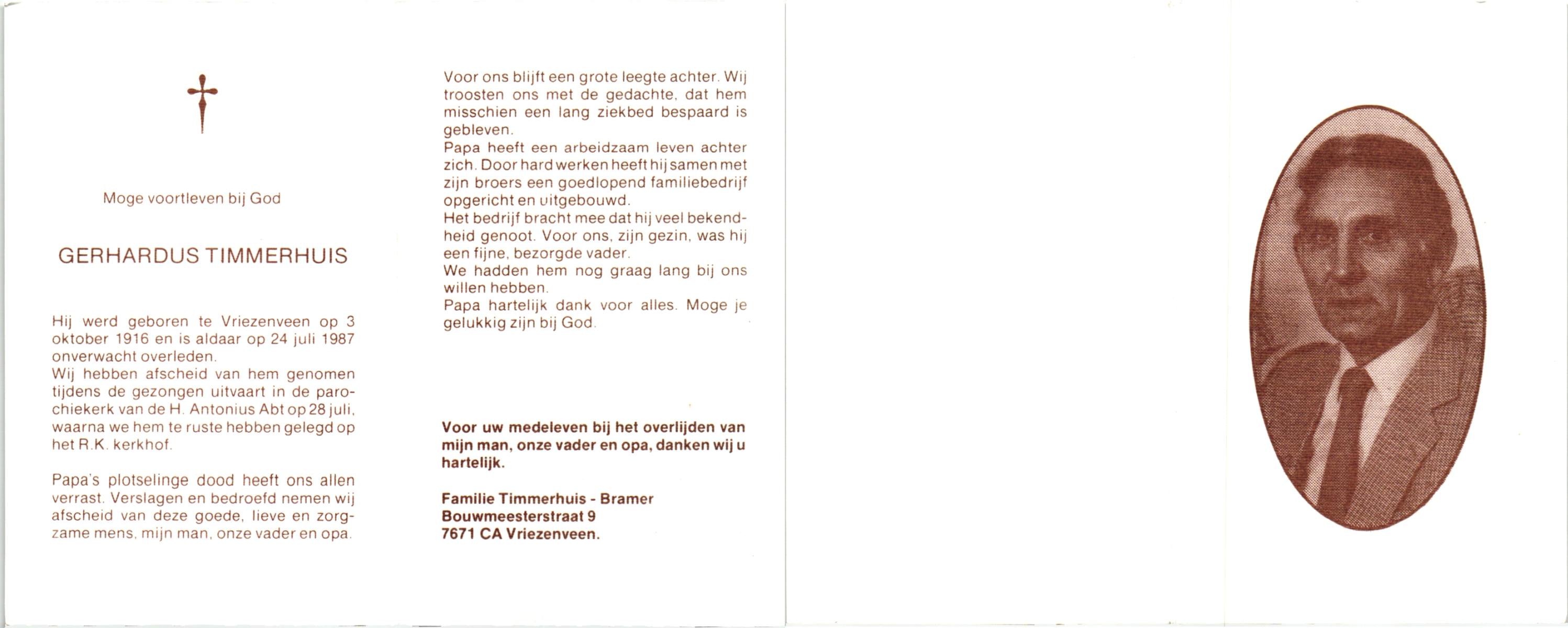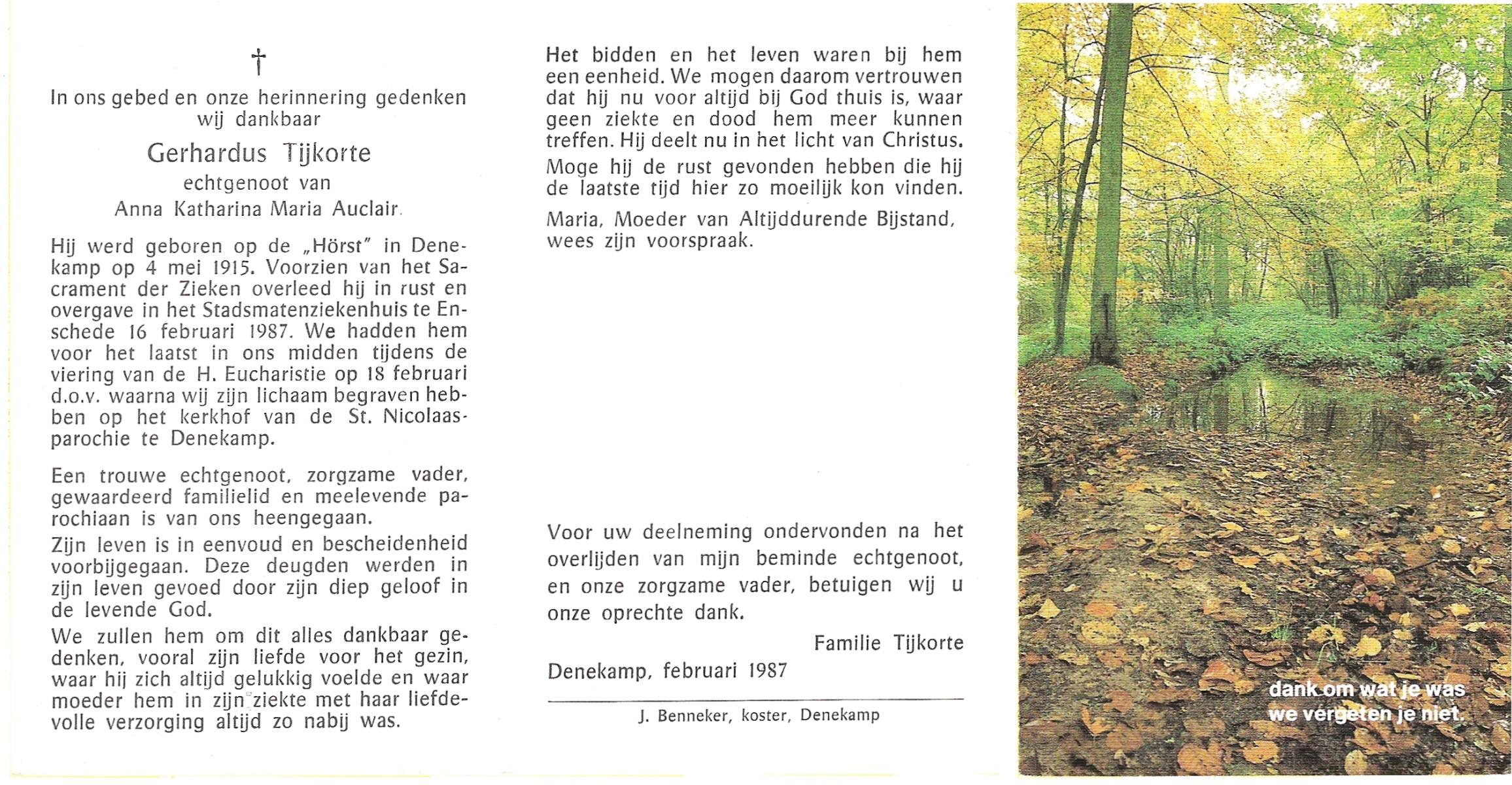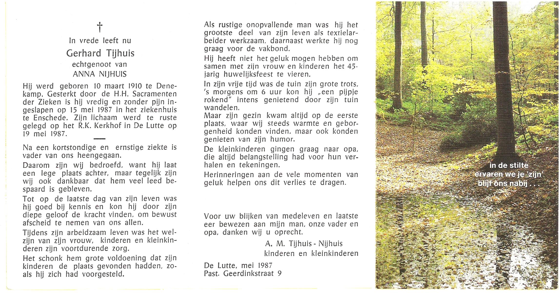 TIJHUIS, Gerhard, geboren op 10-3-1910 te Denekamp, overleden op 15-5-1987 te Enschede op 77-jarige leeftijd, begraven op 19-5-1987 te De Lutte.