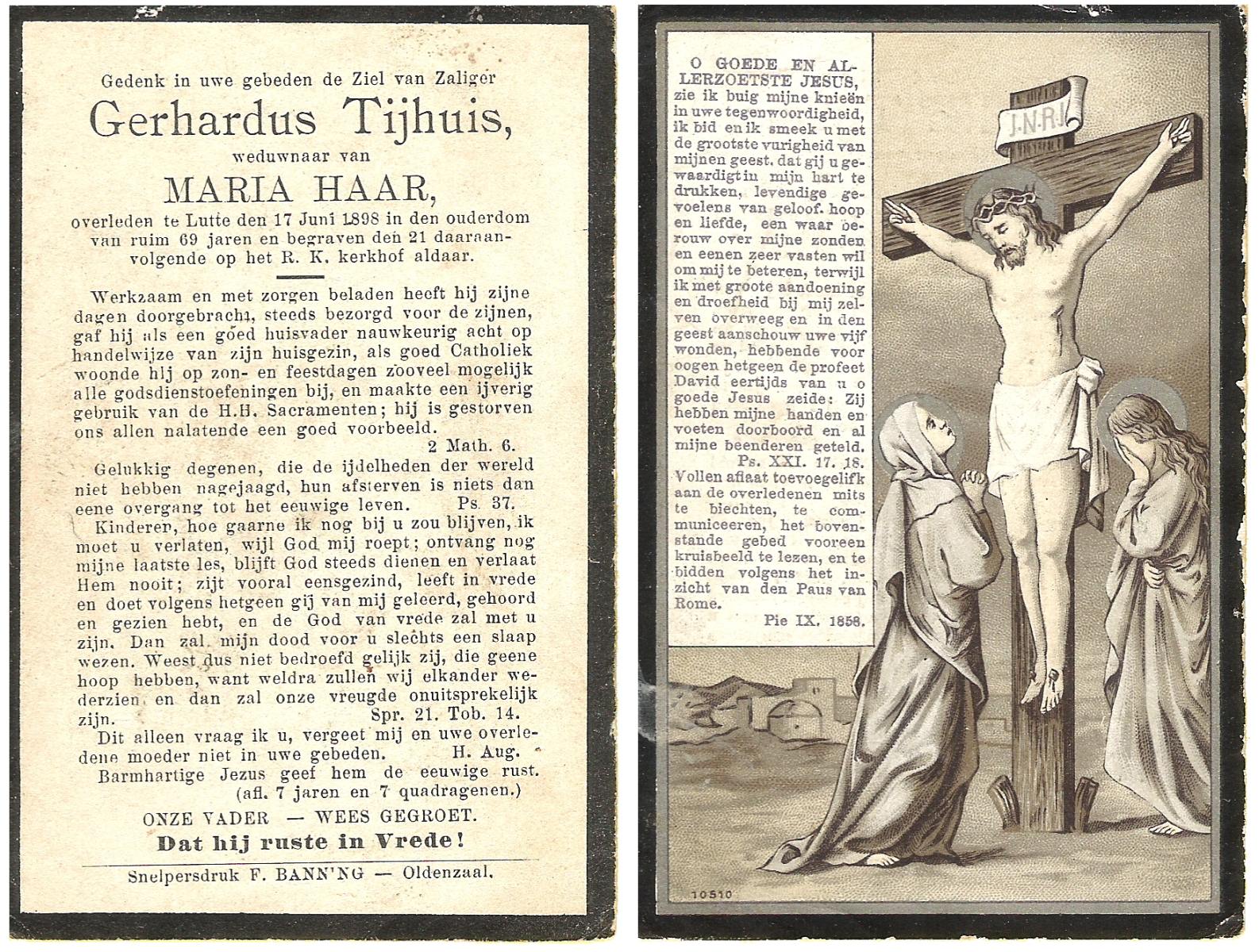 TIJHUIS, Gerhardus, geboren op -, overleden op 17-06-1898 te de Lutte op 69-jarige leeftijd, begraven op 21-06-1898 te de Lutte R.K.kerkhof.