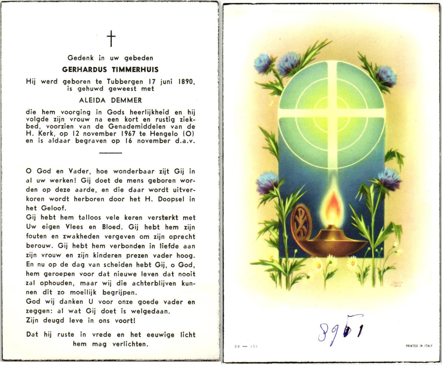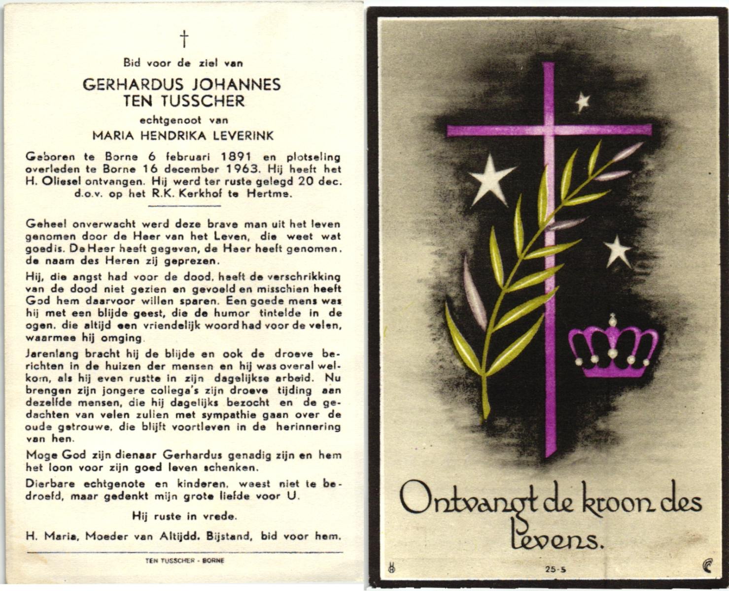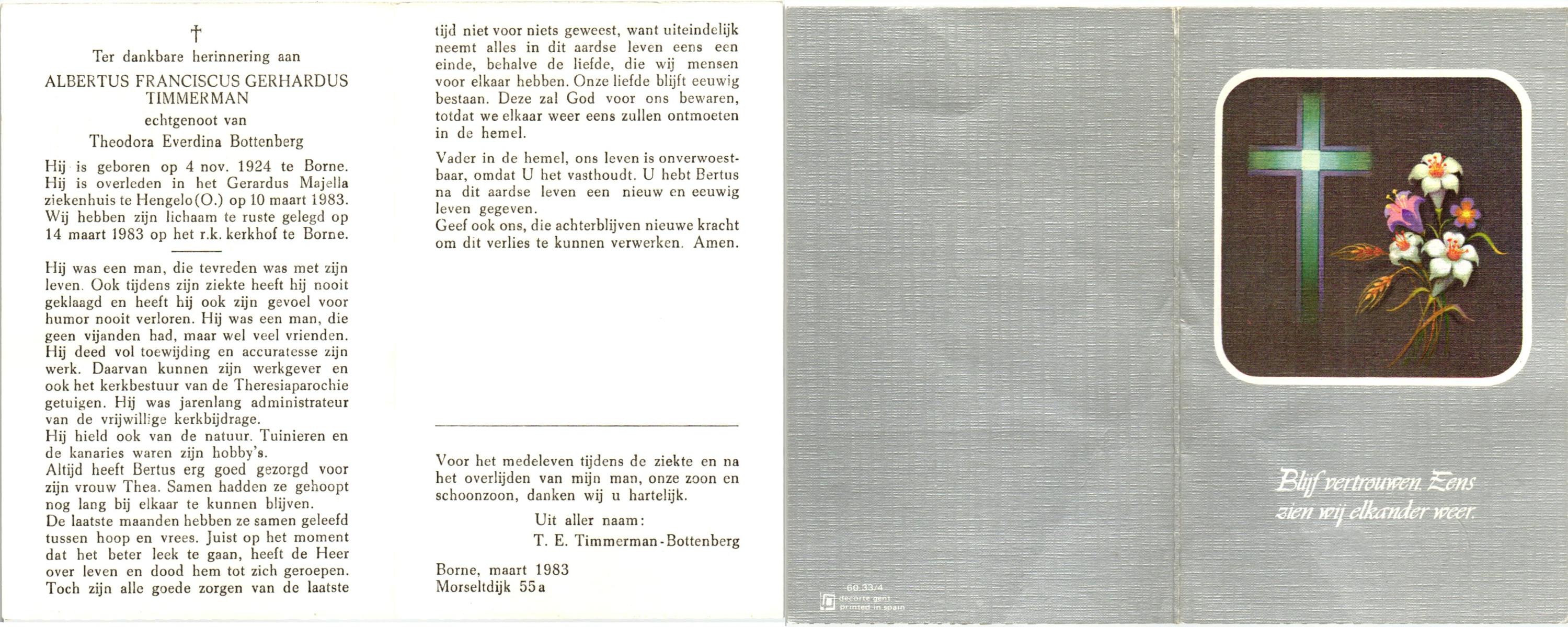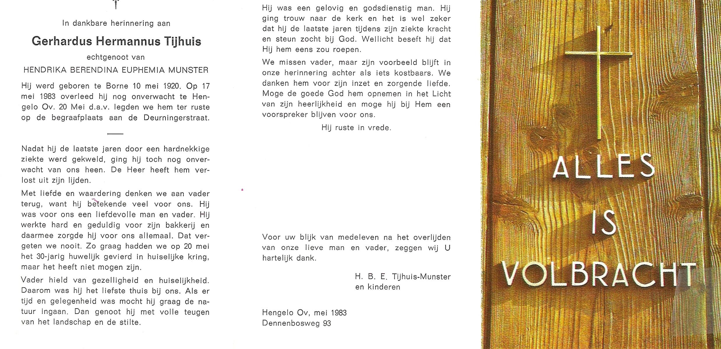 TIJHUIS, Gerhardus Hermannus, geboren op 10-5-1920 te Borne, overleden op 17-5-1983 te Hengelo (Ov.) op 63-jarige leeftijd, begraven op 20-5-1983 te Hengelo (Ov.).