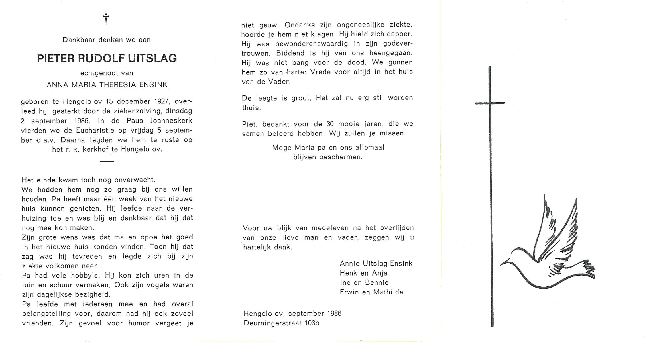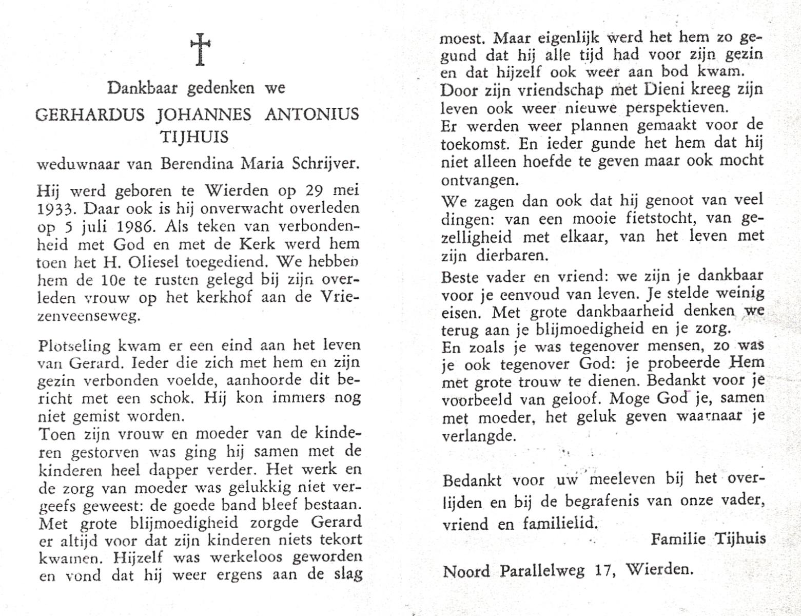 TIJHUIS, Gerhardus Johannes Antonius, geboren op 29-5-1933 te Wierden, overleden op 5-7-1986 op 53-jarige leeftijd, begraven op 10-7-1986 te Wierden.