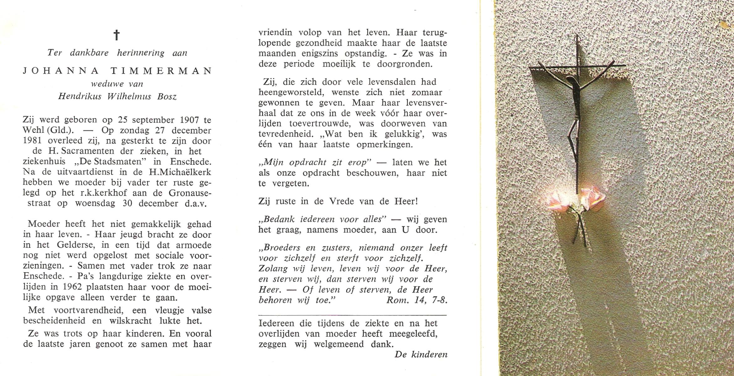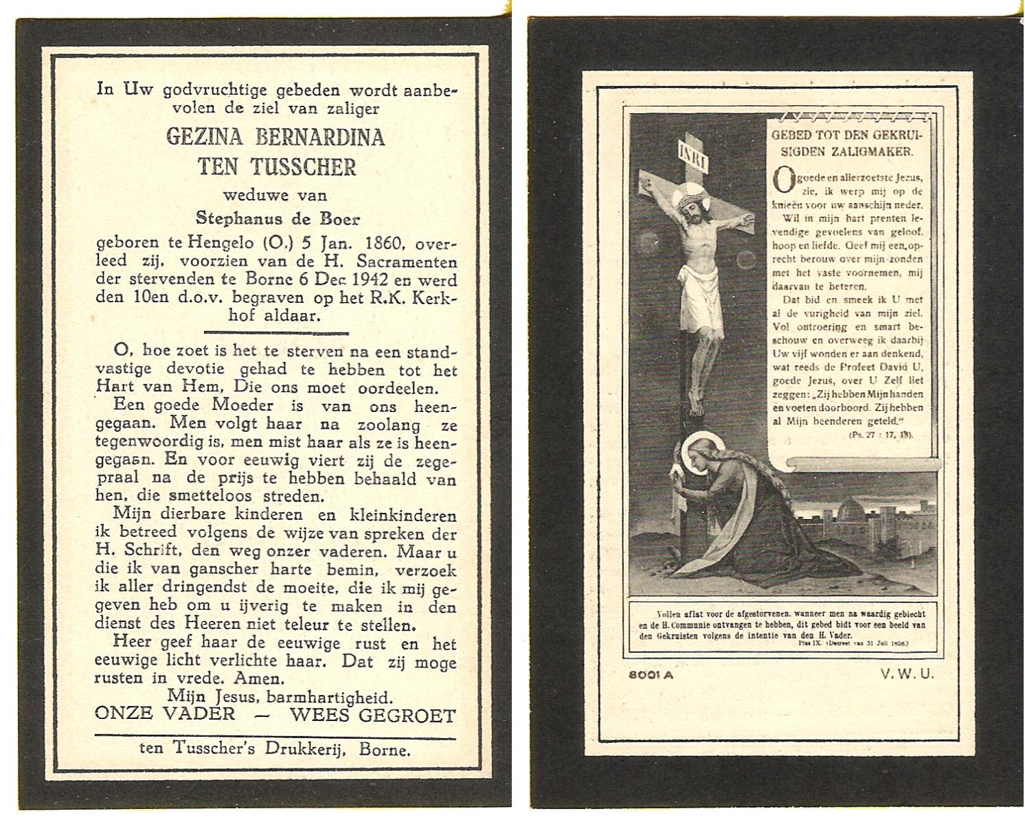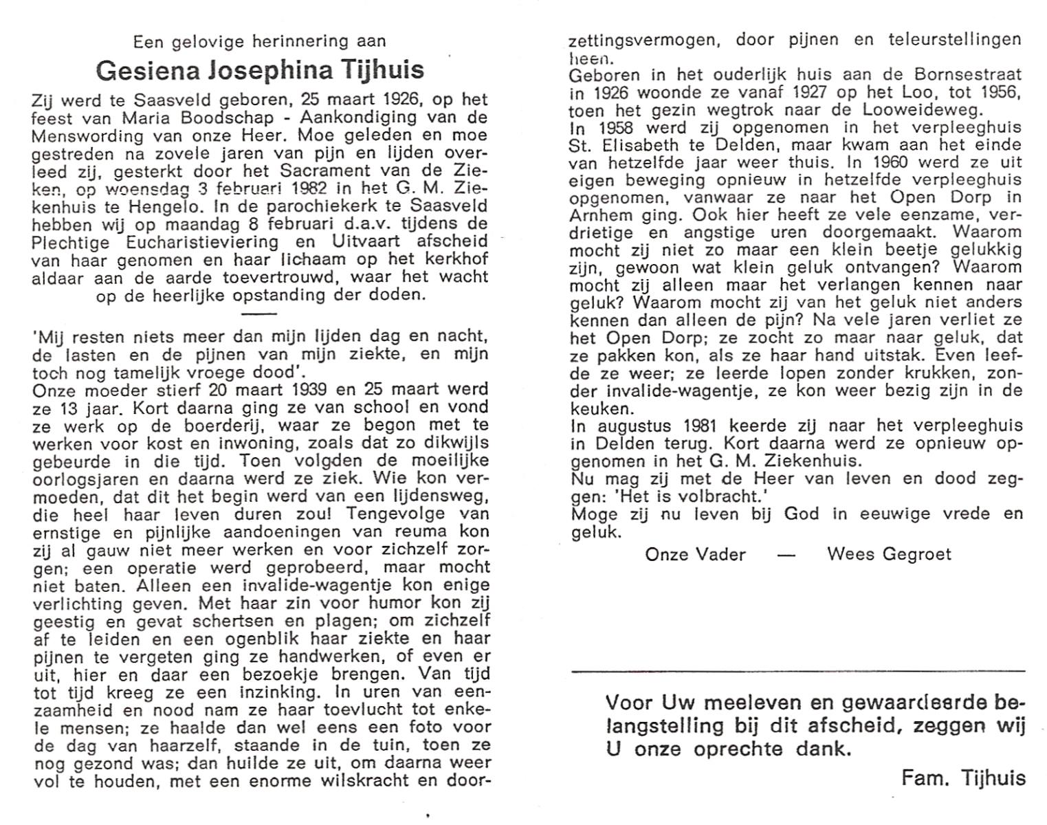 TIJHUIS, Gesiena Josephina, geboren op 25-3-1926 te Saasveld, overleden op 3-2-1982 te Hengelo (Ov.) op 55-jarige leeftijd, begraven op 8-2-1982.