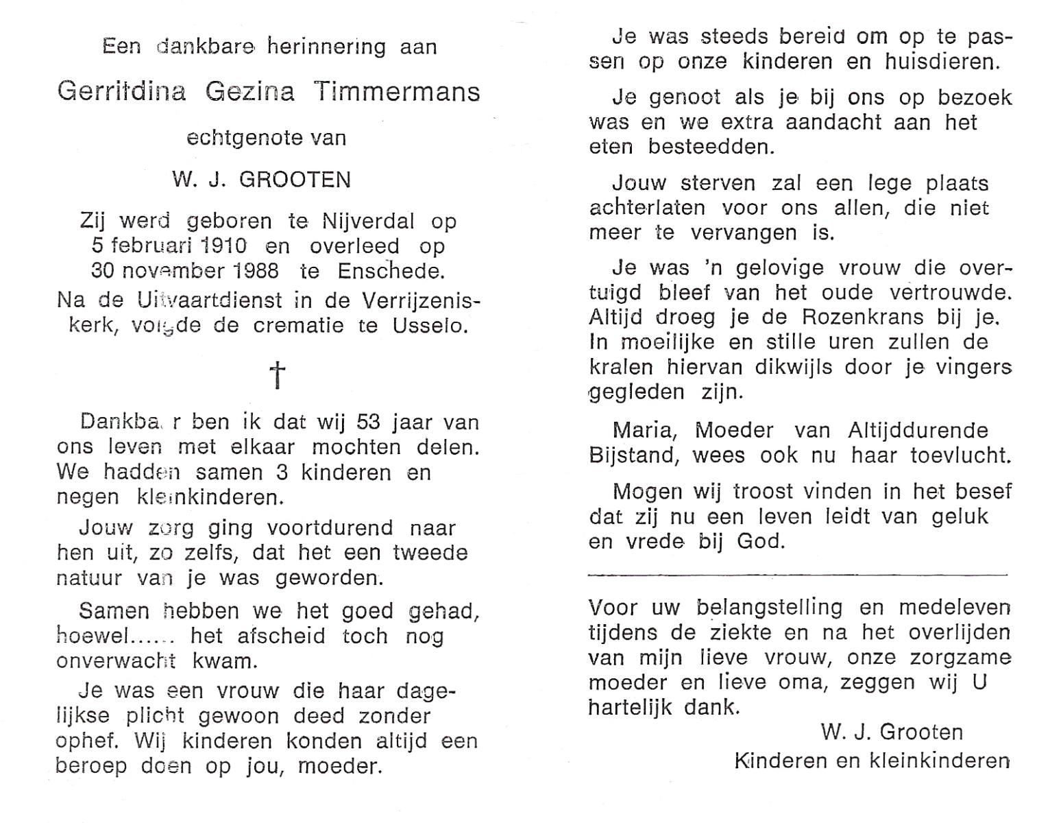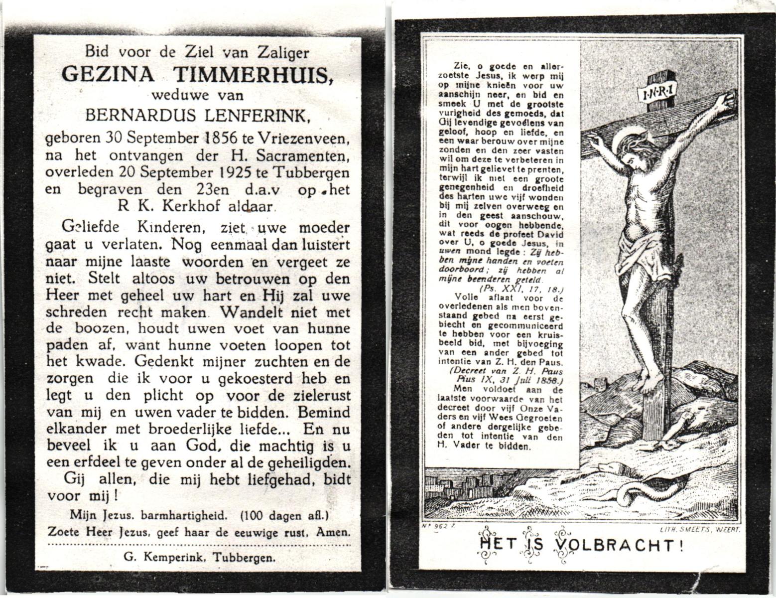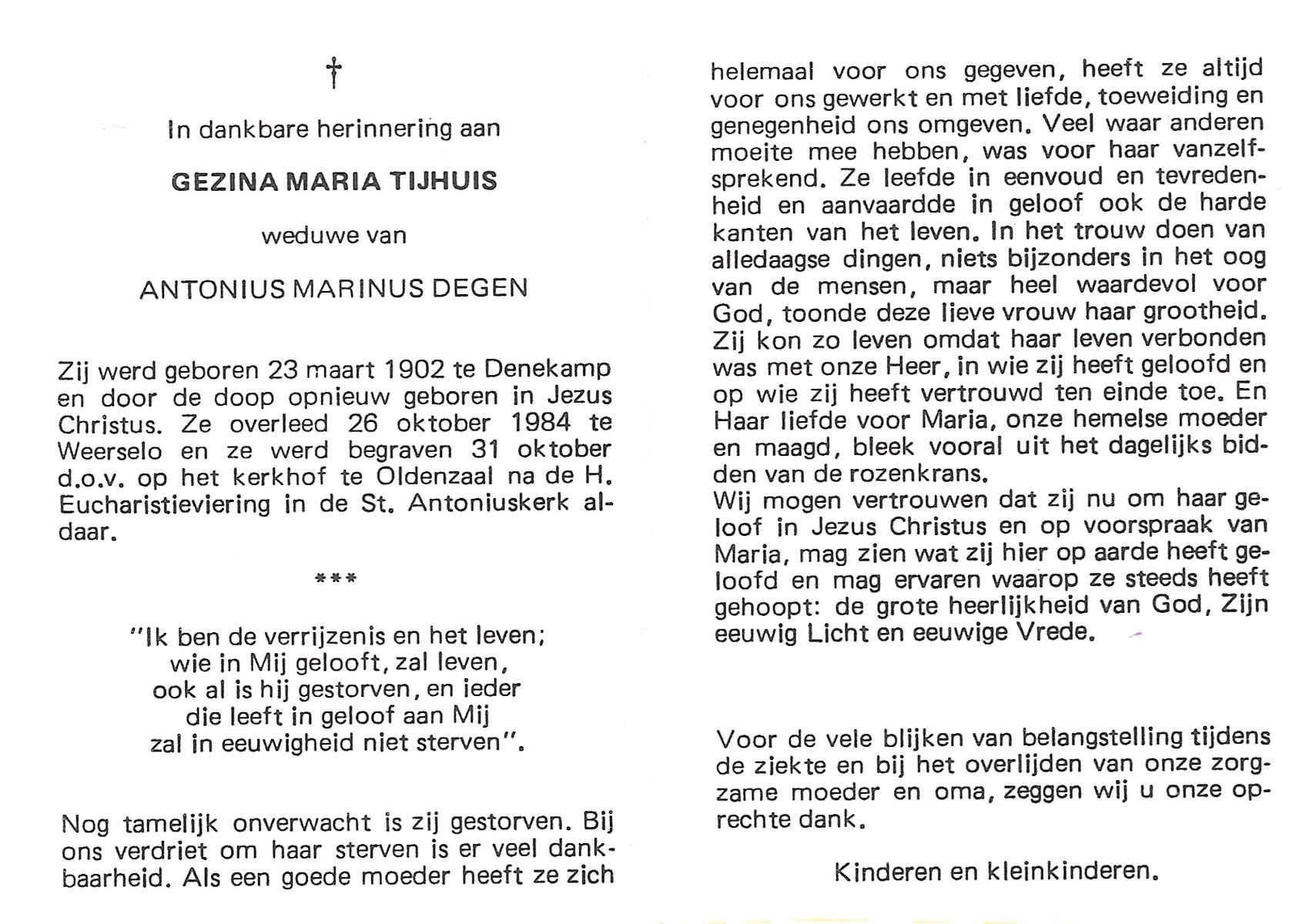 TIJHUIS, Gezina Maria, geboren op 23-3-1902 te Denekamp, overleden op 26-10-1984 te Weerselo op 87-jarige leeftijd, begraven op 31-10-1984 te Oldenzaal.
