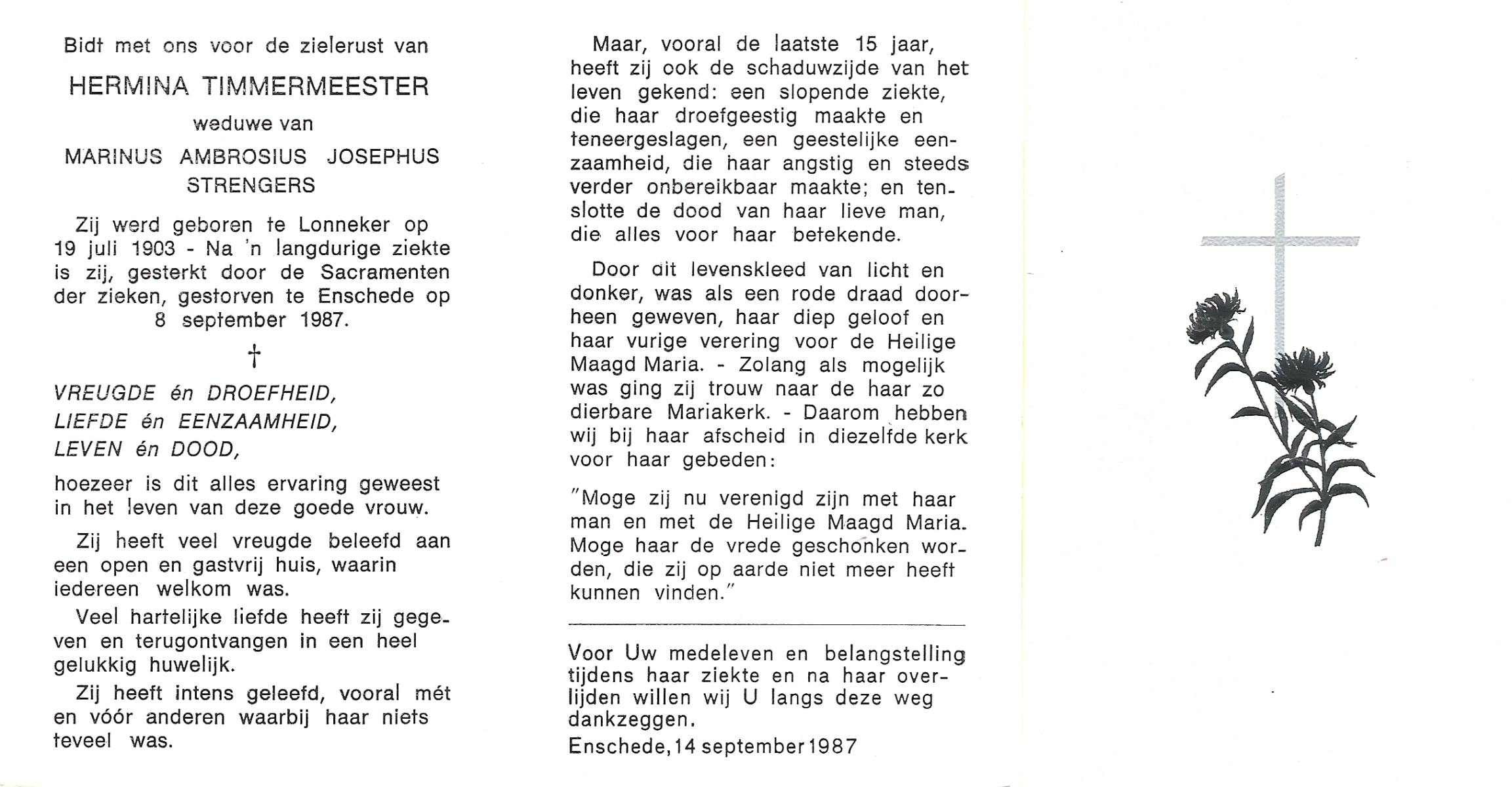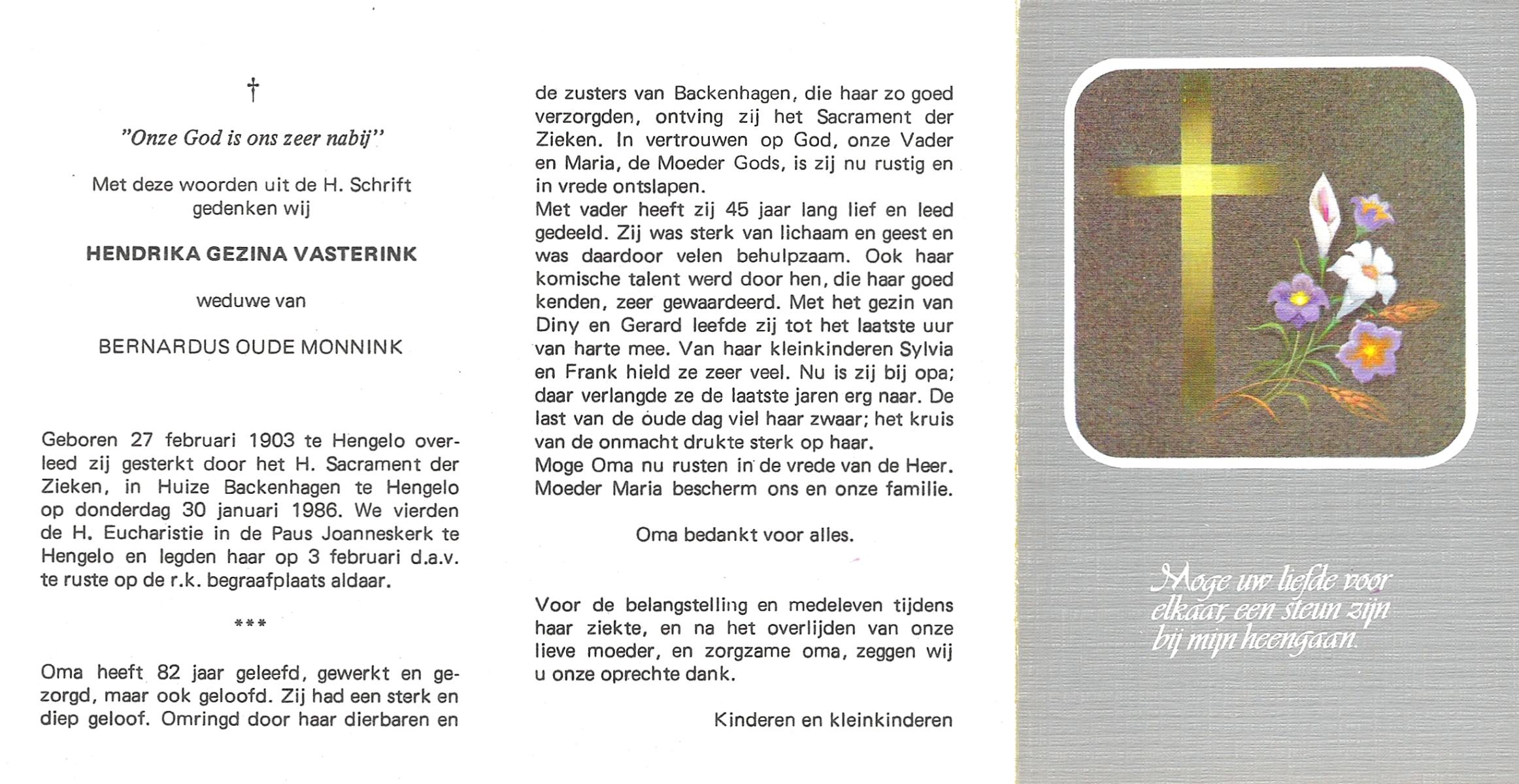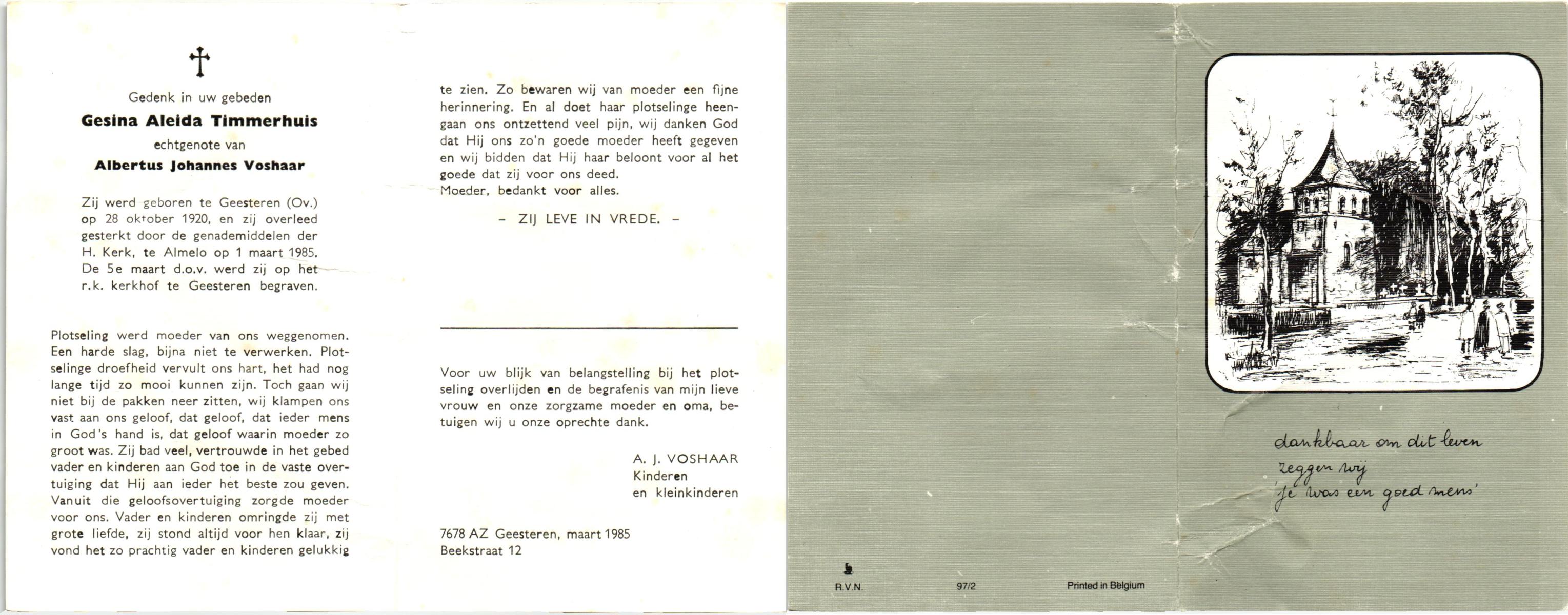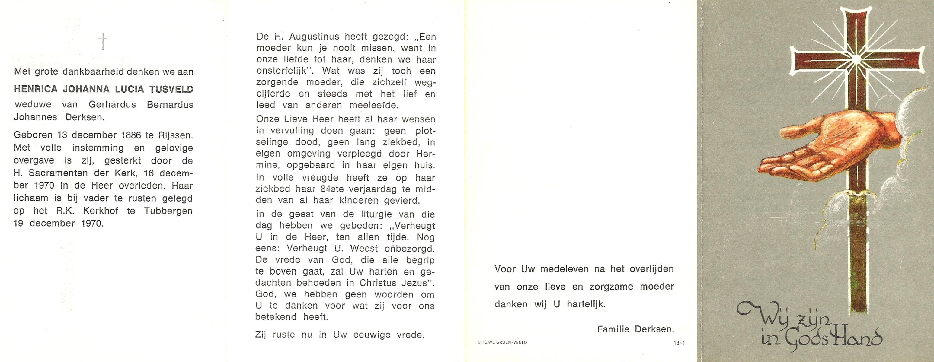 TIJHUIS, Gezina Maria, geboren op 23-3-1902 te Denekamp, overleden op 26-10-1984 te Weerselo op 87-jarige leeftijd, begraven op 31-10-1984 te Oldenzaal.