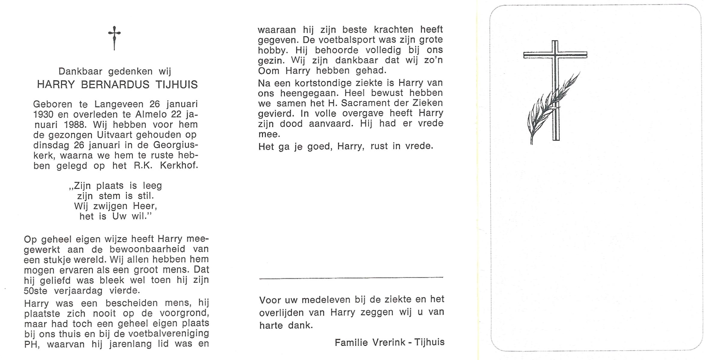 TIJHUIS, Harry Bernardus, geboren op 26-1-1930 te Langeveen, overleden op 22-1-1988 te Almelo op 57-jarige leeftijd, begraven op 26-1-1988 te Almelo R.K.Kerkhof.