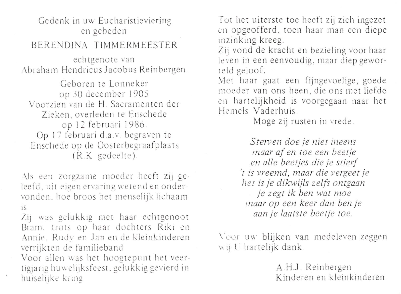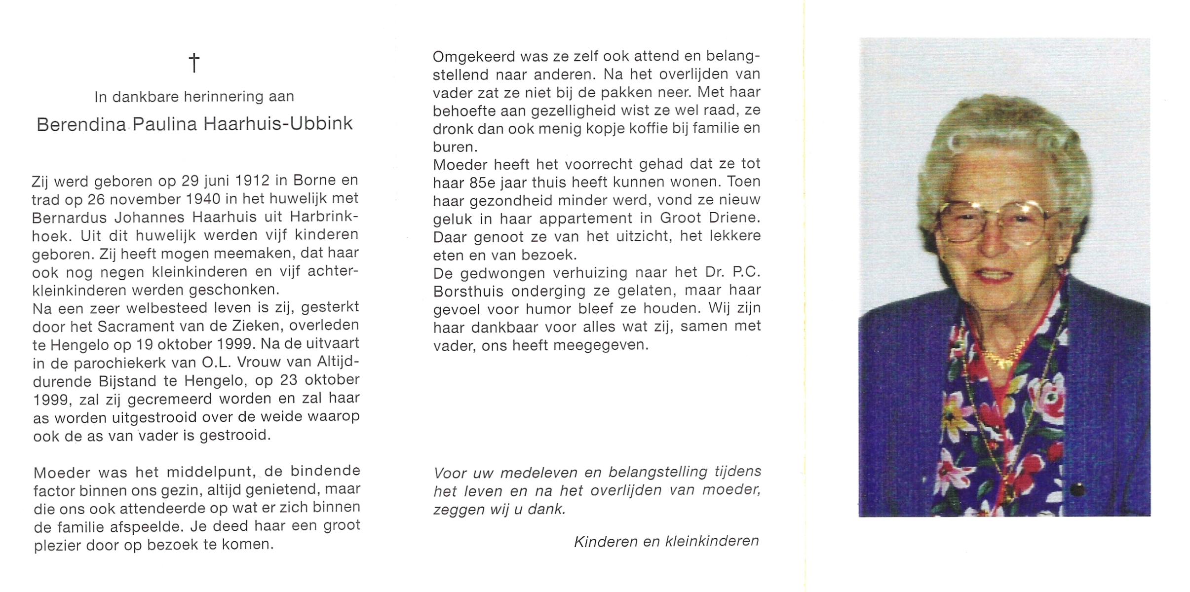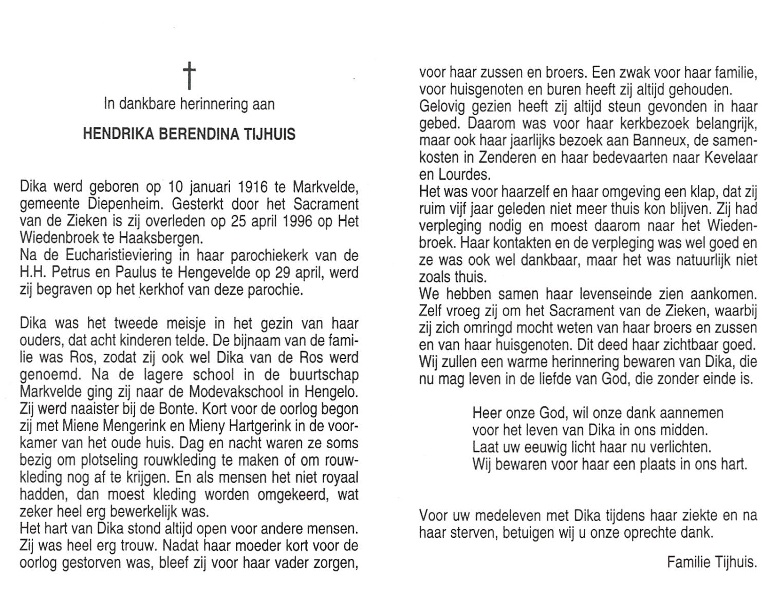 TIJHUIS, Hendrika Berendina (Dika), geboren op 10-1-1916 te Markvelde, Diepenheim, overleden op 25-4-1996 te Haaksbergen op 80-jarige leeftijd, begraven op 29-4-1996 te Hengevelde.