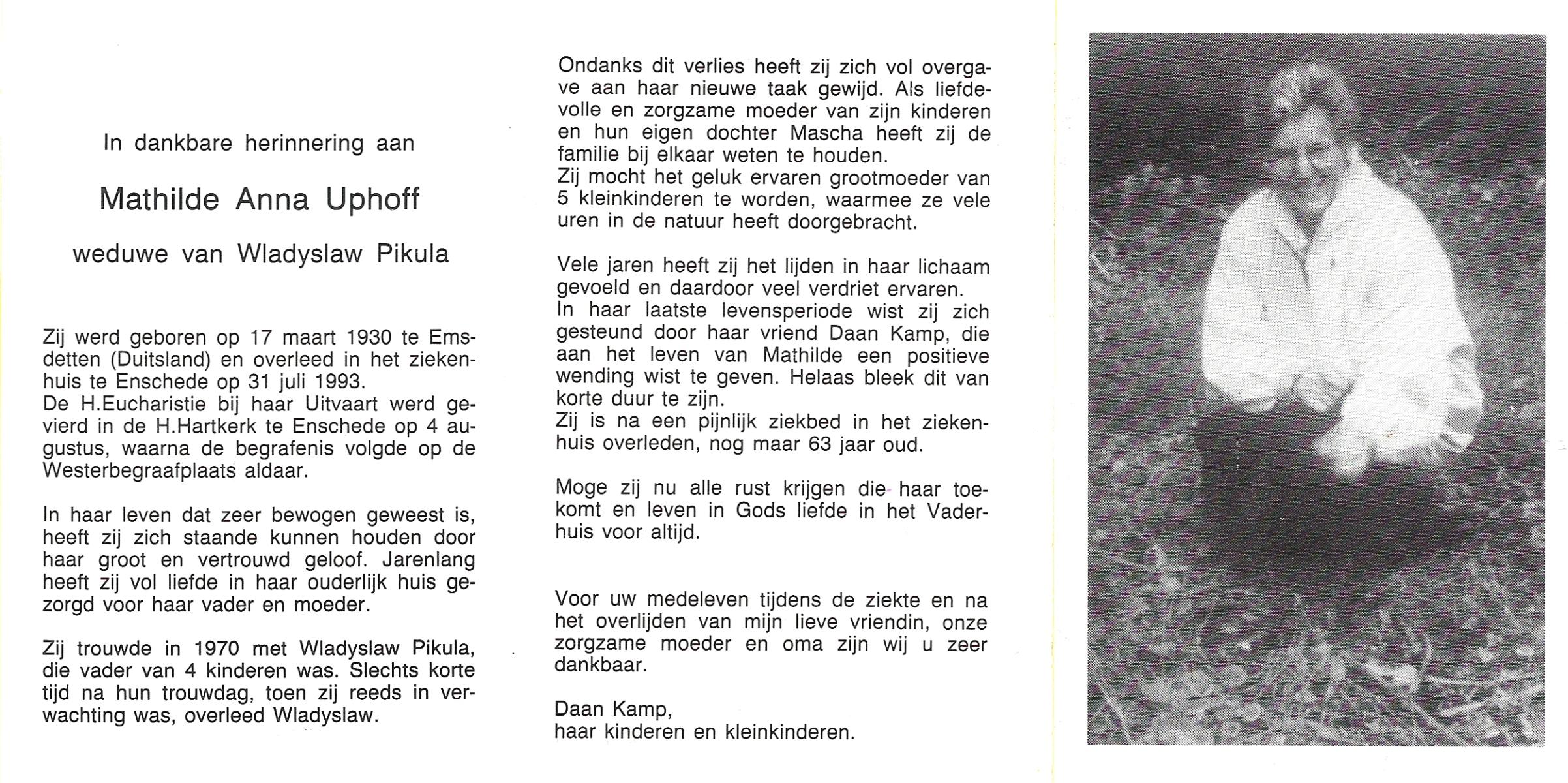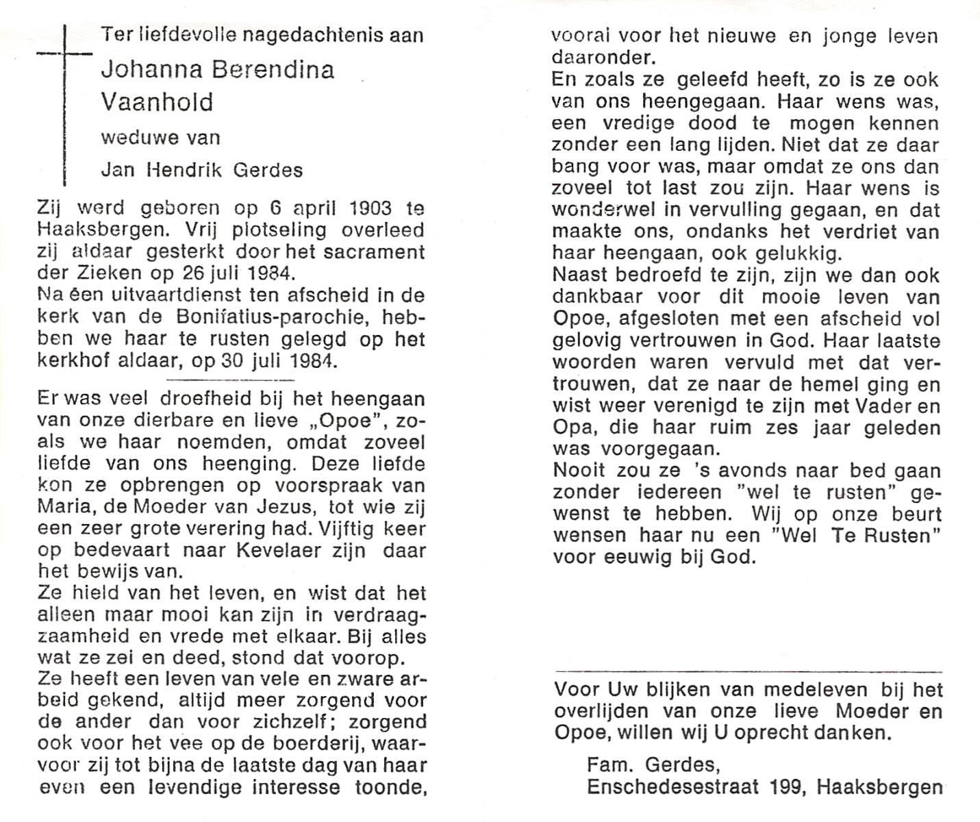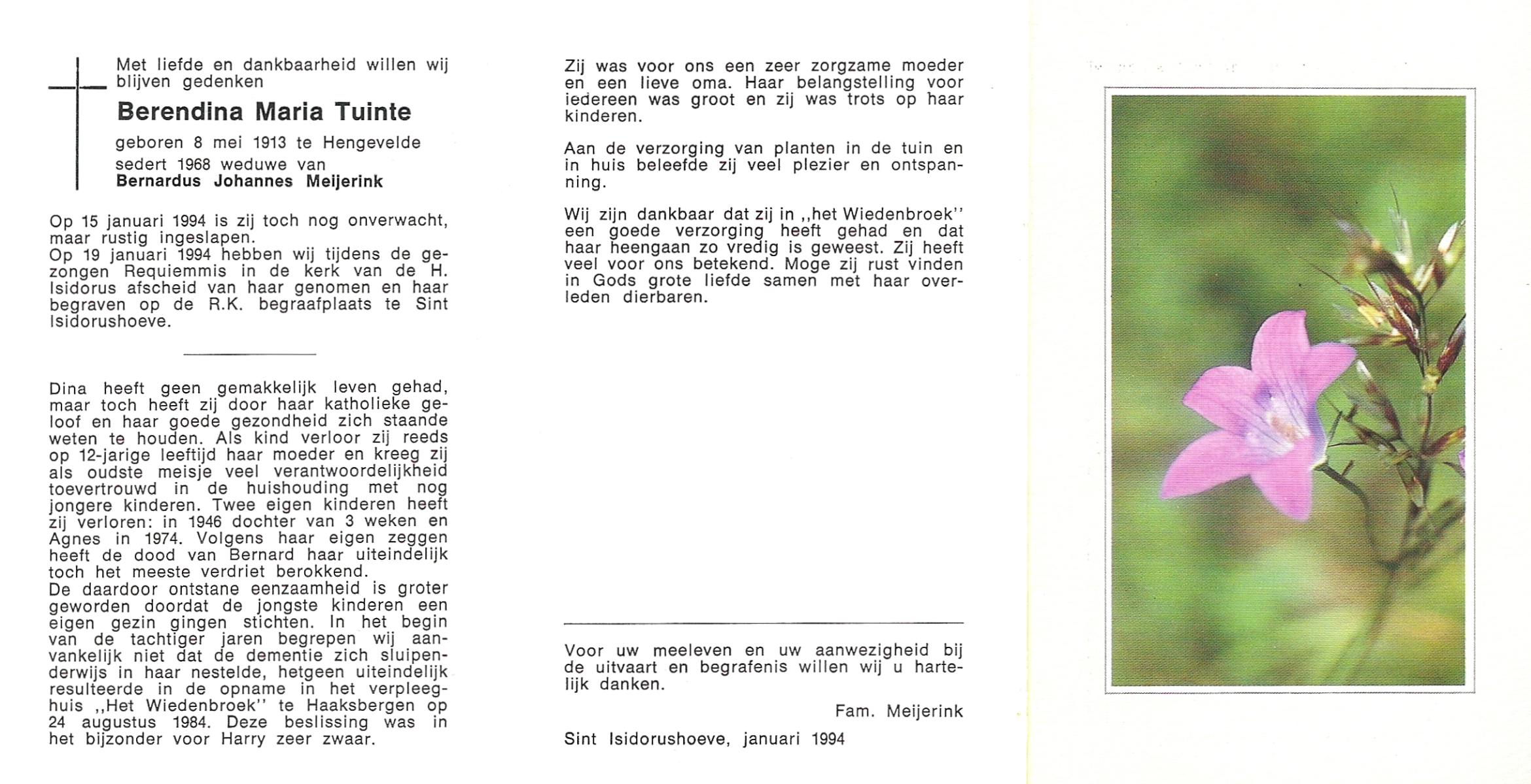 TIJHUIS, Hendrika Berendina (Dika), geboren op 10-1-1916 te Markvelde, Diepenheim, overleden op 25-4-1996 te Haaksbergen op 80-jarige leeftijd, begraven op 29-4-1996 te Hengevelde.